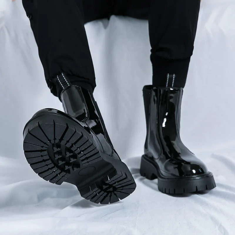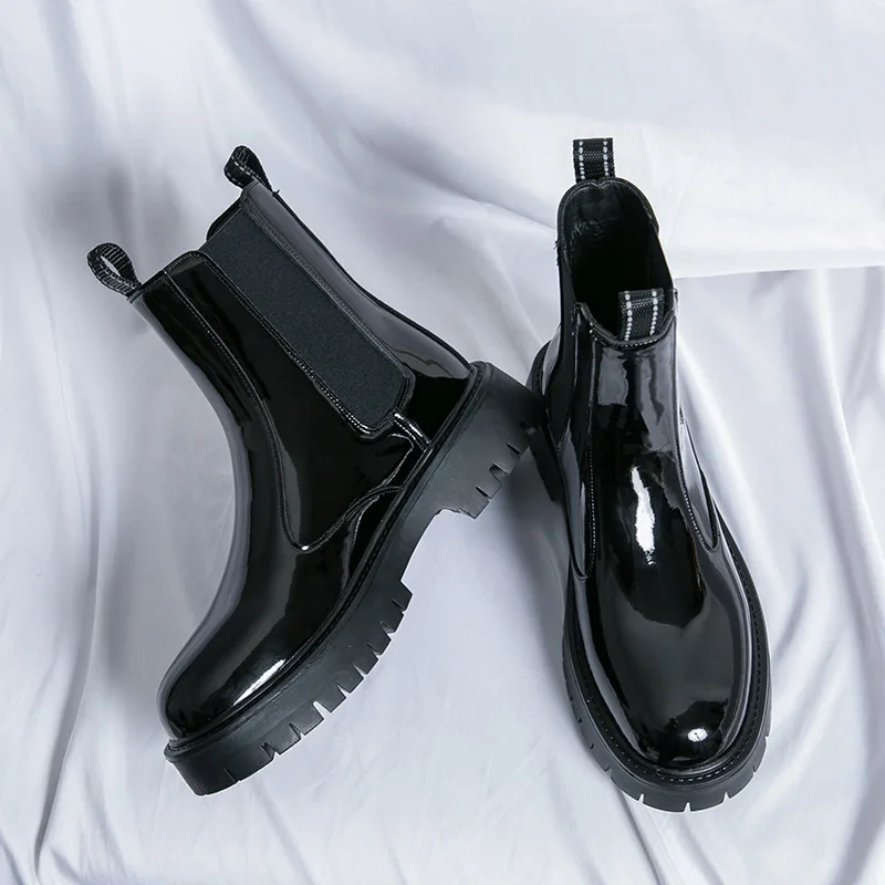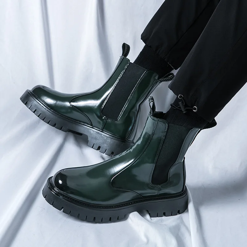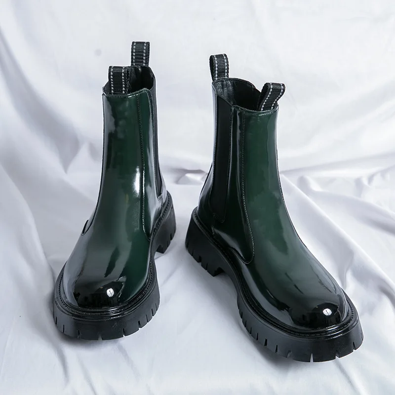 Classy Design Latest Production Green Patent Leather Platform Ankle Boots for Men Slip on Dress Formal Shoes All Season
