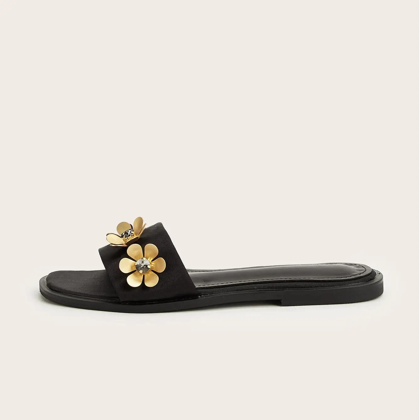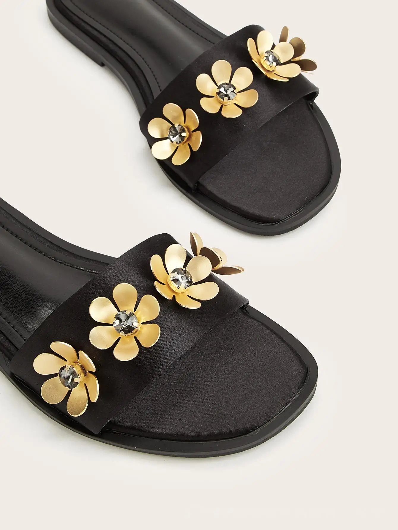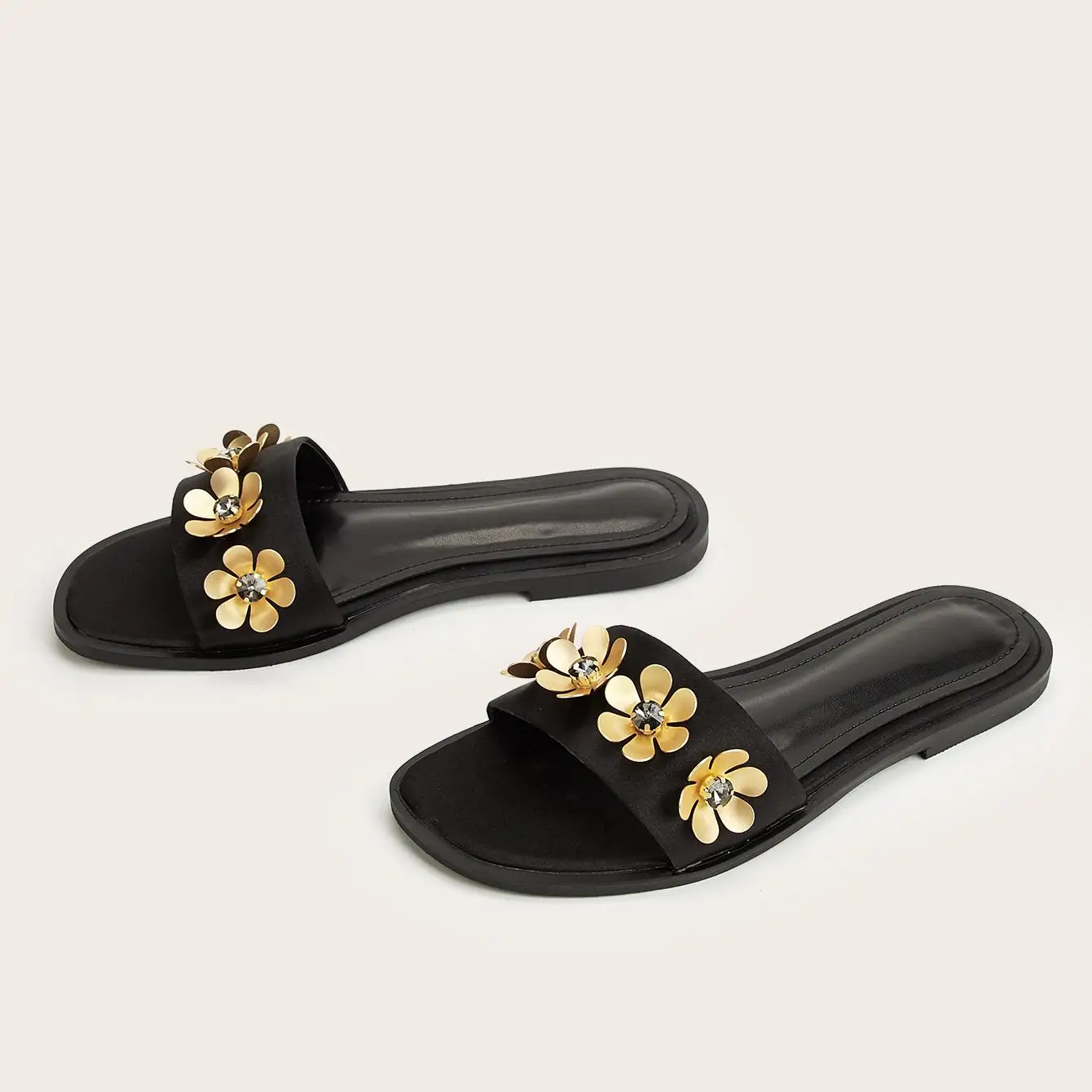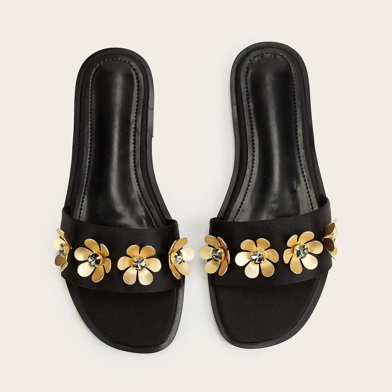 BUSY GIRL CXX129 Ladies Flat Sandals Women's Black Glitter Slide Sandals Embellished with Gold Flower Daily Plus Size Beach