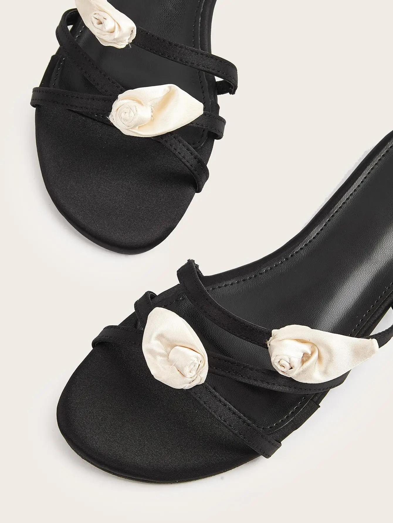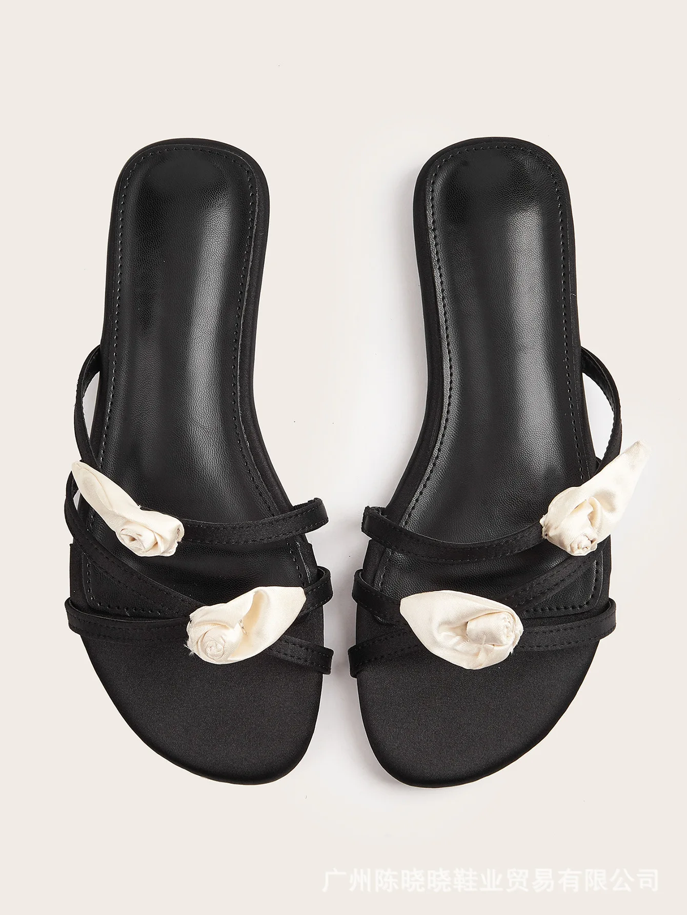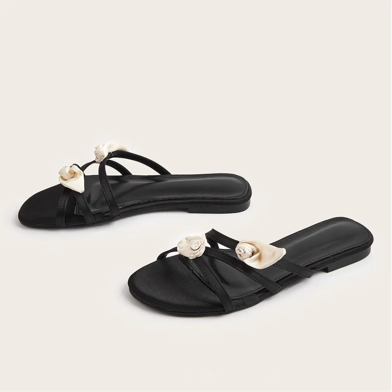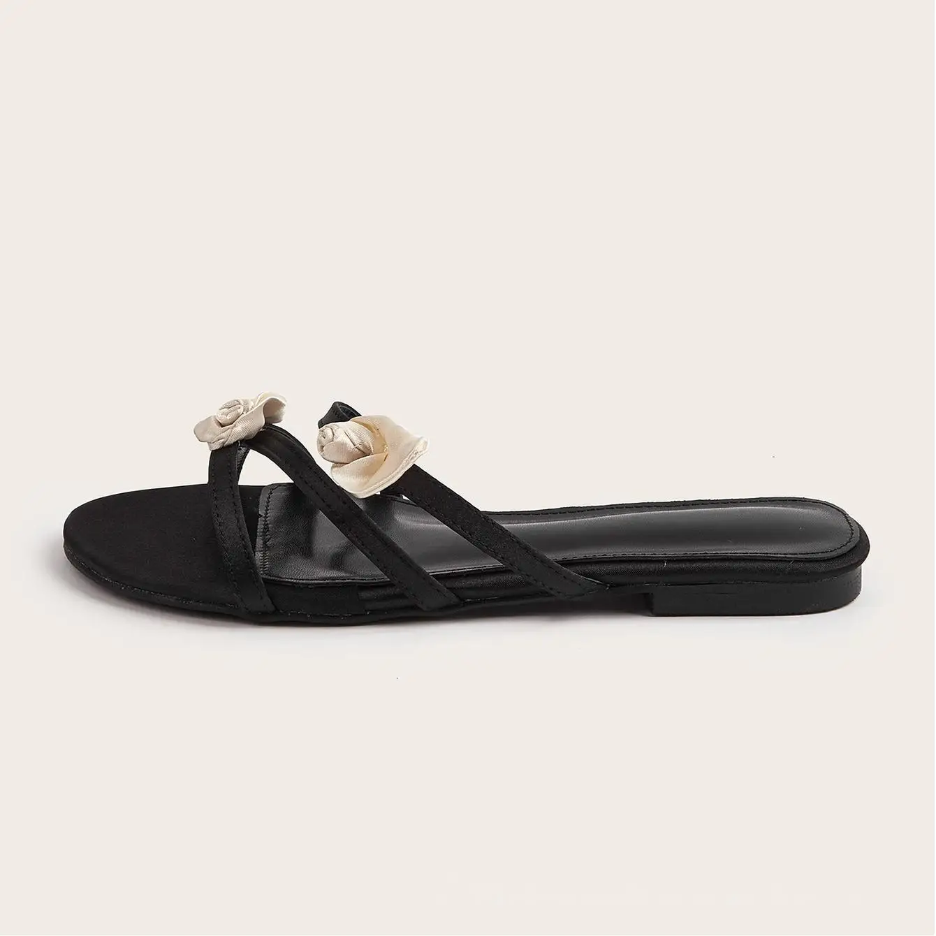 BUSY GIRL CXX131 Flat Sandals for Women Black Women's Slide Sandals with White Satin Rose Comfortable and Elegant for Summer