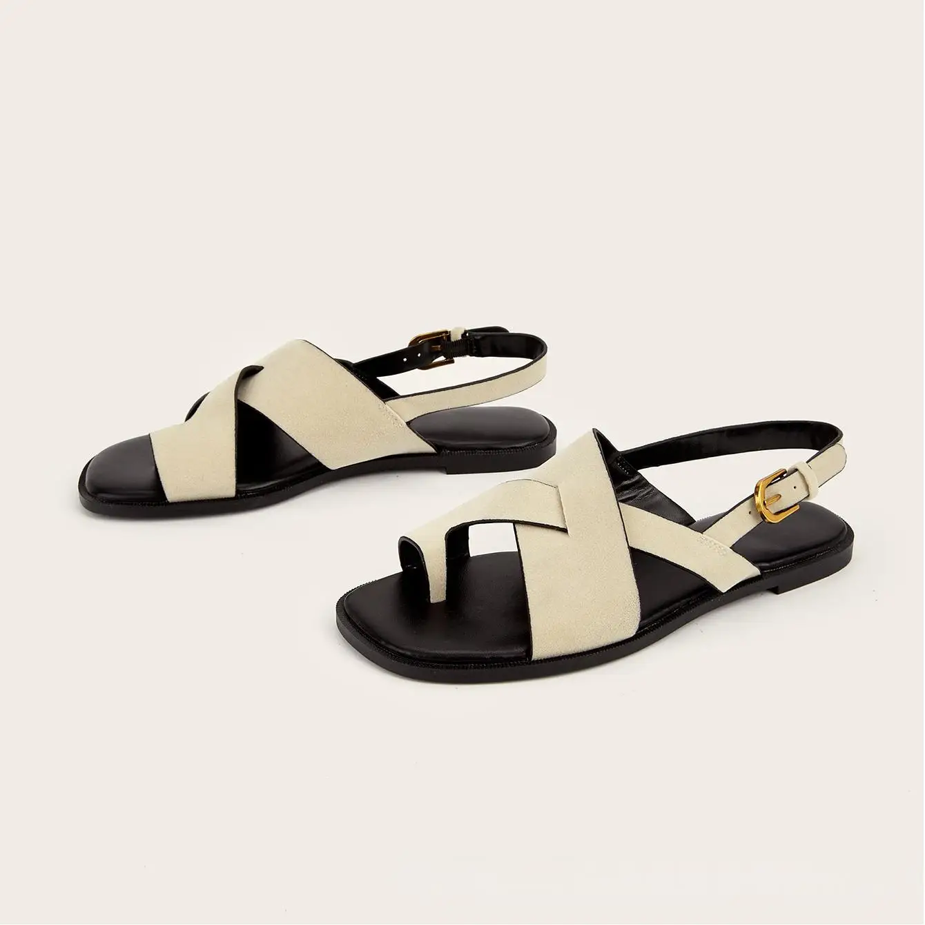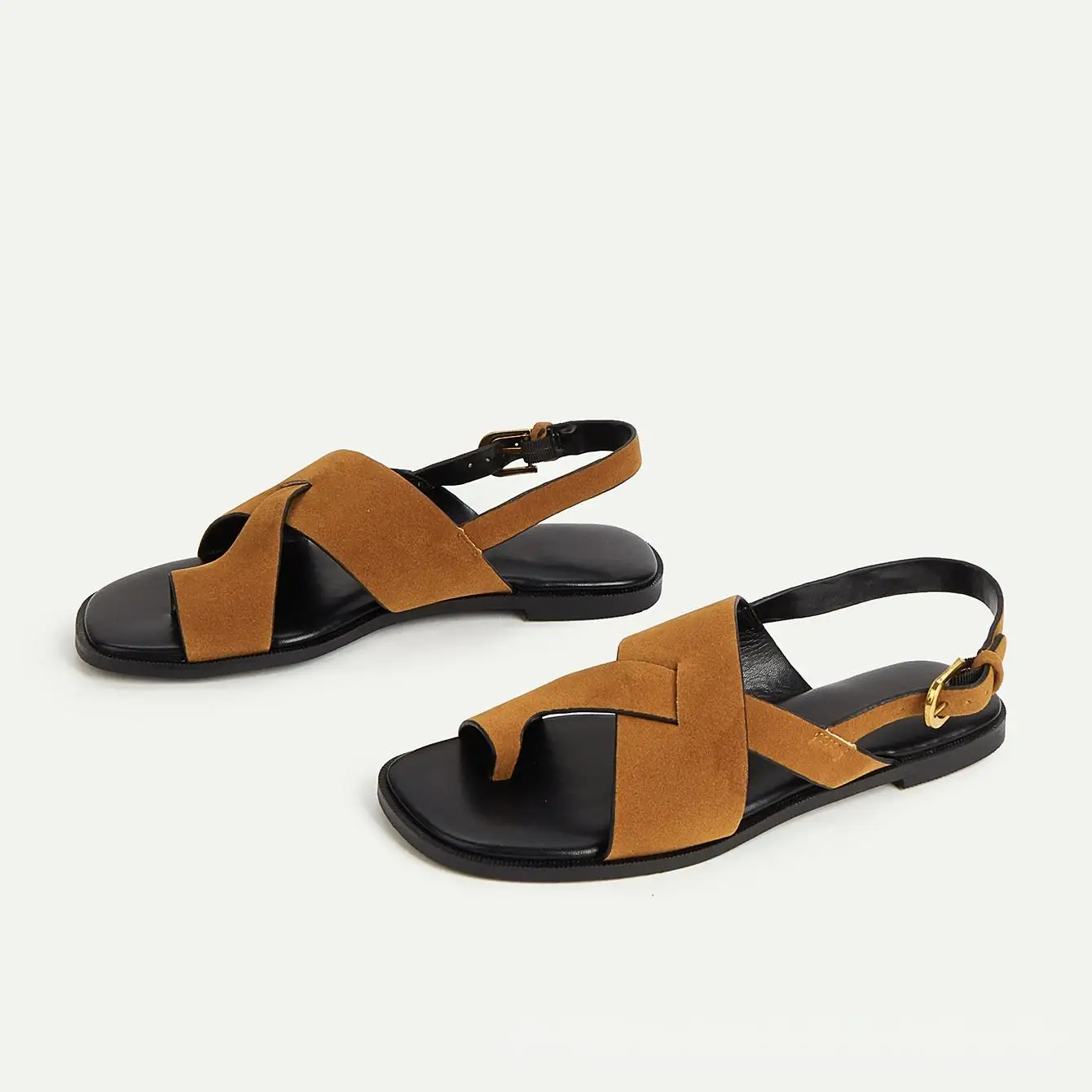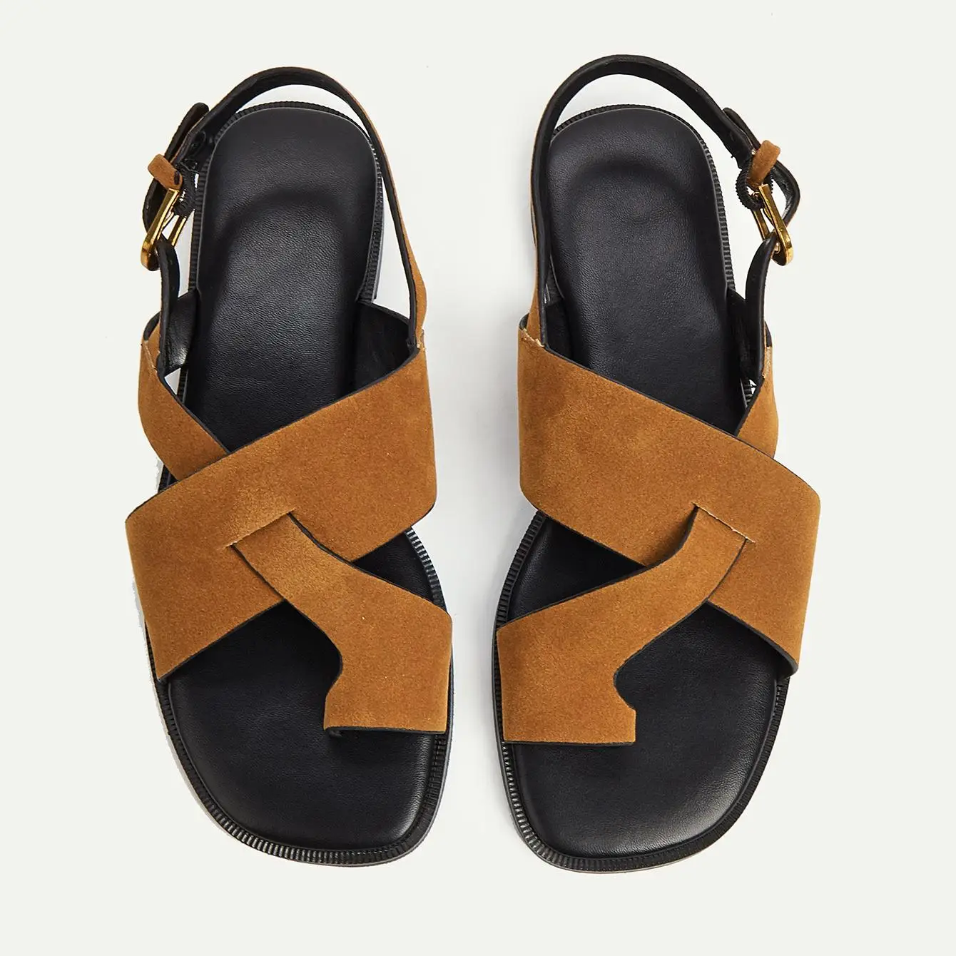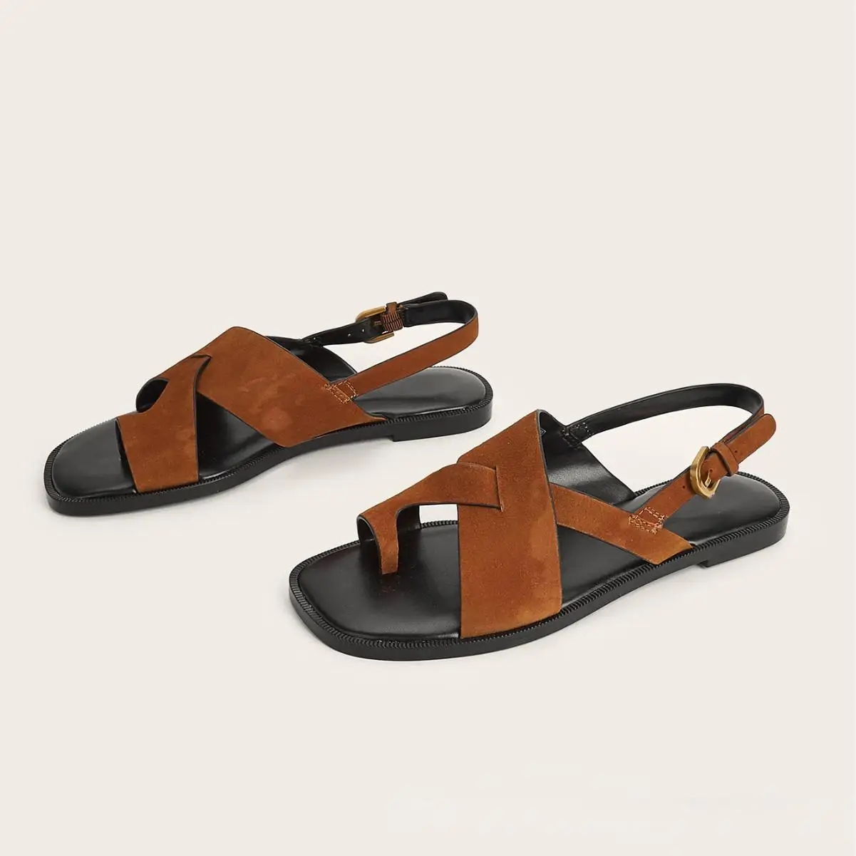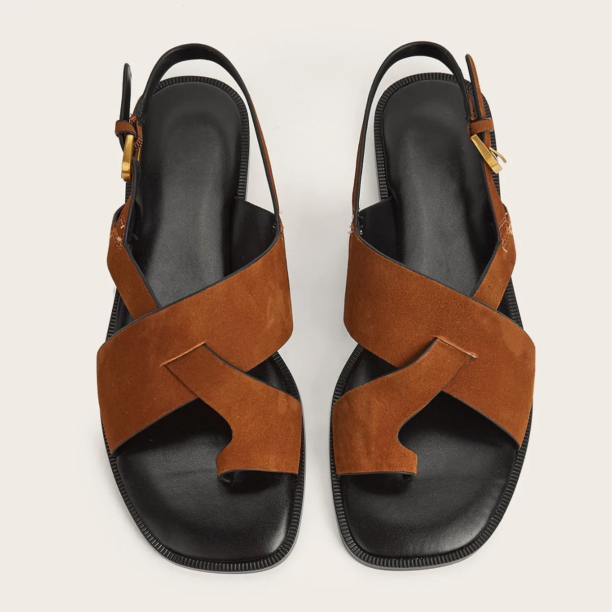 BUSY GIRL CXX134 Lighted Flat Sandals Women's Brown Suede Cross Strap Toe Post Sandals with Ankle Strap Buckle Summer Outdoor