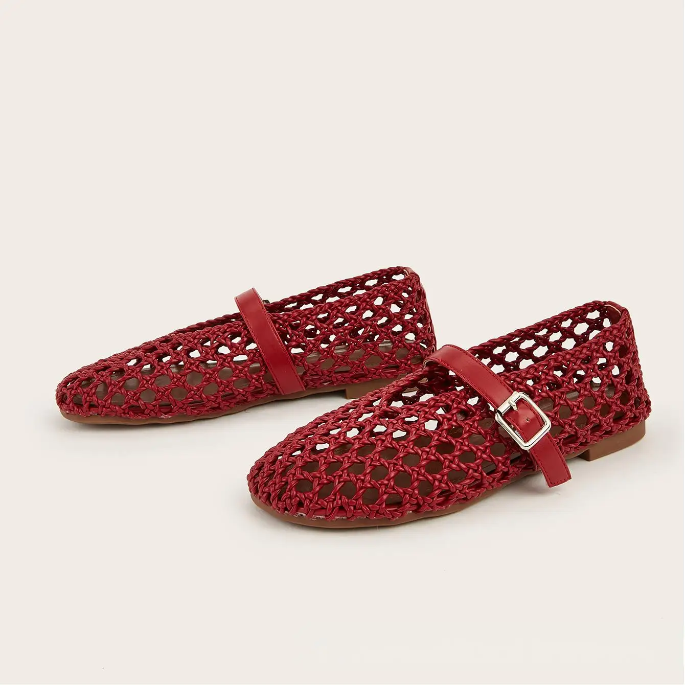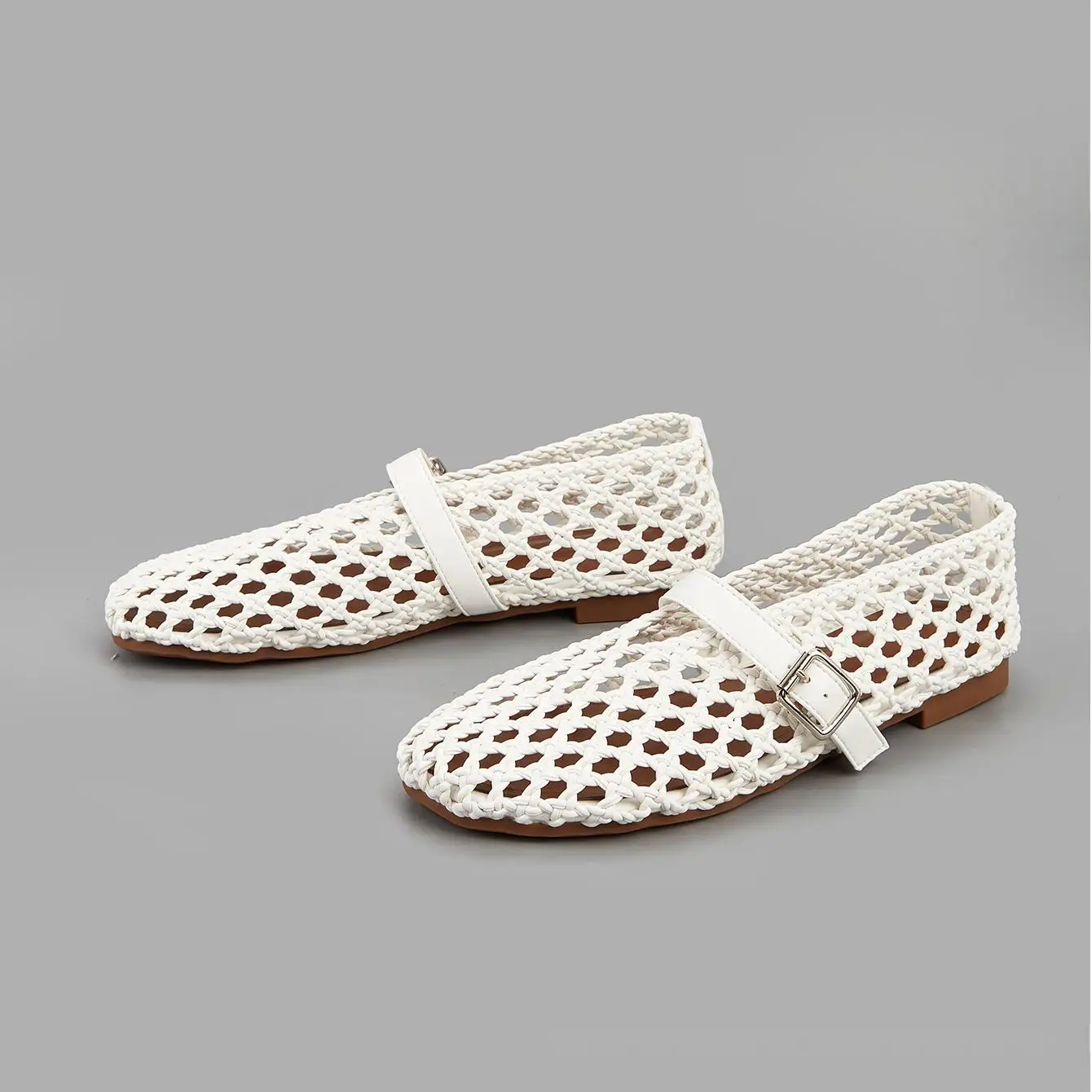 BUSY GIRL CXX141 Ladies Flat Sandals Women's Brown Crochet Mary Jane Flats Breathable Hollow Out Sandals Buckle Strap Comfort