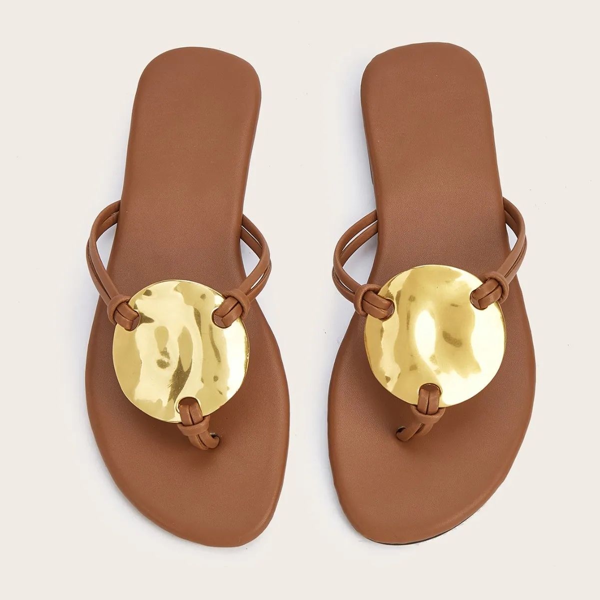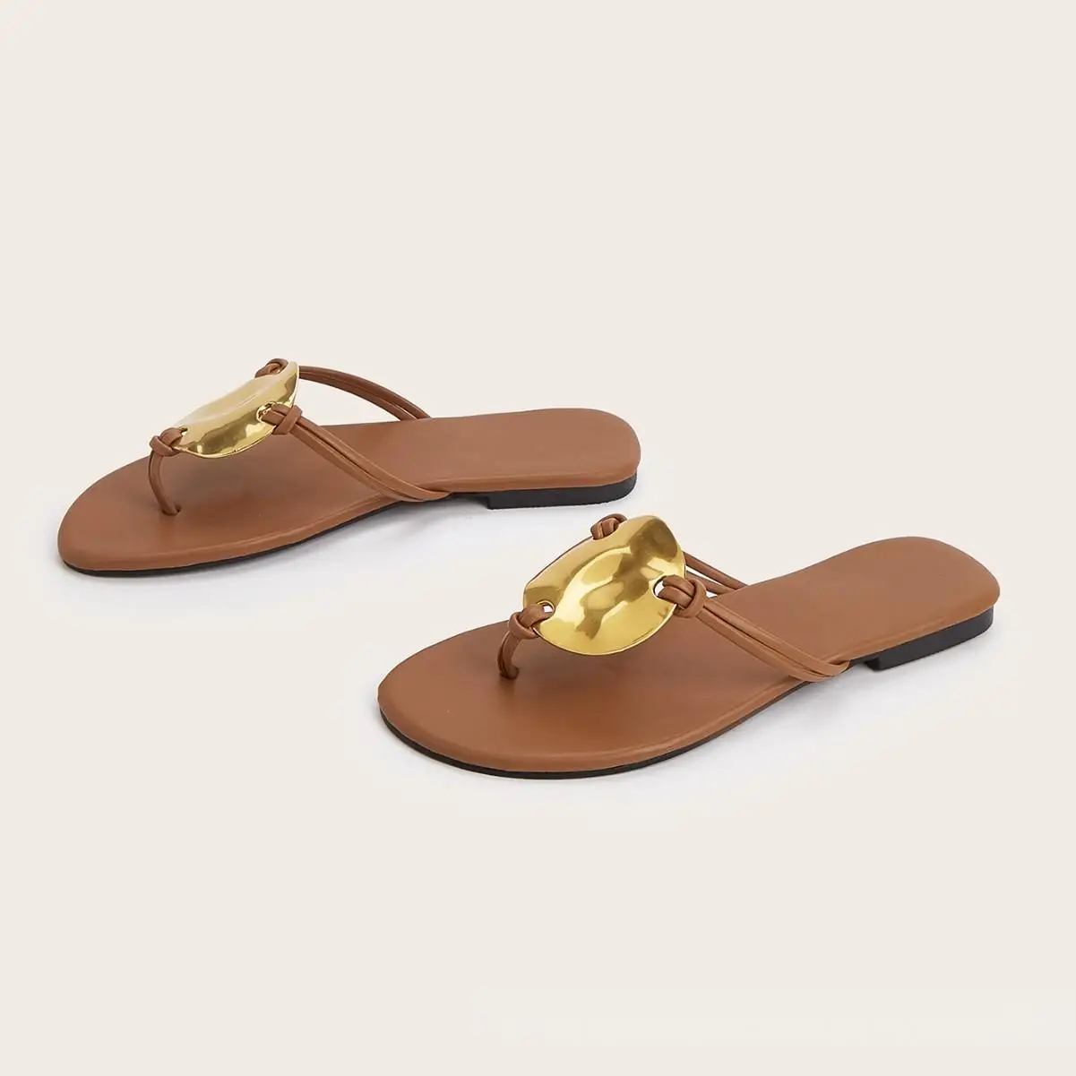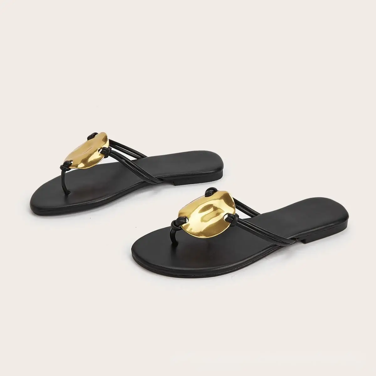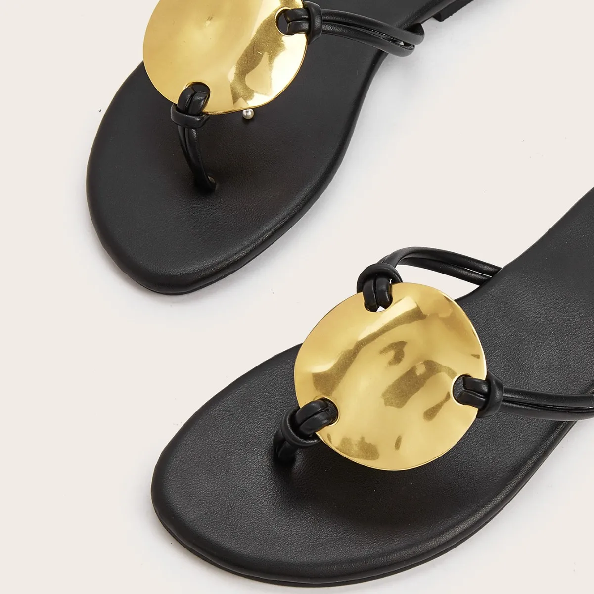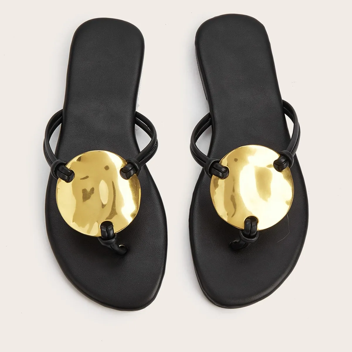 BUSY GIRL CXX159 Ladies Flat Sandals Women's Black Flip Flop Sandals with Large Gold Decor Women Shoes Casual Slippers Outdoor