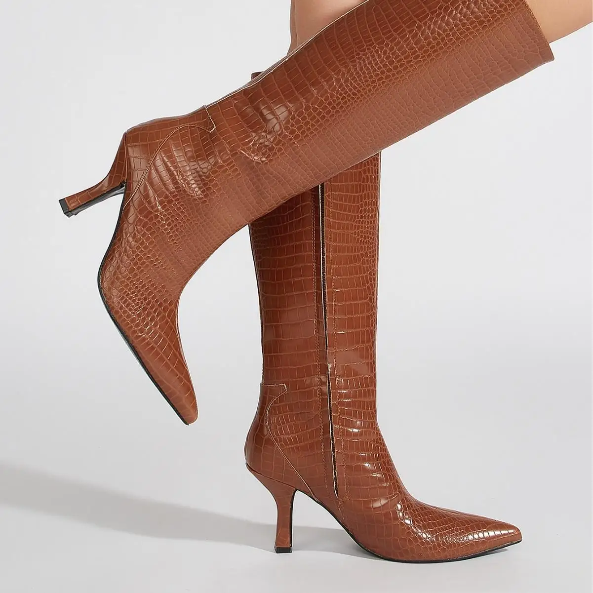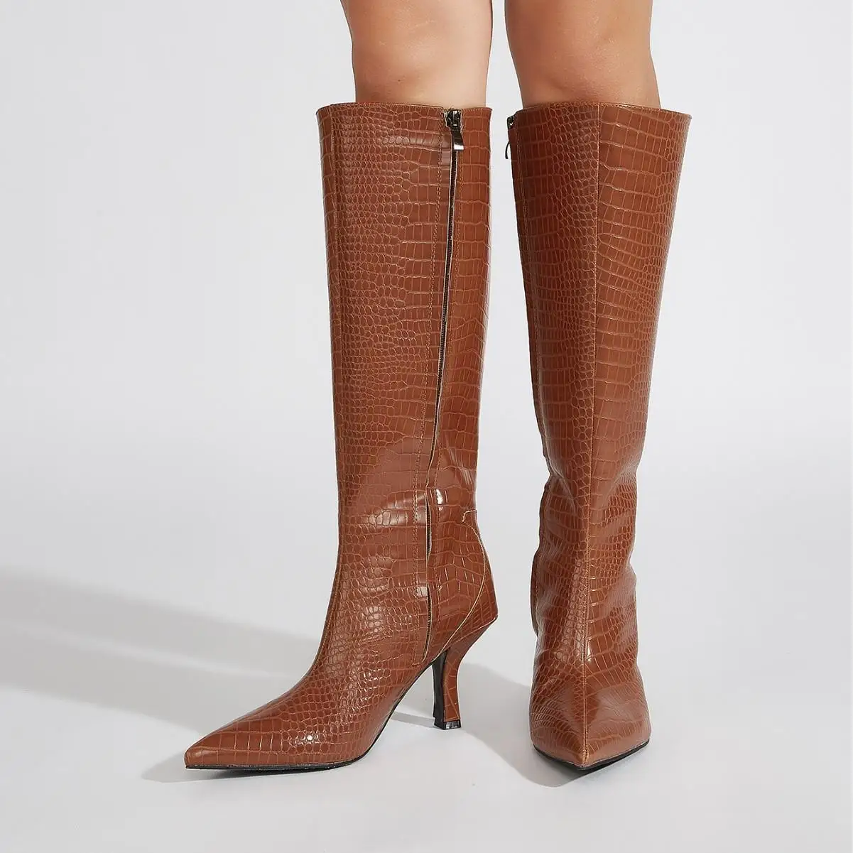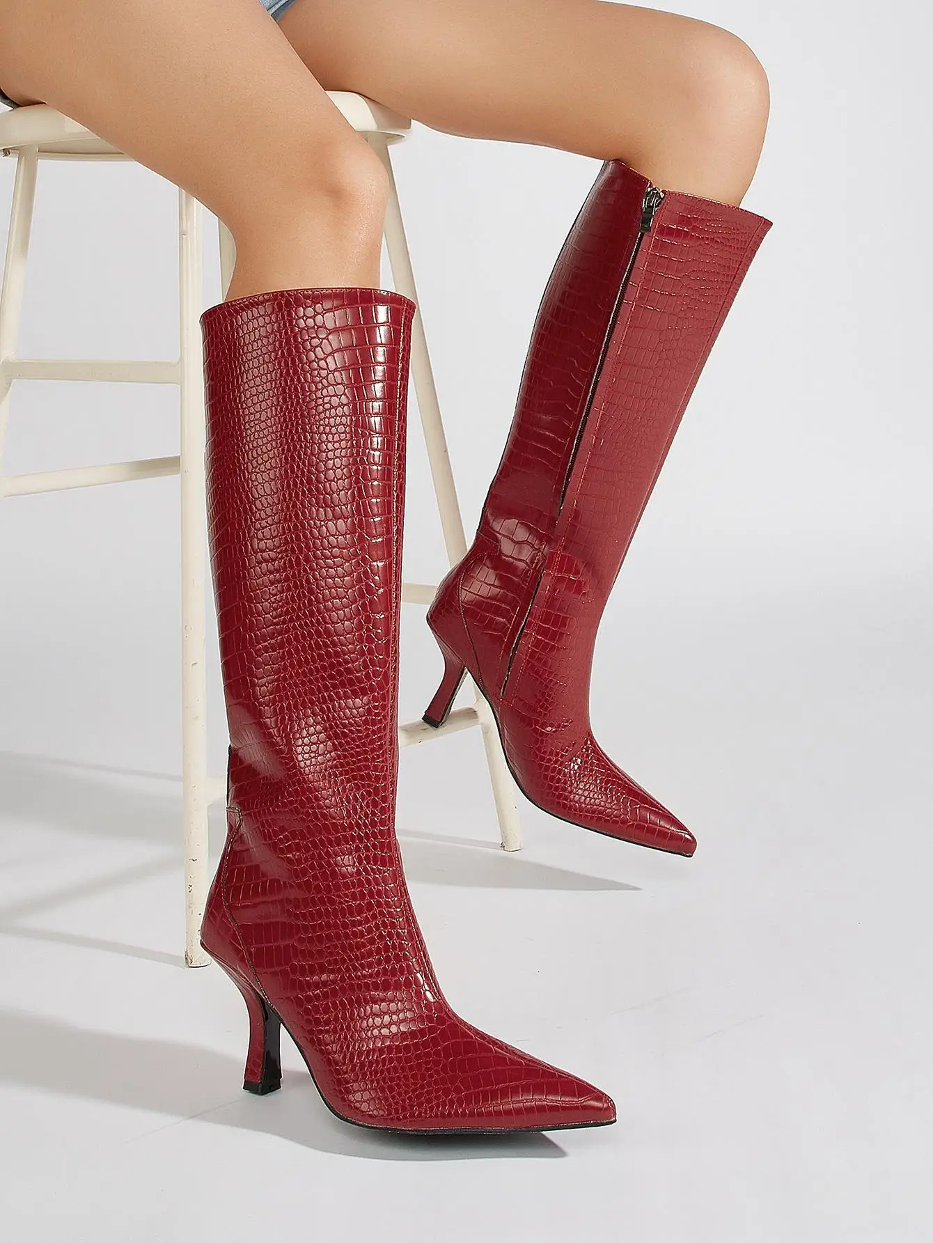 BUSY GIRL CXX179 Boots Women Shoes Women's Drak Red Crocodile - Embossed High - Heeled Knee - High Boots Pointed Toe Side Zipper
