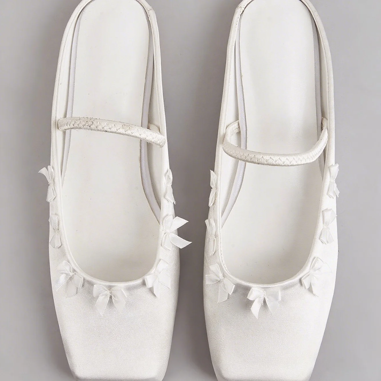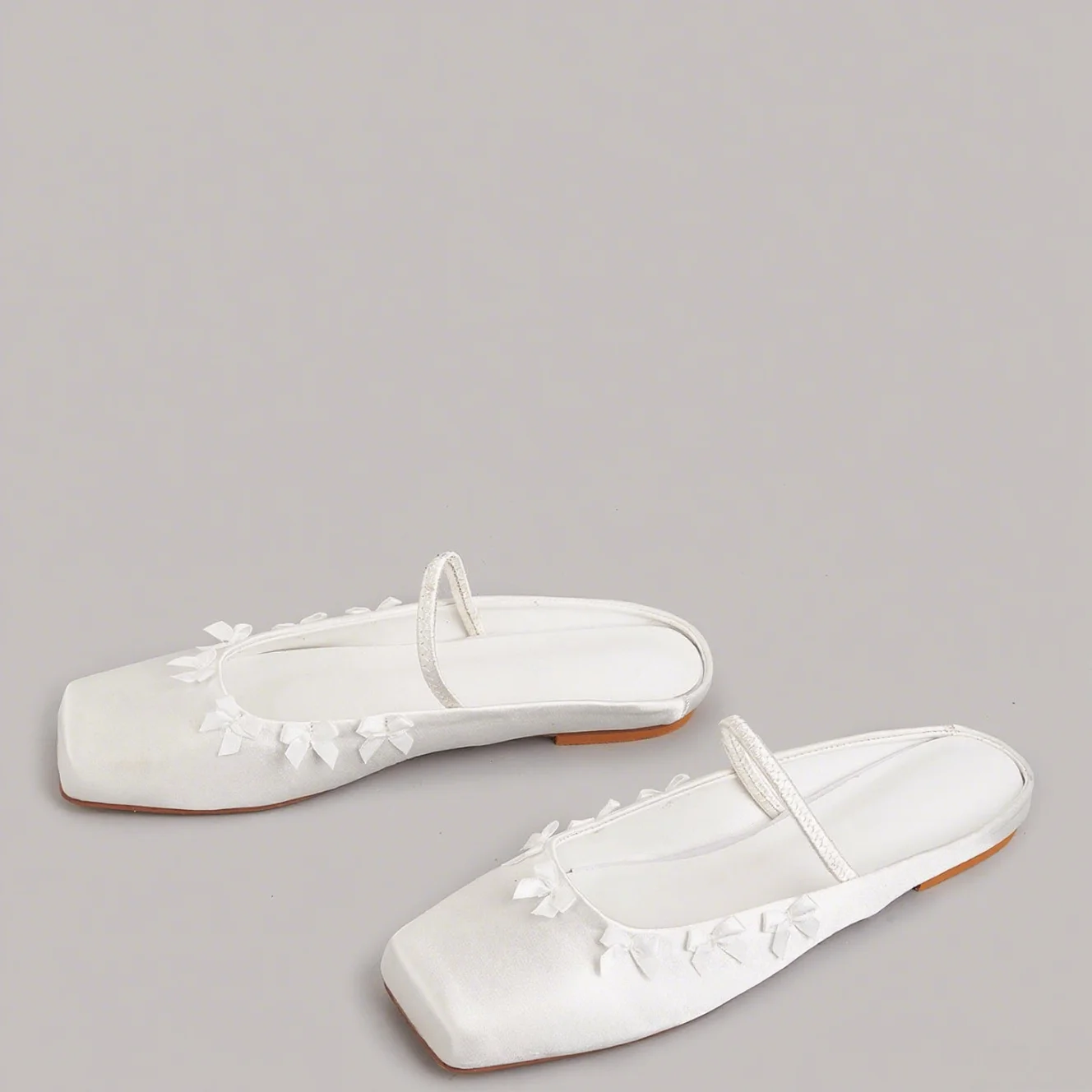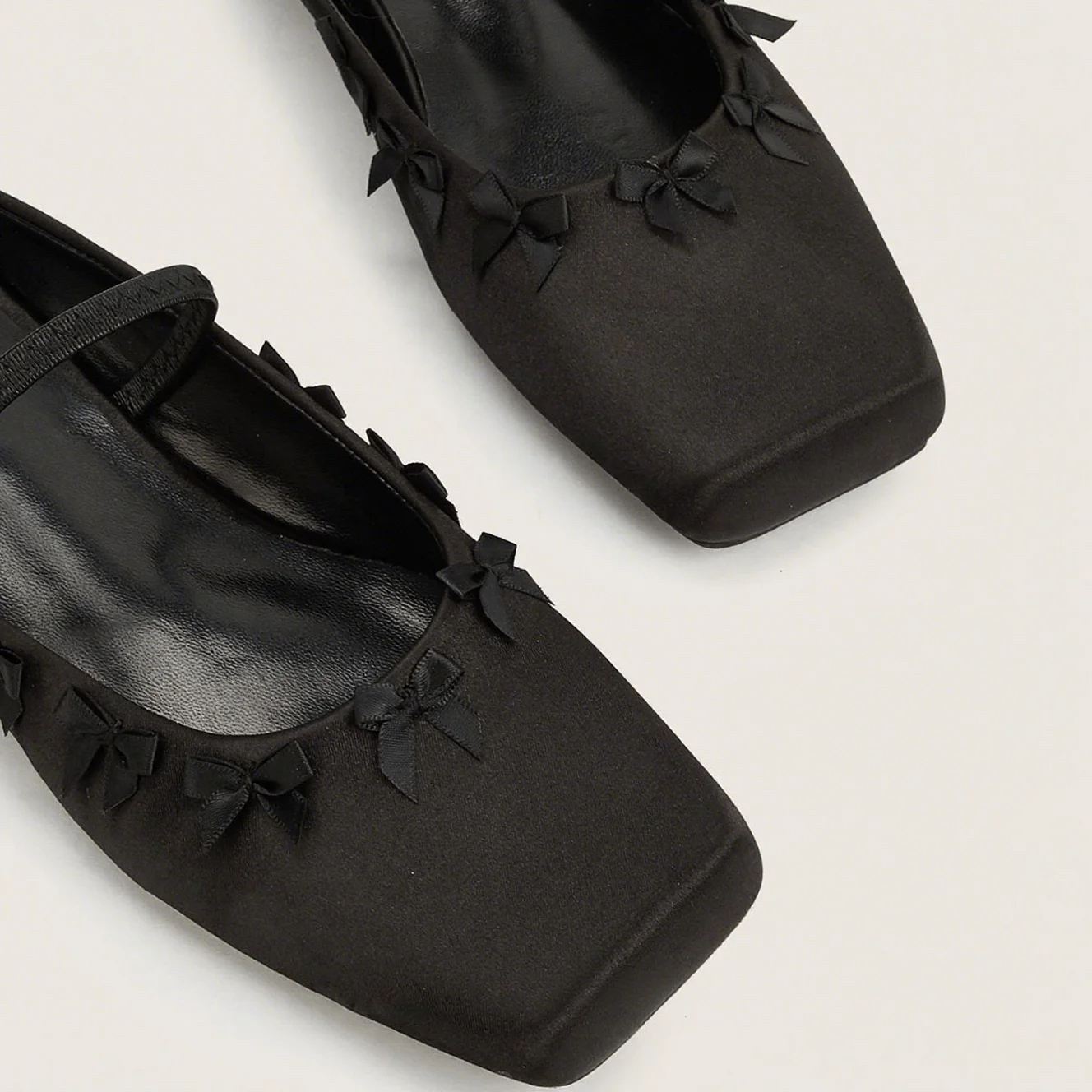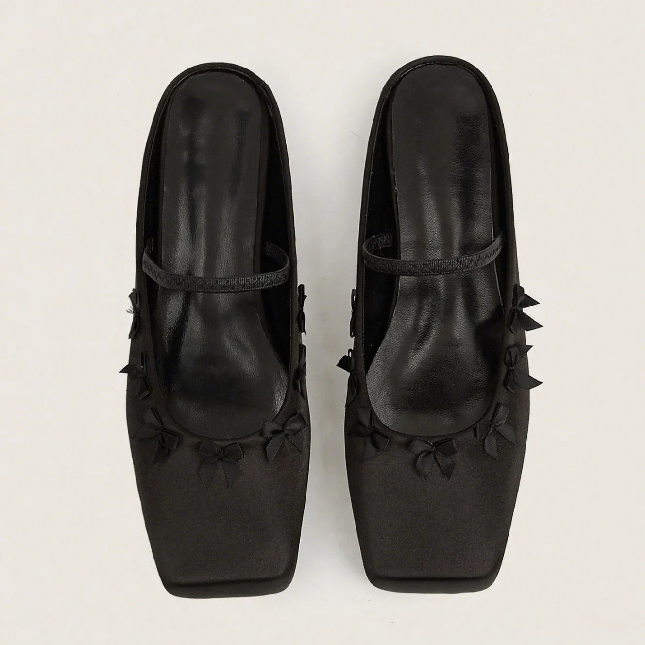BUSY GIRL CXX172 Elegant Black Single Strap Mules for Women with Mini Bow Satin White Ballet Flat Sandals for Ladies Summer