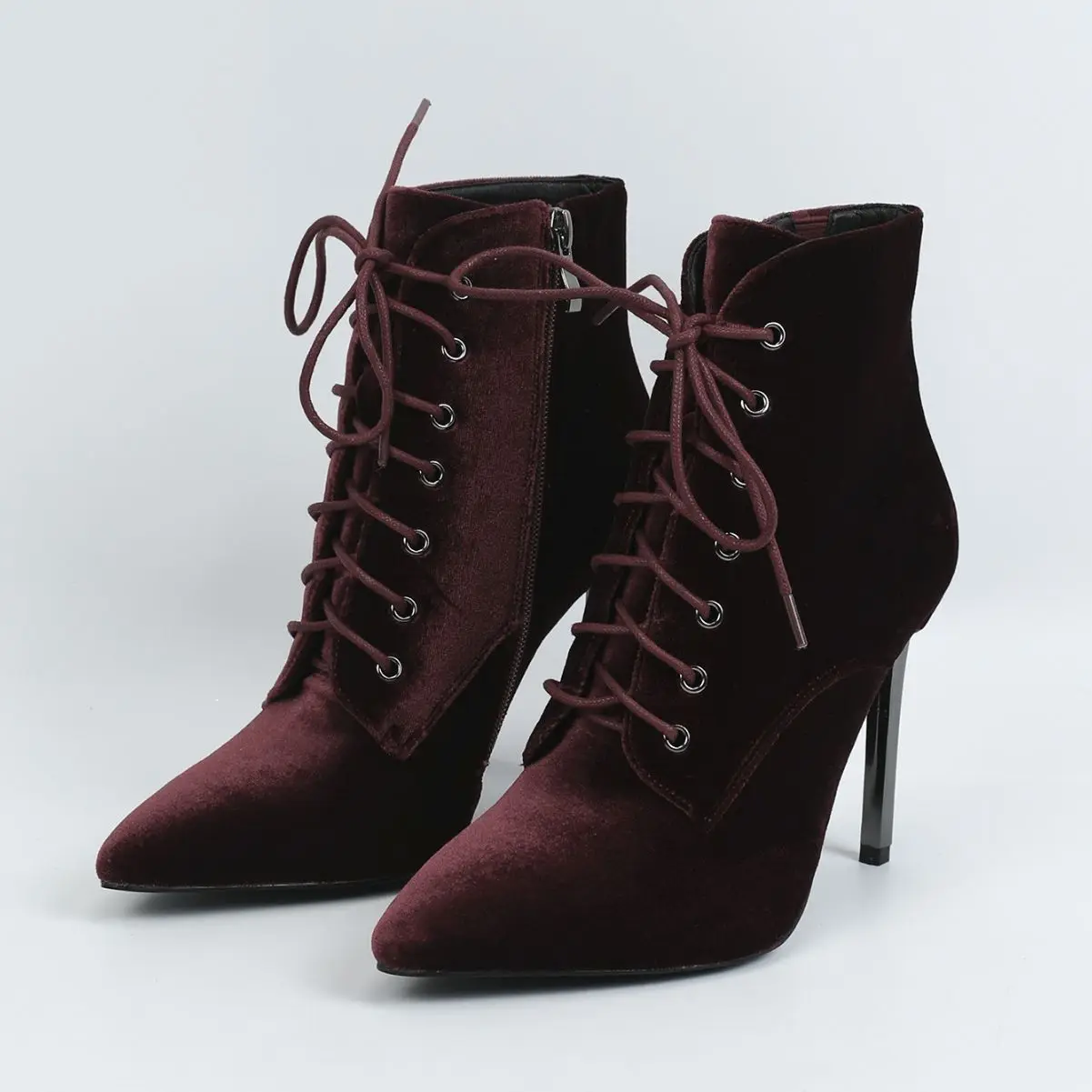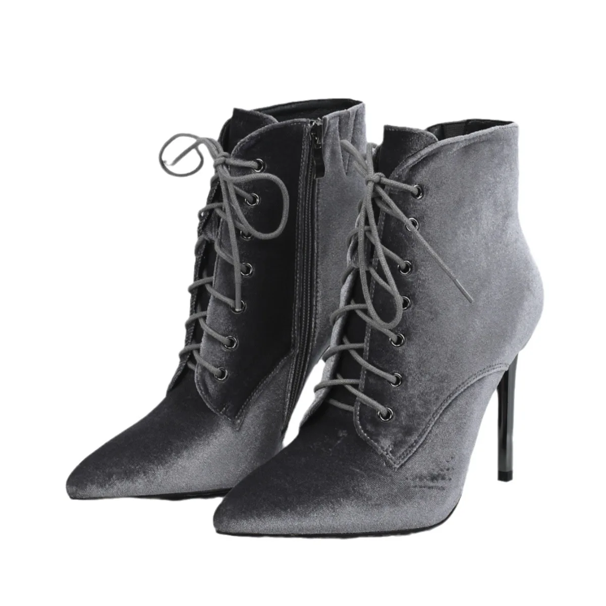 BUSY GIRL QD30 2026 Velvet Ankle Boots with Metallic Stiletto Heel Side Zip Lace-Up Women's Evening Party Sexy Ankle Boots