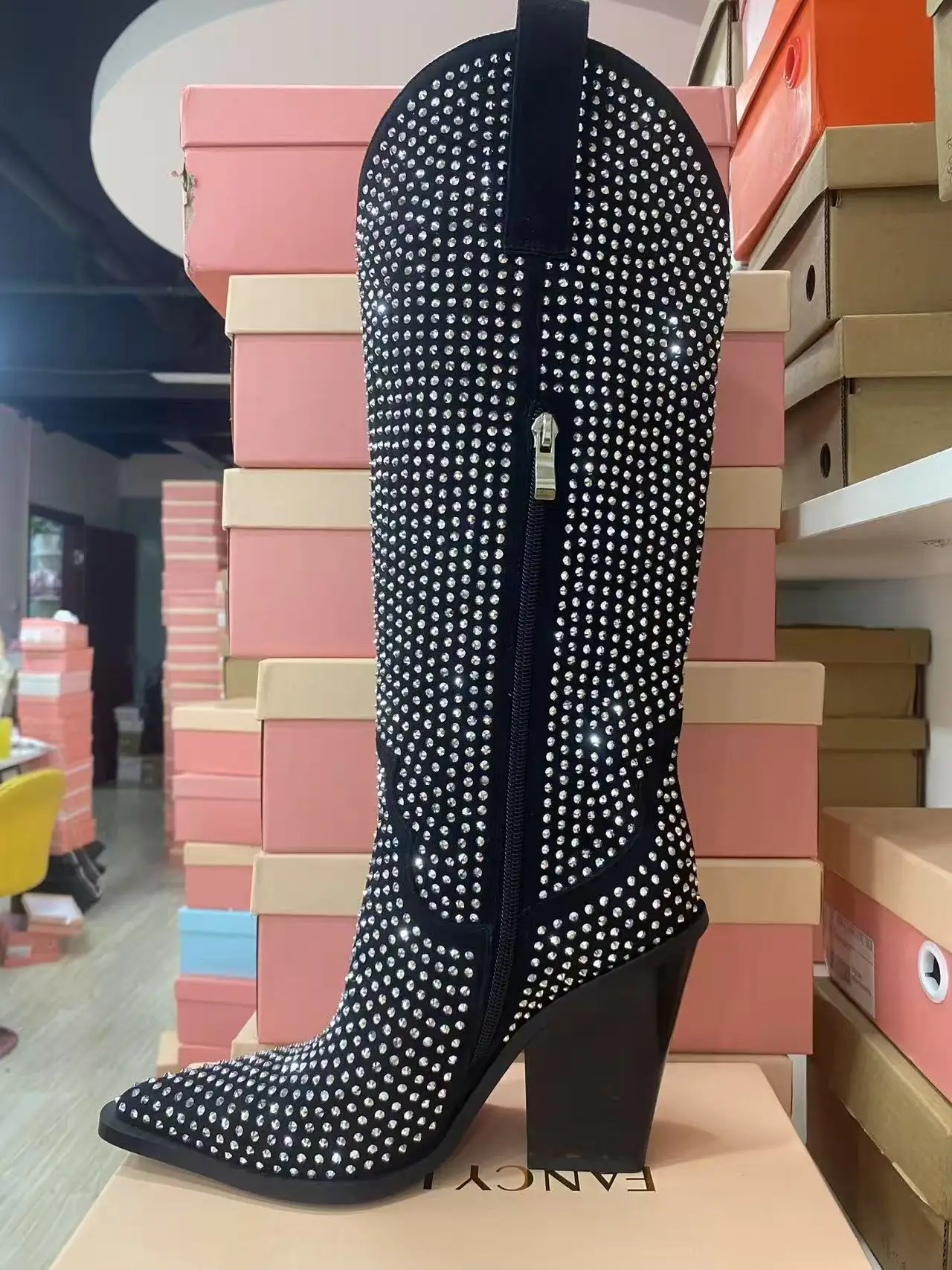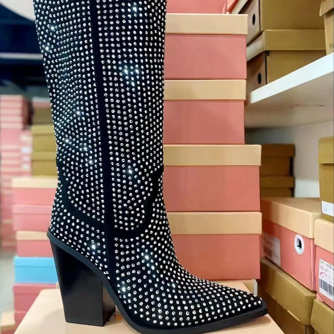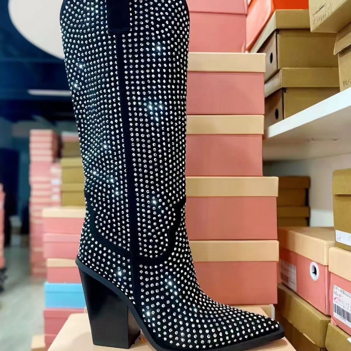 BUSY GIRL QD15 Knee-high Boots Women Shoes Black Hot Diamond Shining Knight Boots Western Cowboy Boots Rhinestone Women's Shoes