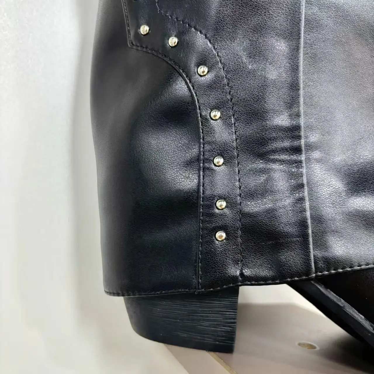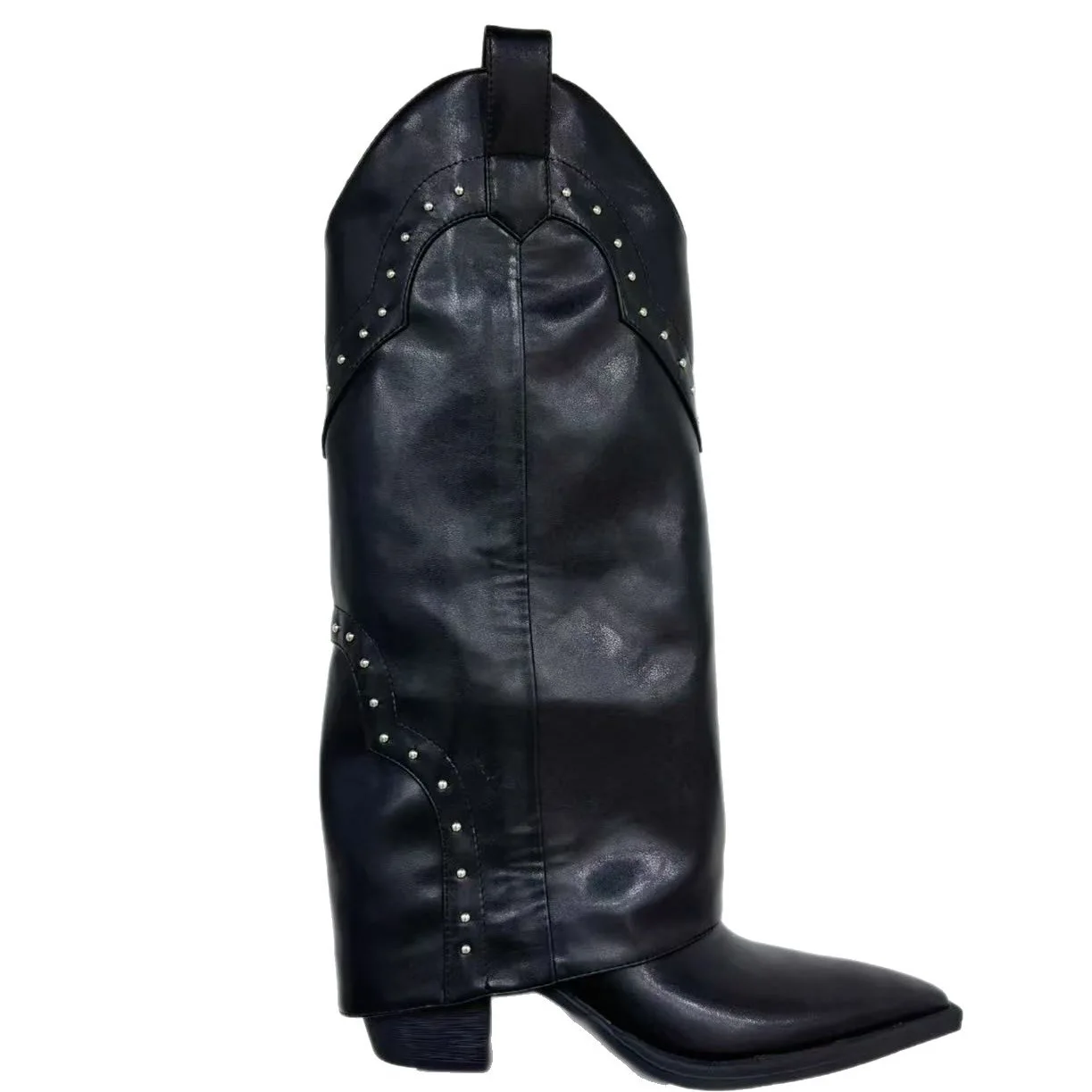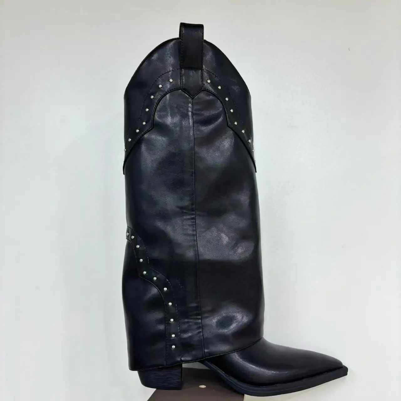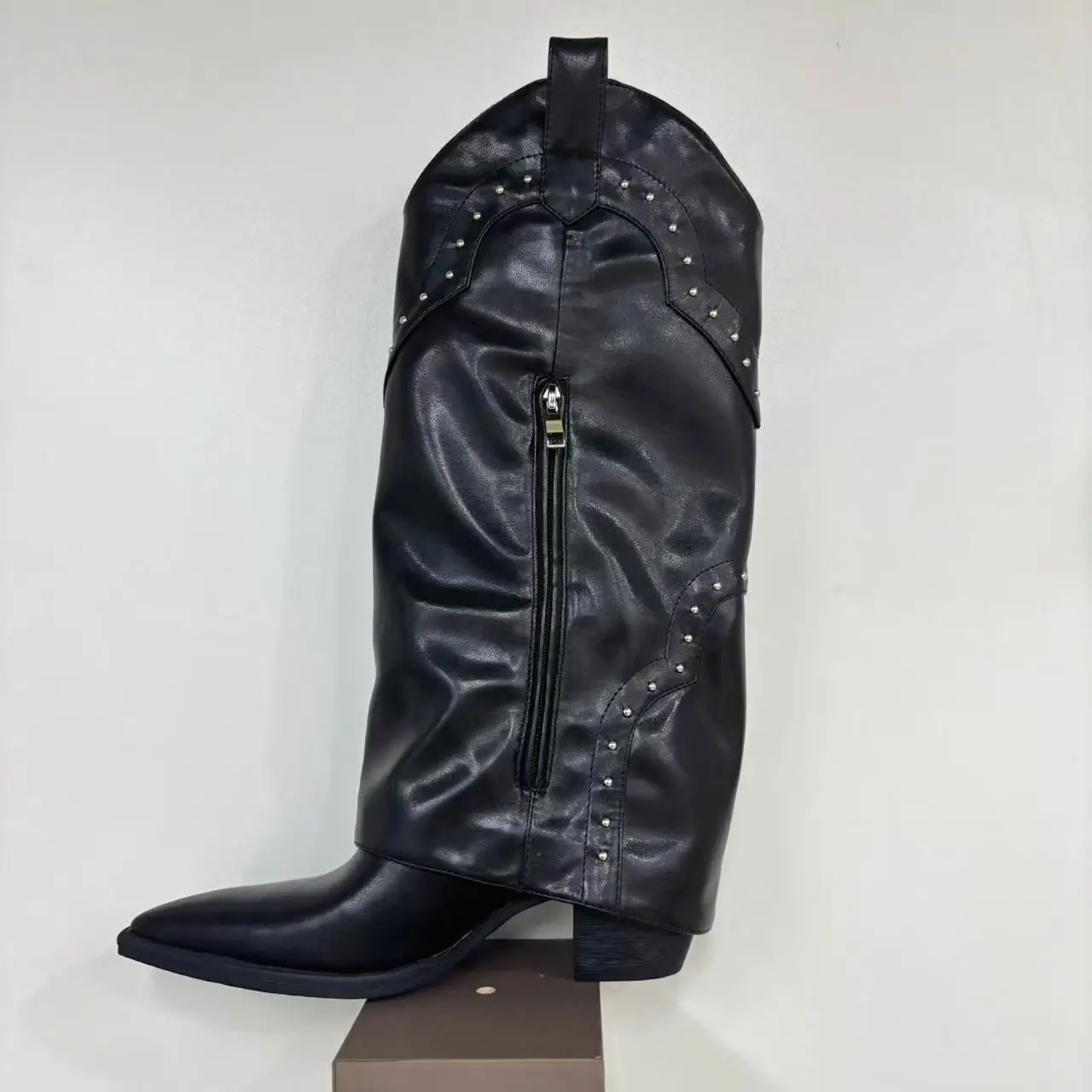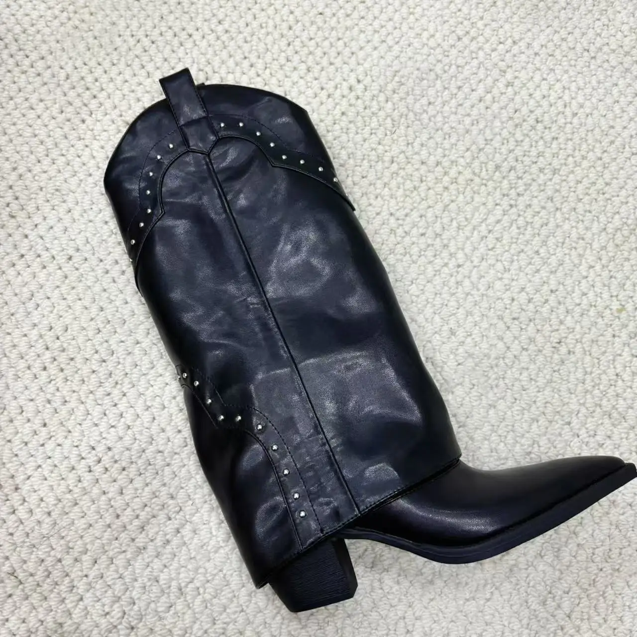 BUSY GIRL QD21 Rivet Pointed Toe Thick Heel Knee-high Boots 2026 Spring New Retro Mid-heel Trouser Boots Classic Boots for Women