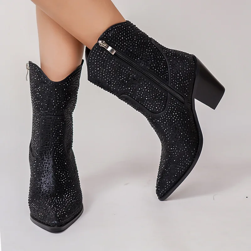 BUSY GIRL QLD22 Women Black Pointed Toe Chunky High Heel Ankle Boots Fashionable and Versatile Sleeve Hot Diamond Short Boots