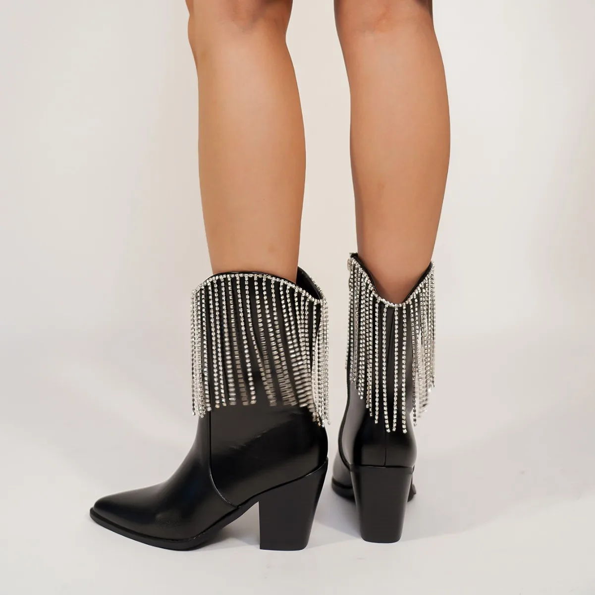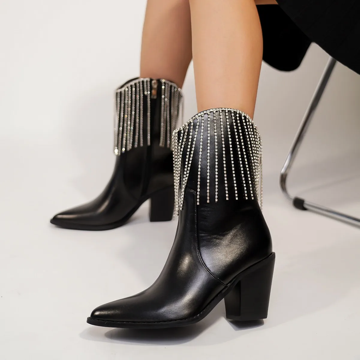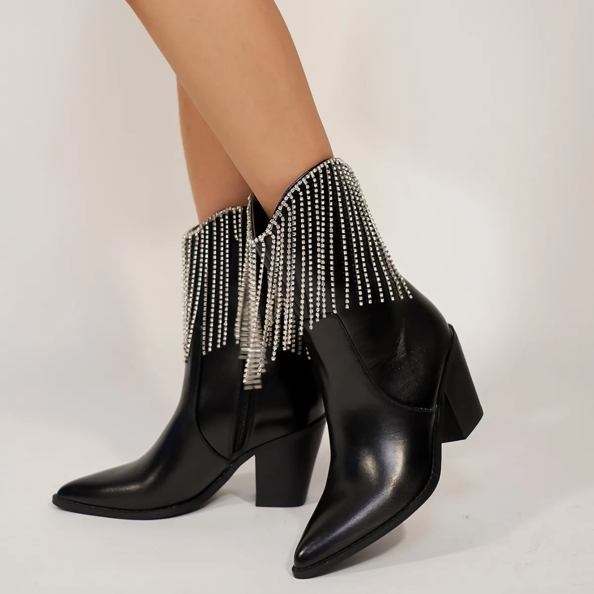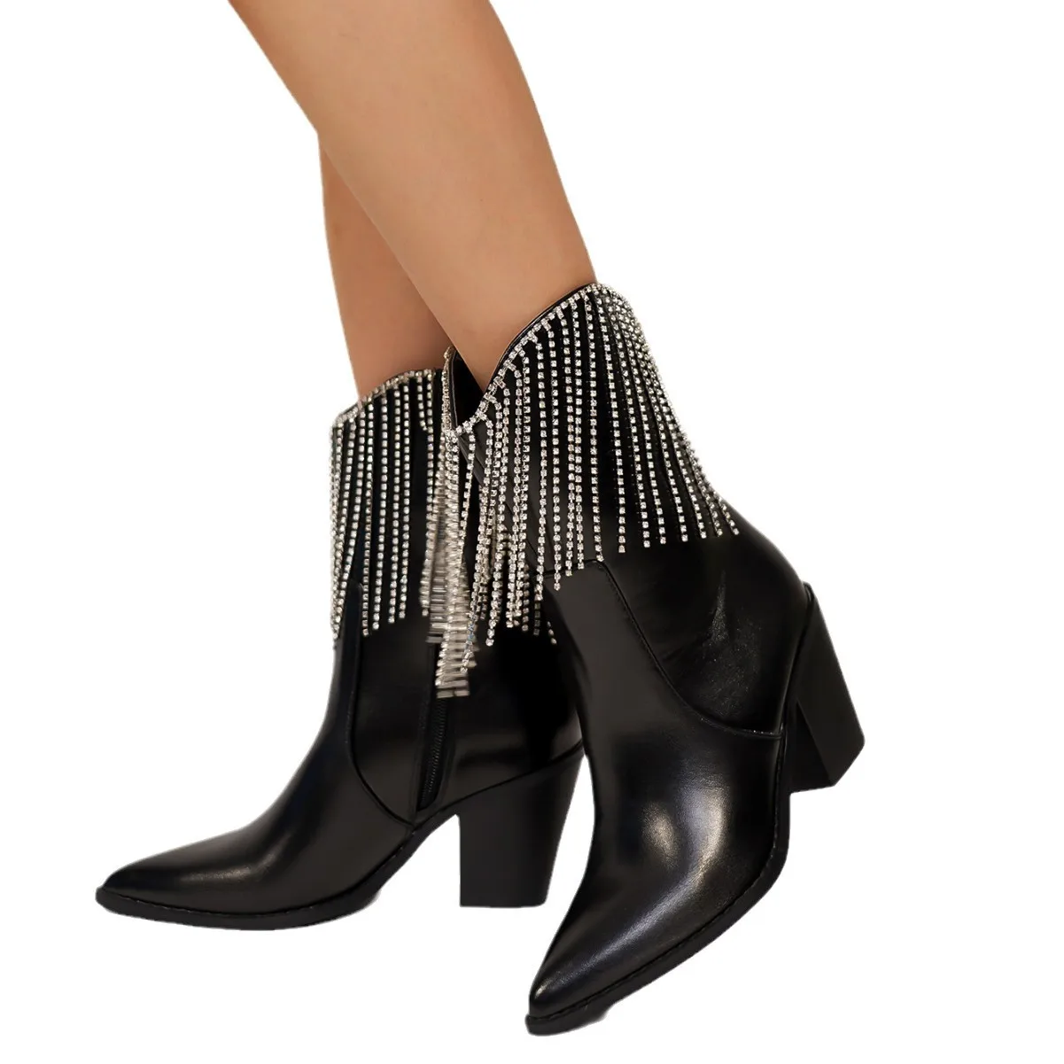 BUSY GIRL QLD29 Women's Short Boots New Slim Tassel Rhinestone Autumn and Winter High Heels Thick Heel Pointed Toe Short Boots