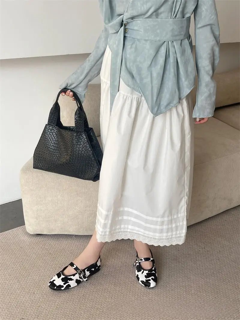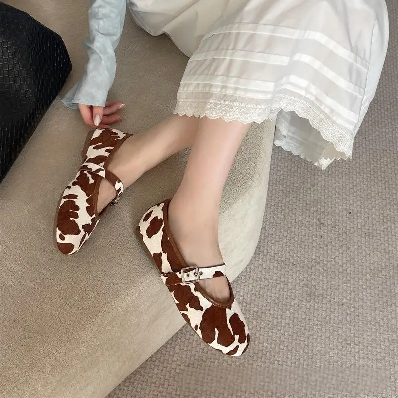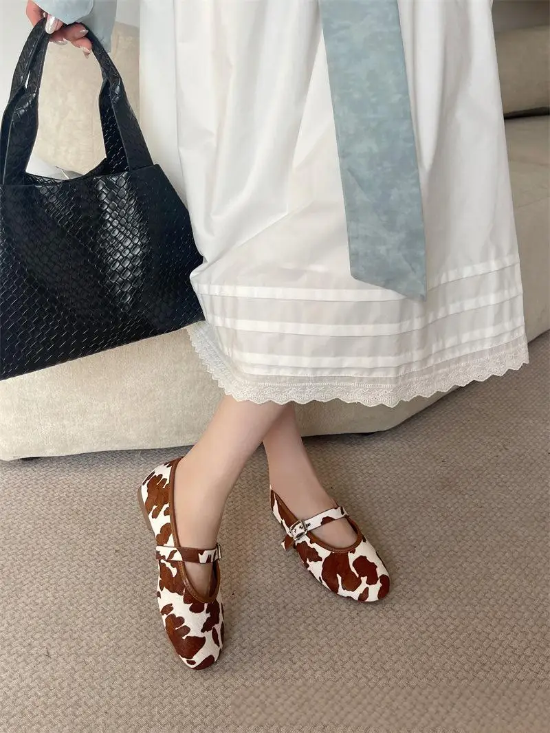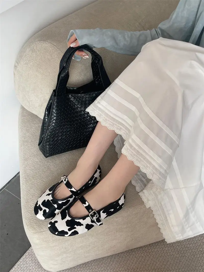 BUSY GIRL CXX256 Real Horsehair Round Toe Cap Ballet Sandals Black and White Single-strap Buckle Flat Casual Shoes for Ladies