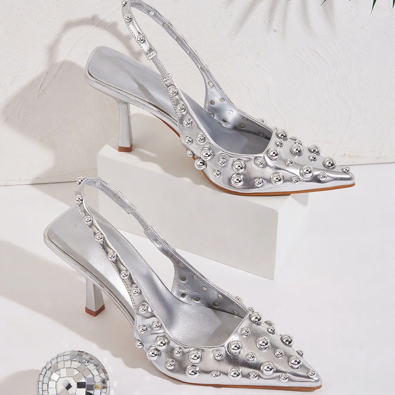 BUSY GIRL CXX219 Pointed High Heels Closed Toe Sandals Women's Shoes Silver Rivet Eyelet Buckle New Style Hot Style Punk Sandals