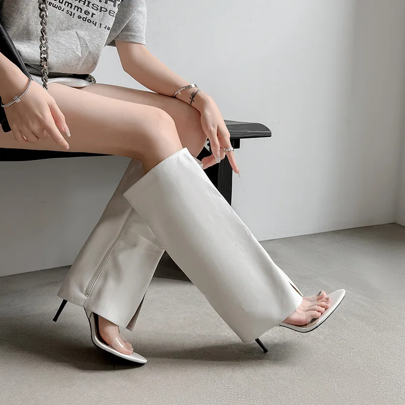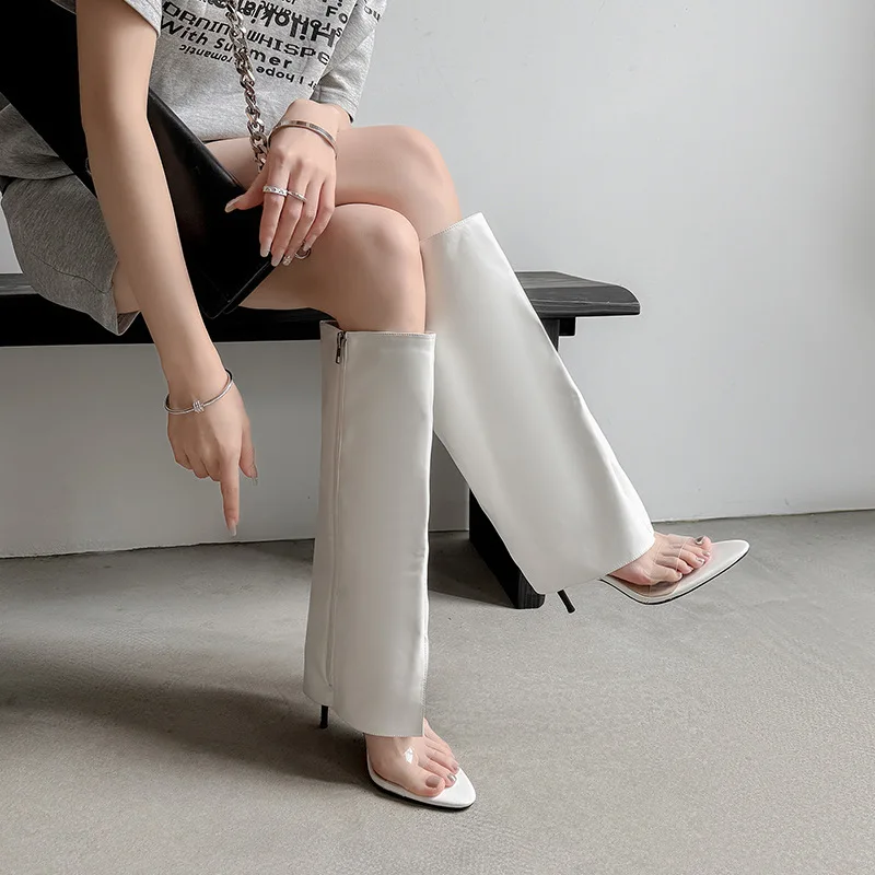 BUSY GIRL MY9507 Ladies White One-Strap Peep-Toe Pointed Toe Heels Knee High Boots with Side Zipper Glossy Summer Casual Shoes