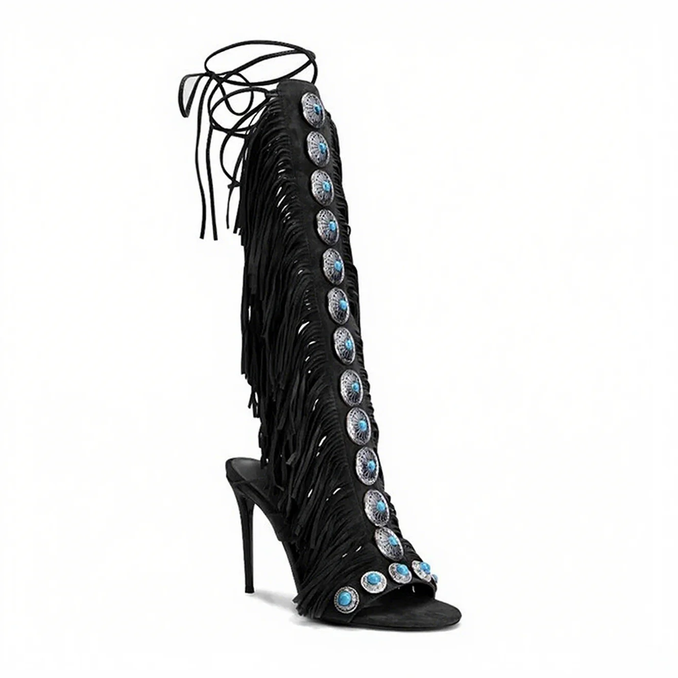 BUSY GIRL WXT9121 2026 Summer New Tassel Gem Bohemian Style Stiletto Sandals Strap Knee-high Large Size Women's Shoes