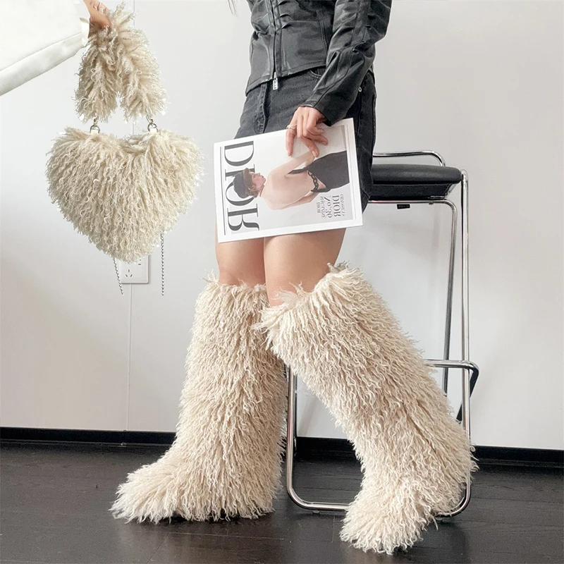 For Busy Girl RS9231 Ladies Fluffy Mongolian Fur Over-the-Knee Boots Peach Pink Tan Black Thigh High Size 13 Flat Long Women's