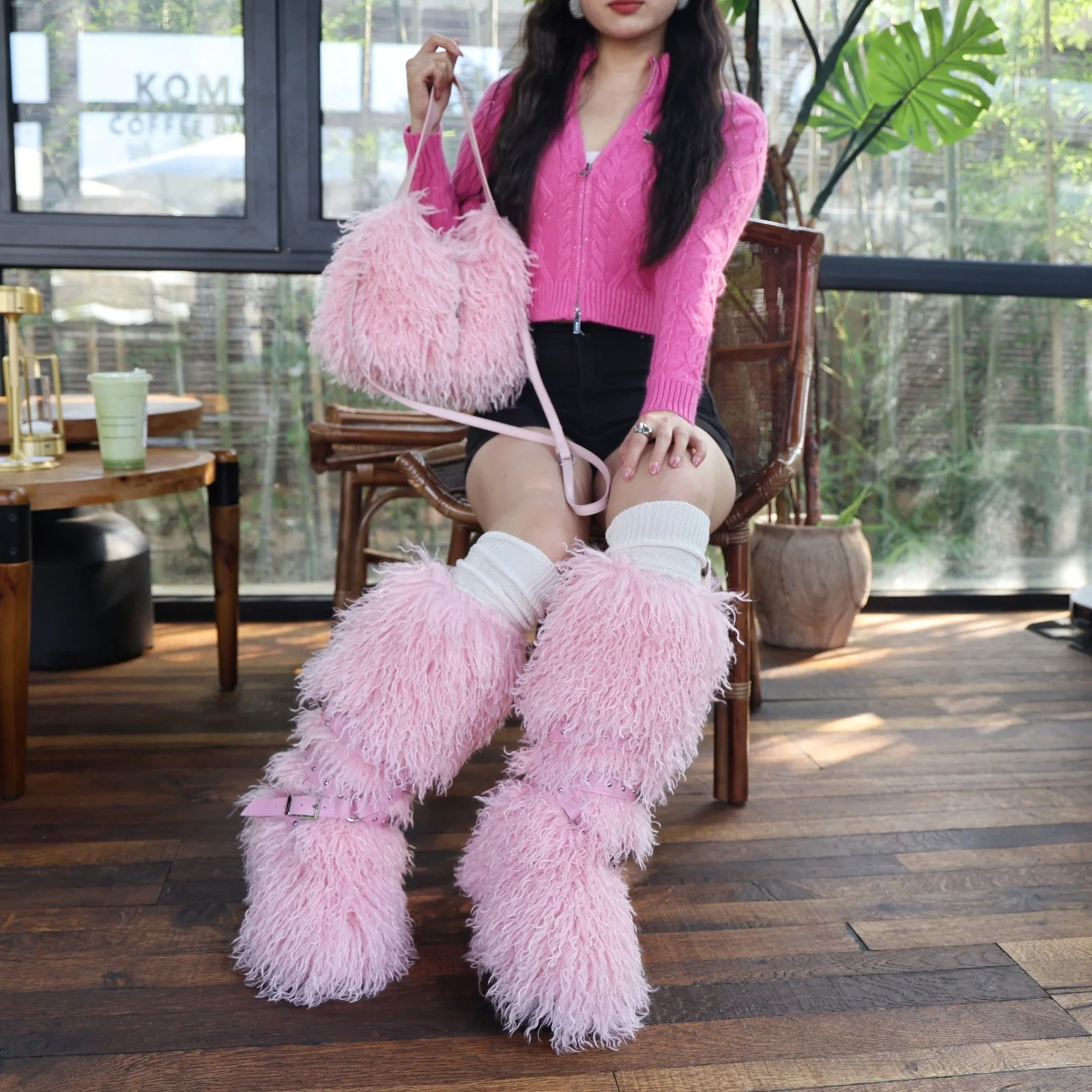 BUSY GIRL RS9252 Mongolian Fur Boots Pink Custom Boots Manufacturers Non-slip Fur Boots Womens Size 10 Fur Boots and Bag Set