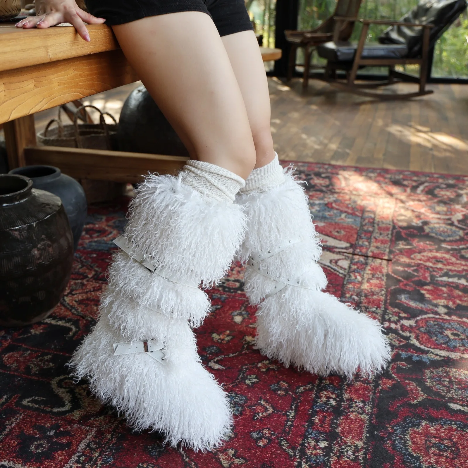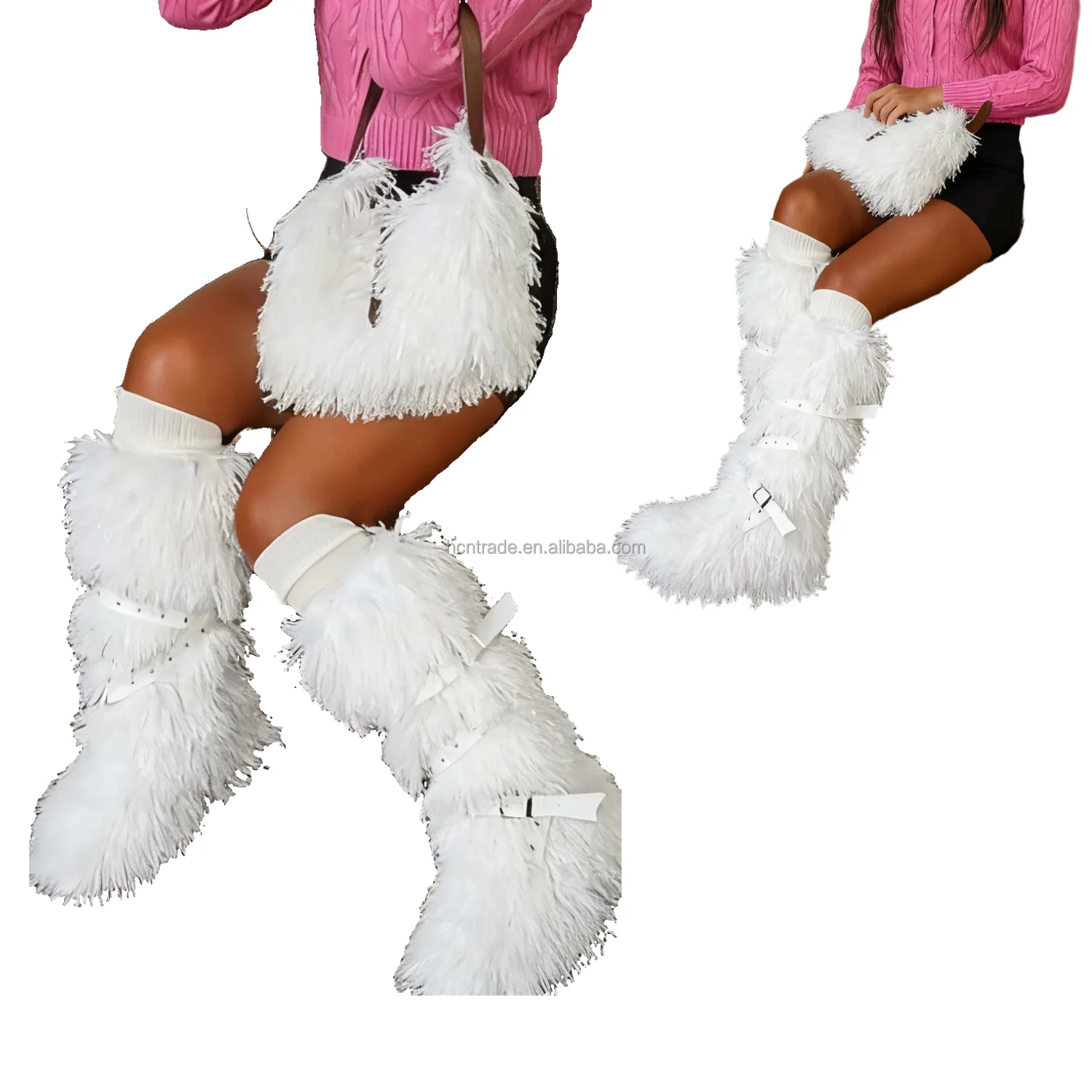BUSY GIRL RS9252 Faux Fur Boots for Women White Custom Winter Boots Fur Boots and Bag Warm High-top Cross-strap Rivet Boots Set