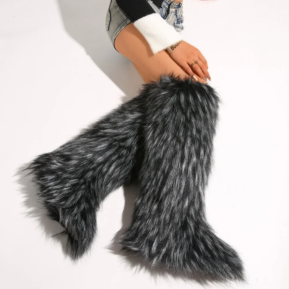 BUSY GIRL RS9253 Fur Boots Women Black Base and White Tip Custom Women Shoes Women's Faux Fur Knee-High Boots Warm Winter Shoes