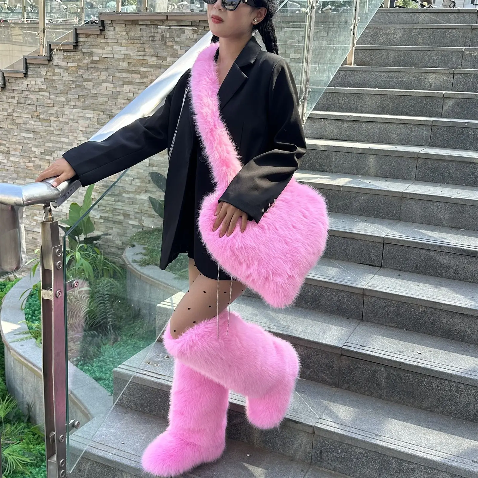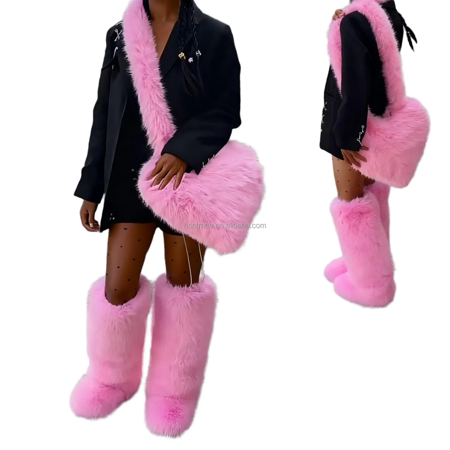 BUSY GIRL HS9271 Custom Boots Fur Boots Womens Size 10 Fur Boots and Bag Women's Pink Faux Fur Set Knee-High Boots Heart Bag