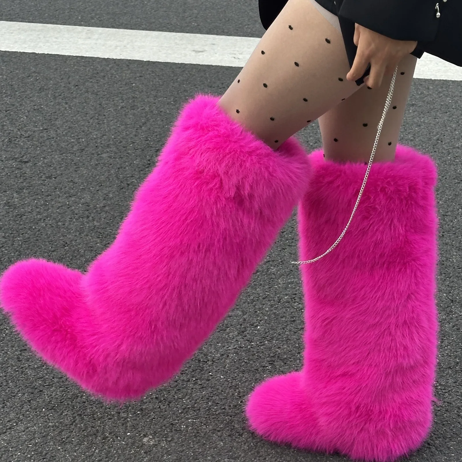 BUSY GIRL HS9283 Plum Faux Fur Boots for Women Custom Winter Boots Fuchsia Knee-High Faux Fox Fur Boots with Slip-Resistant