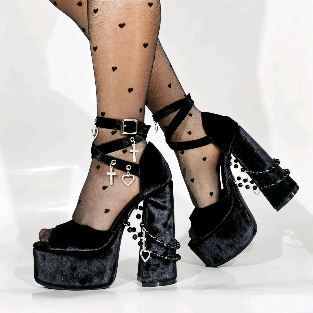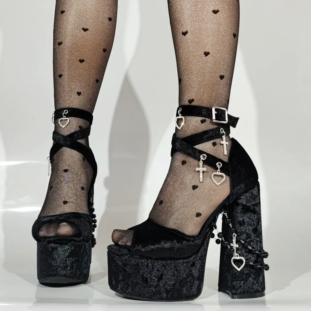 BUSY GIRL XYZ2502 Custom Heels Sexy Y2k Velvet Dark Lolita Pearl Large Size 47 Water Platform Thick High Heel Women's Sandals