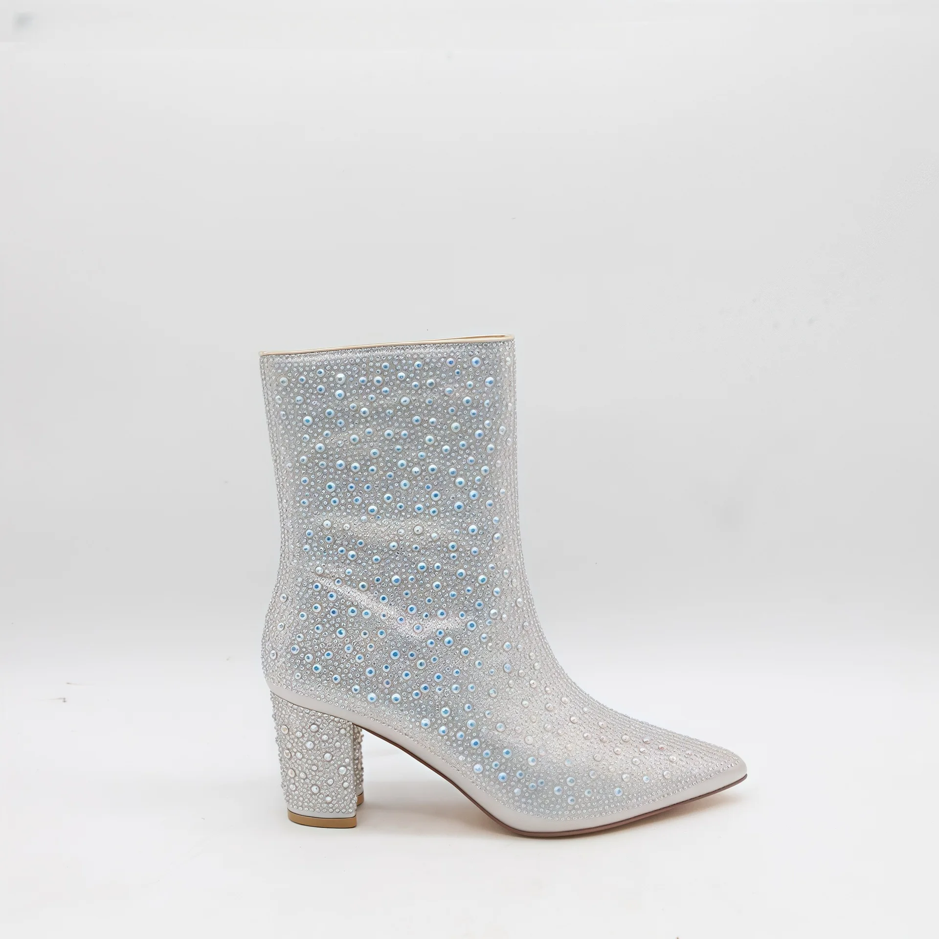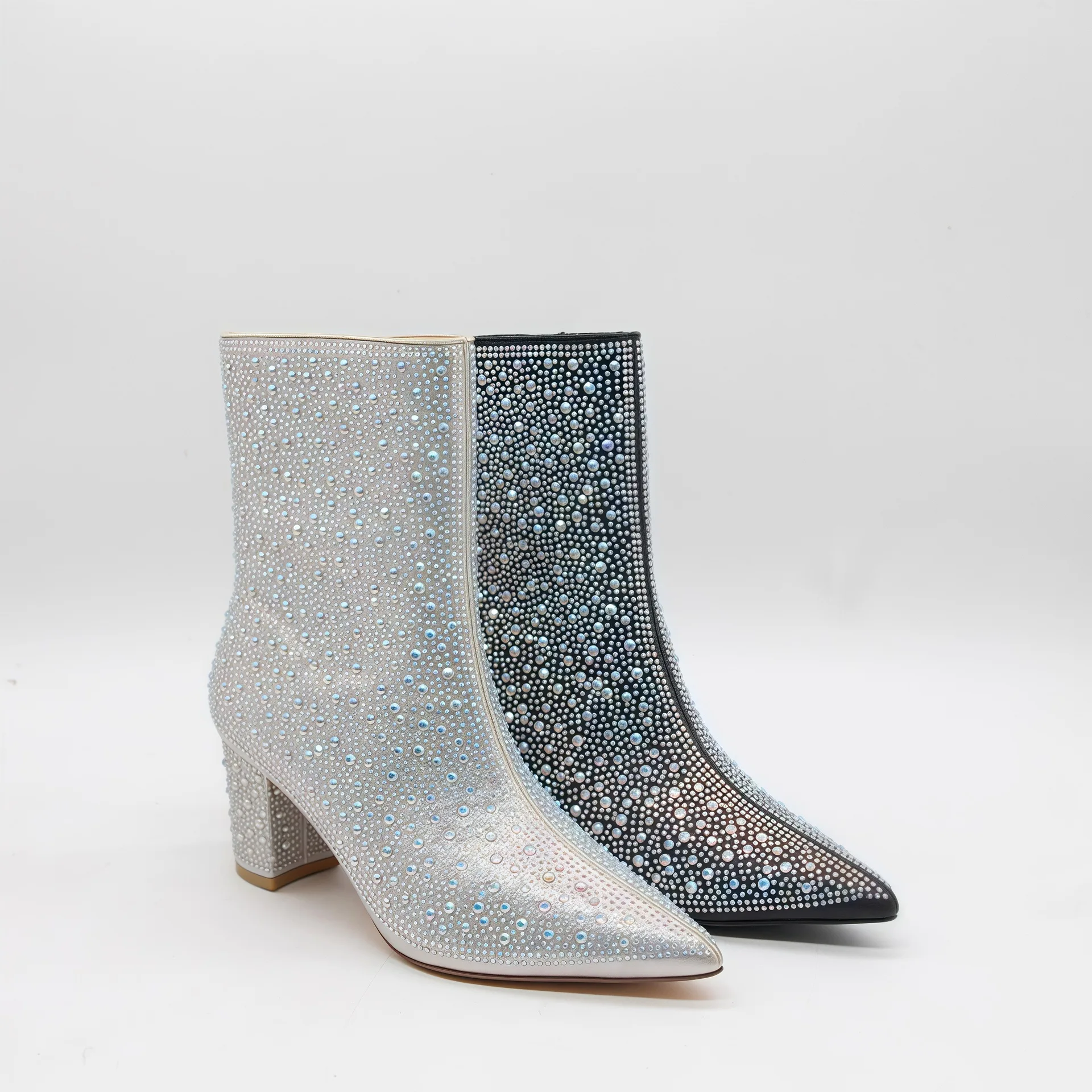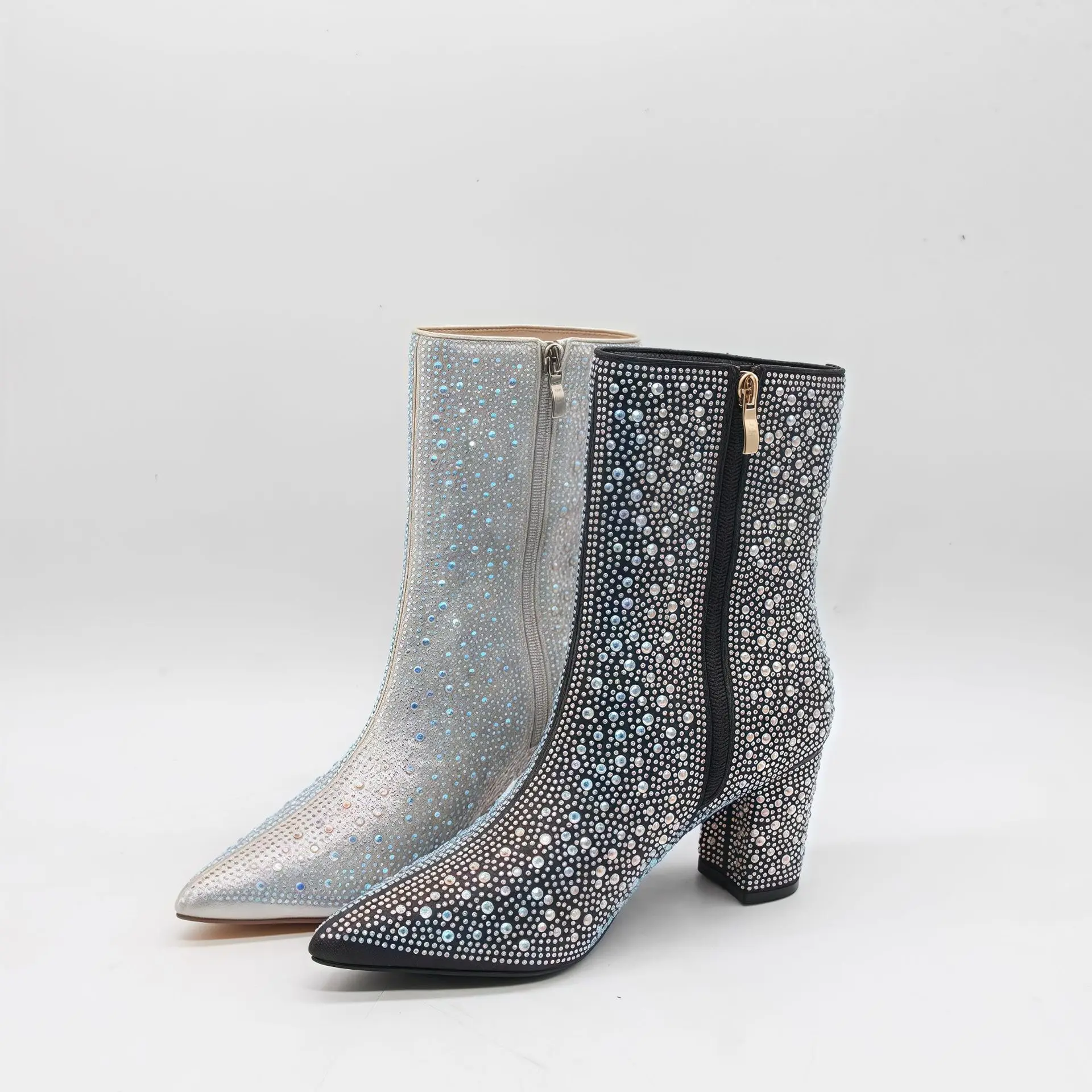 BUSY GIRL HQ1122 Women's Ankle Boots Pointed-toe Chunky Heel Low-cut Boots for Women with Full Rhinestones Sexy and Versatile