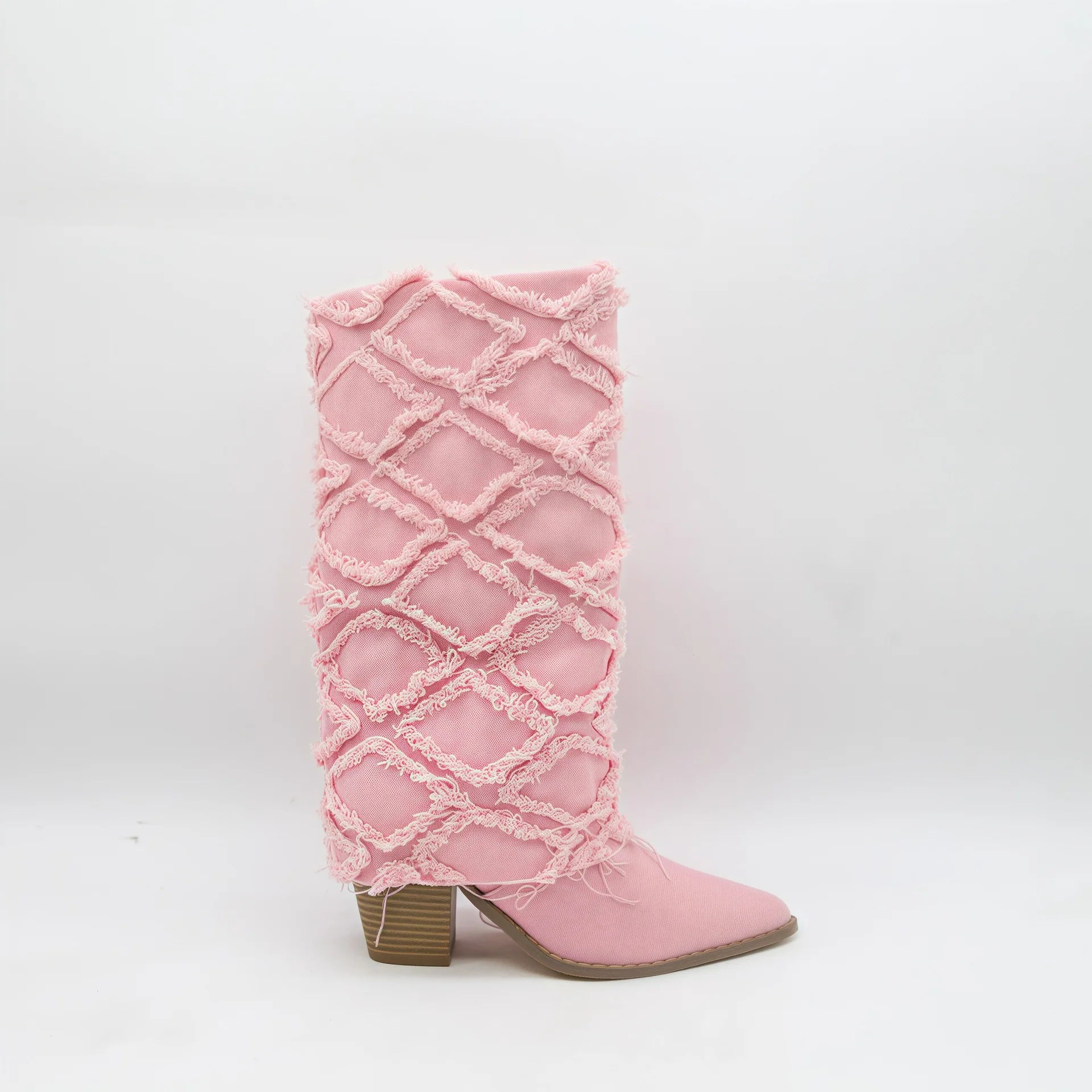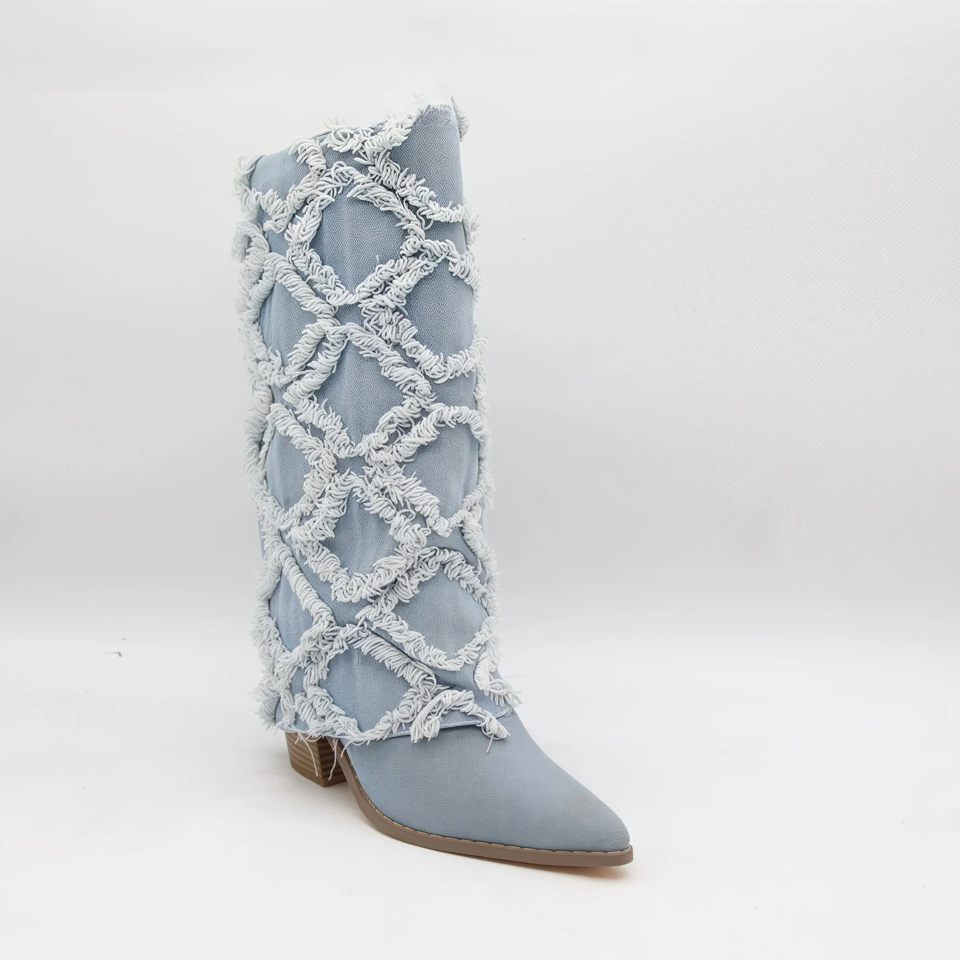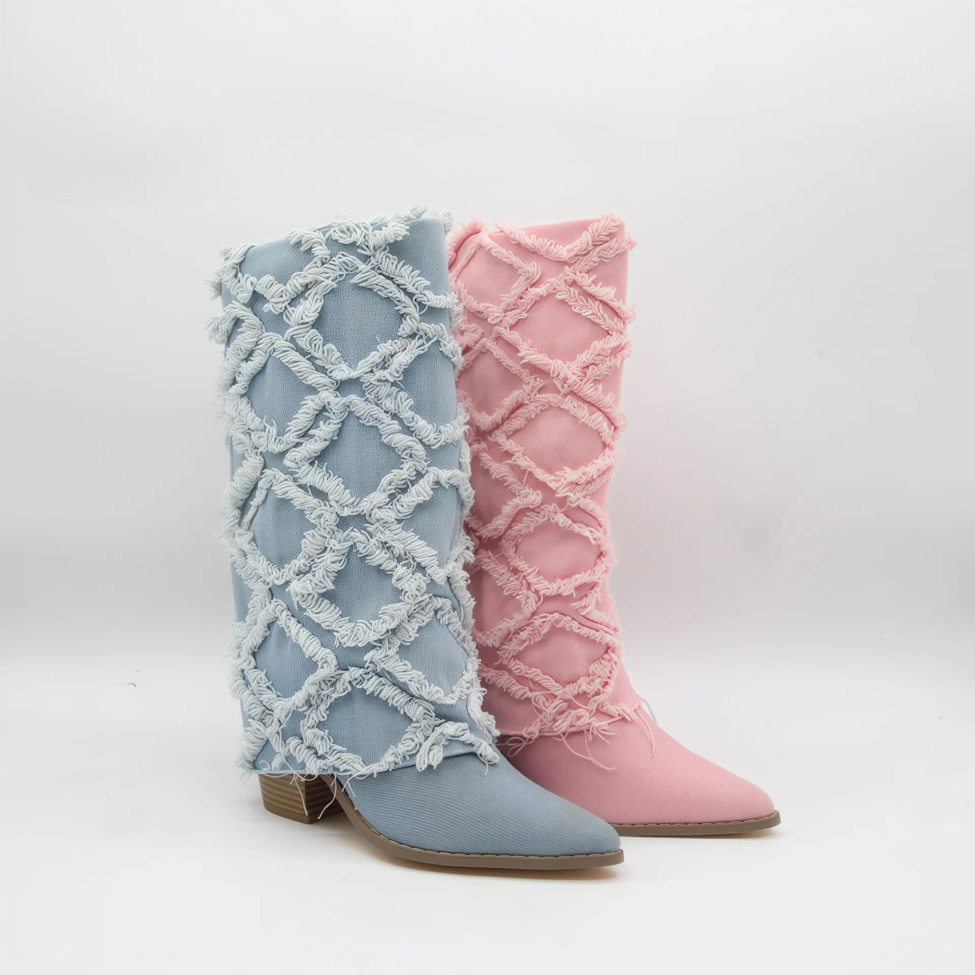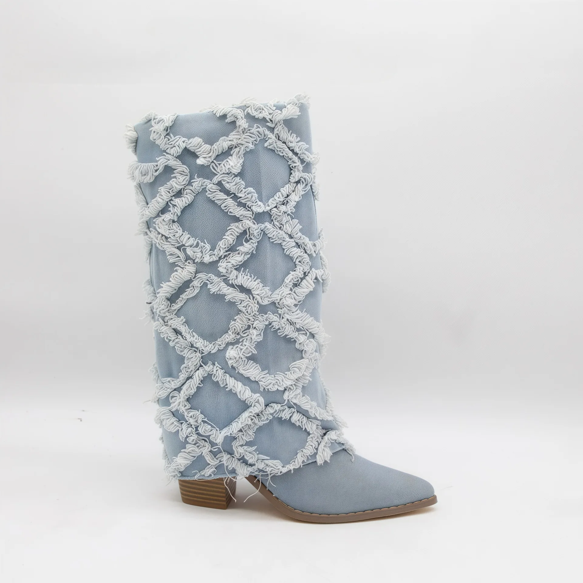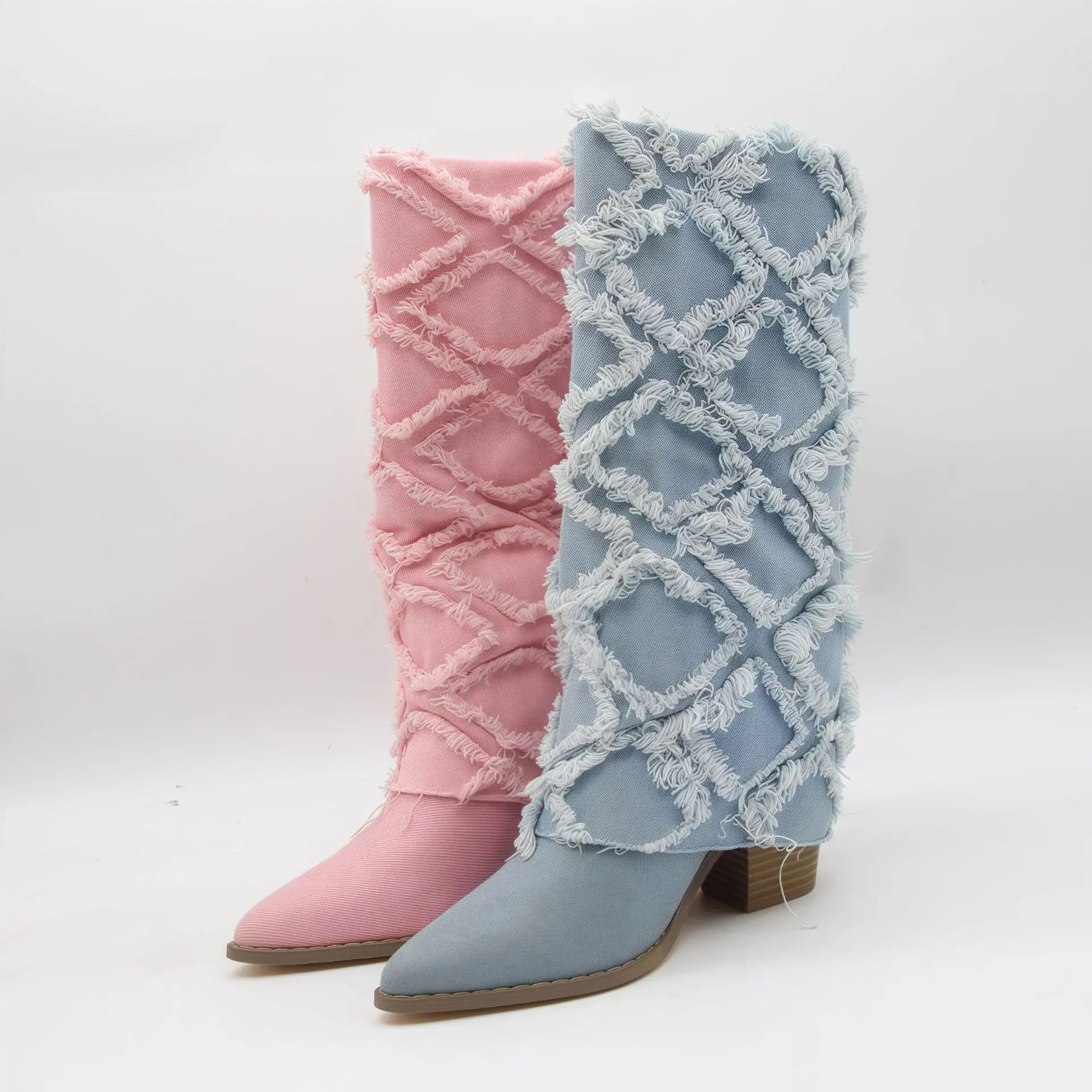 BUSY GIRL HQ1132 Sweet Stiletto Pointed Toe Chunky Heel Mid-Claf Boots Denim Blue Pattern Slip-on Boots 2026 Autumn/Winter