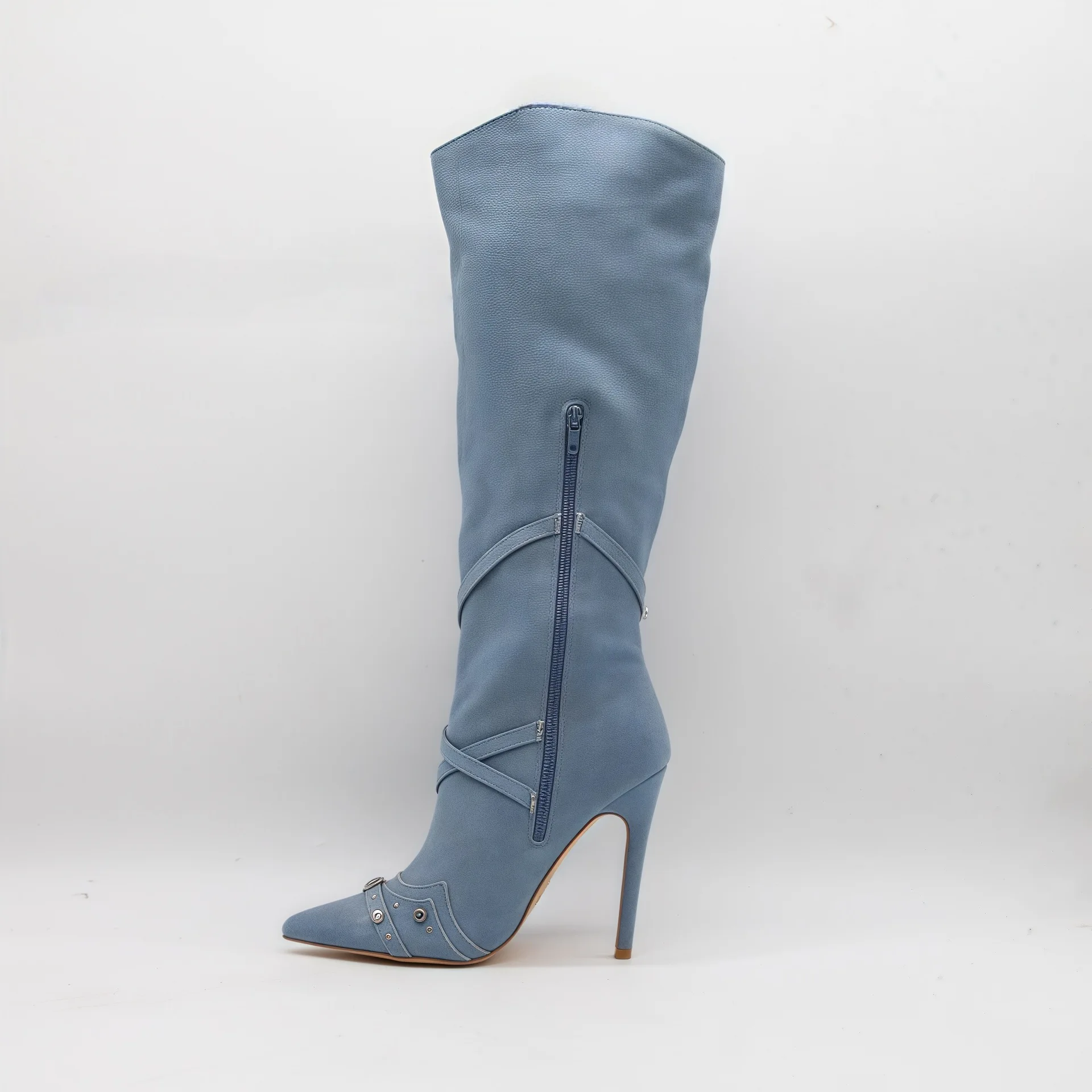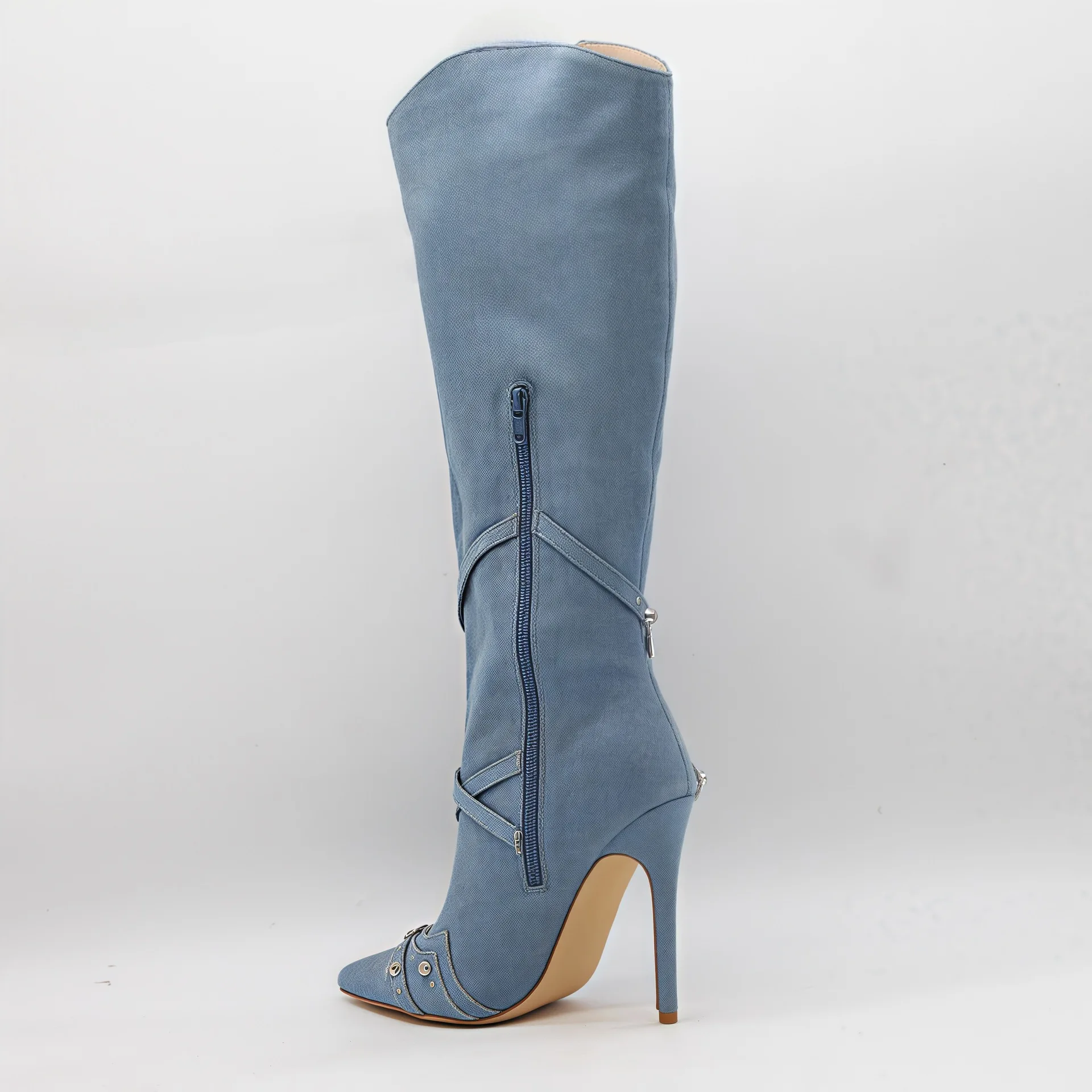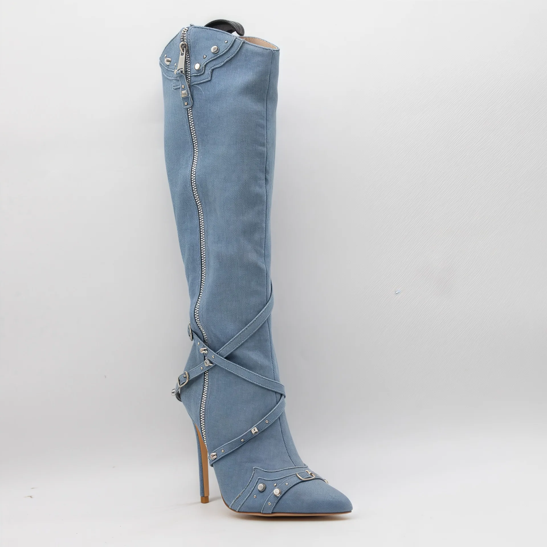 BUSY GIRL HQ1153 Women's Blue Denim Knee-High Boots with Front Zipper Cross Straps Studs Pointed Toe Stiletto High Heel Booties
