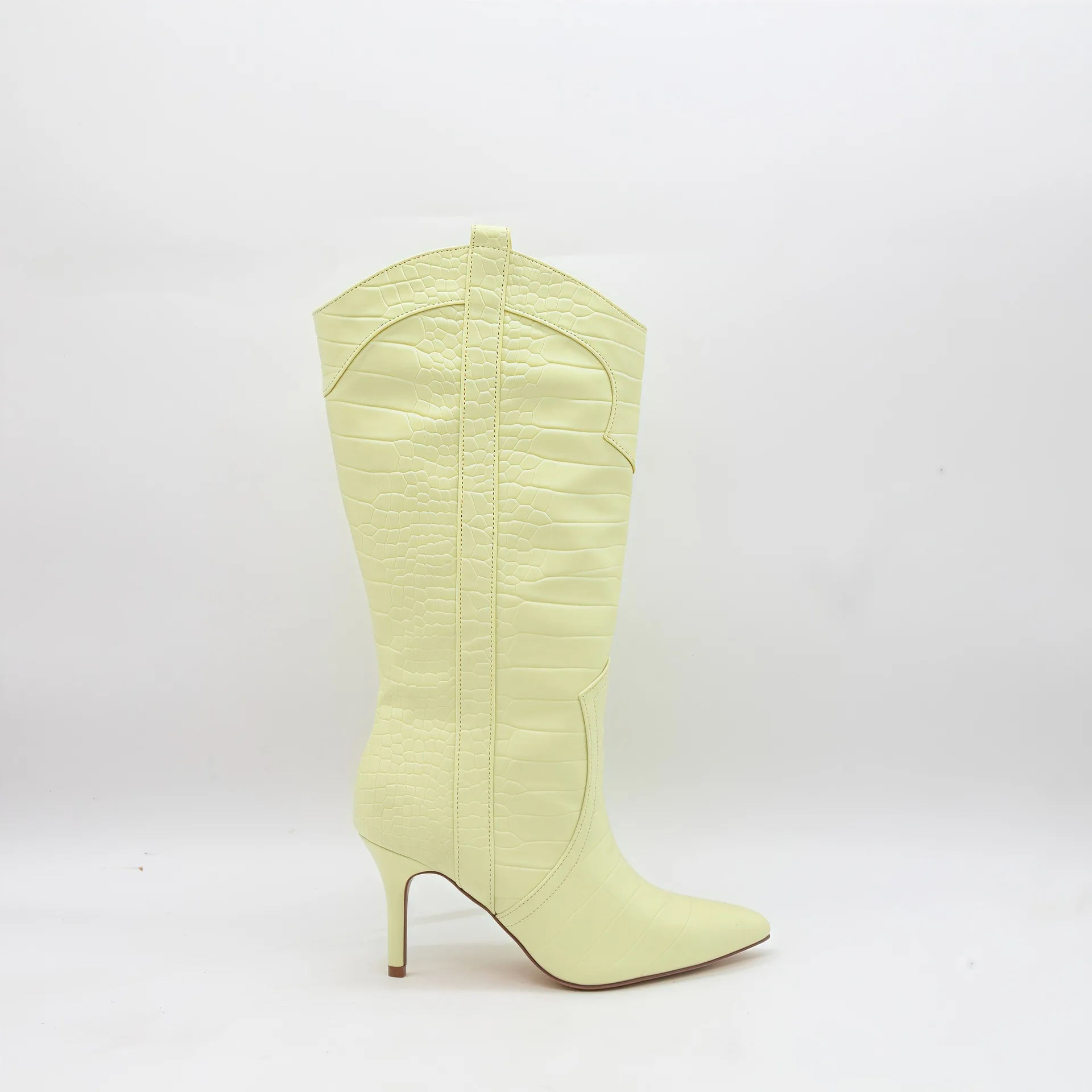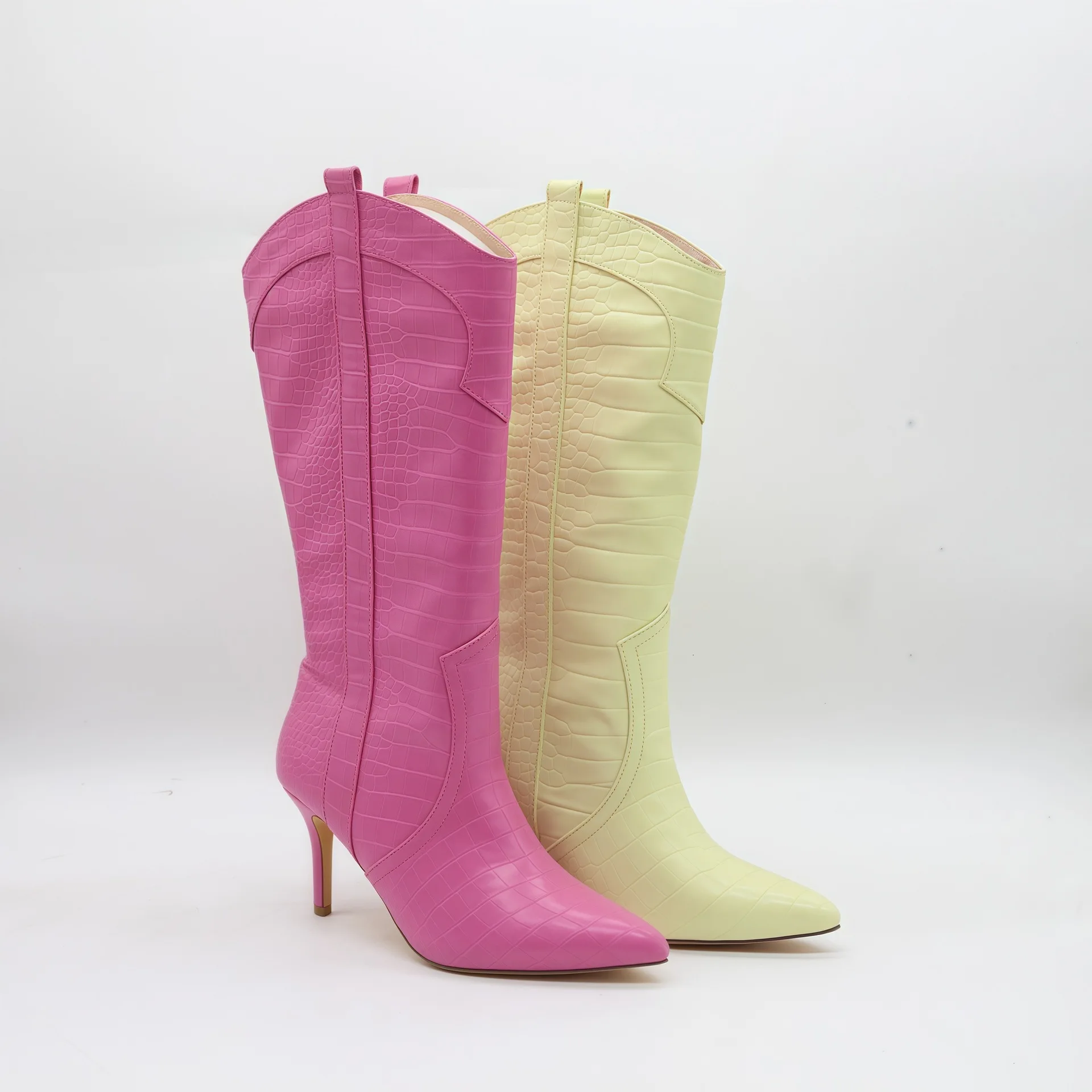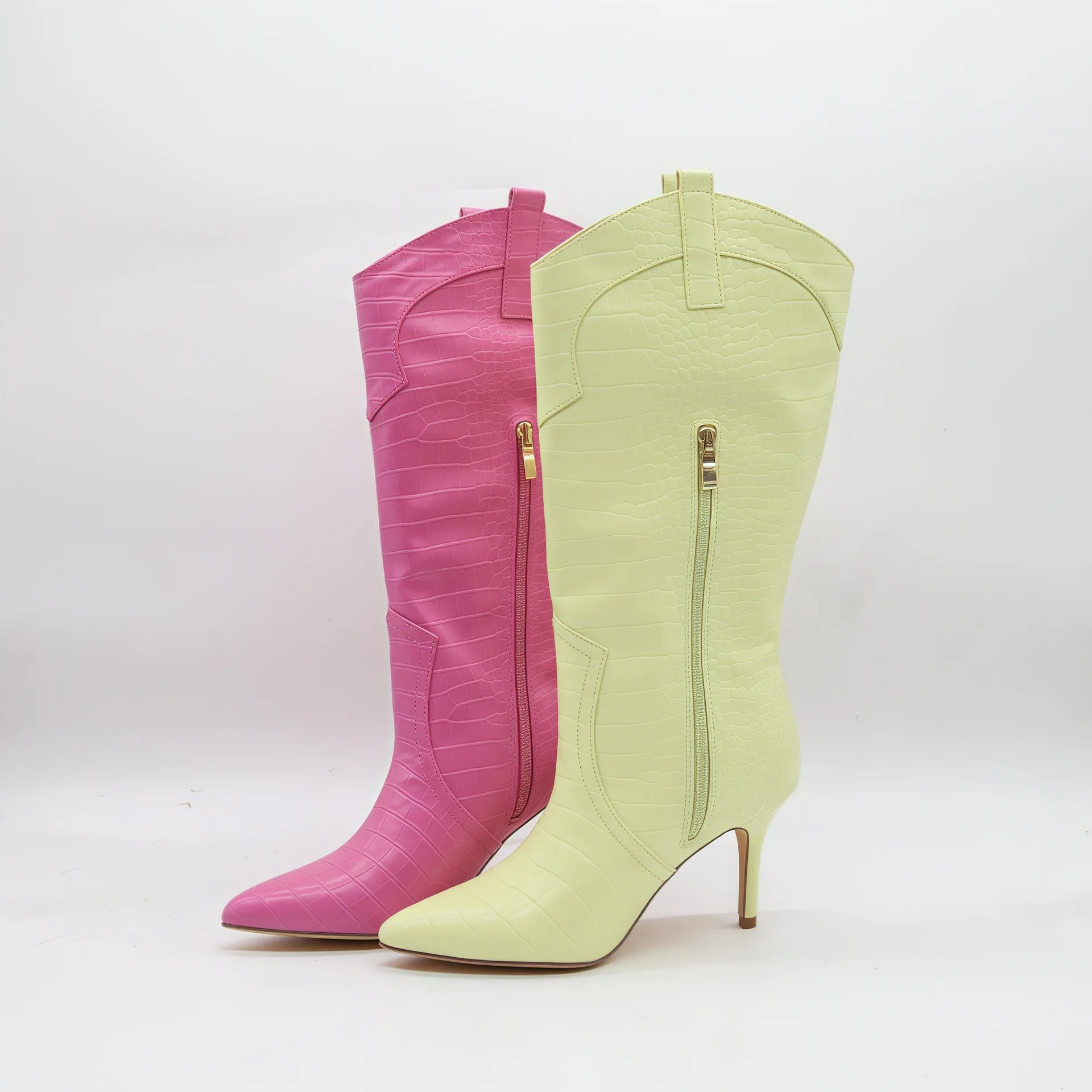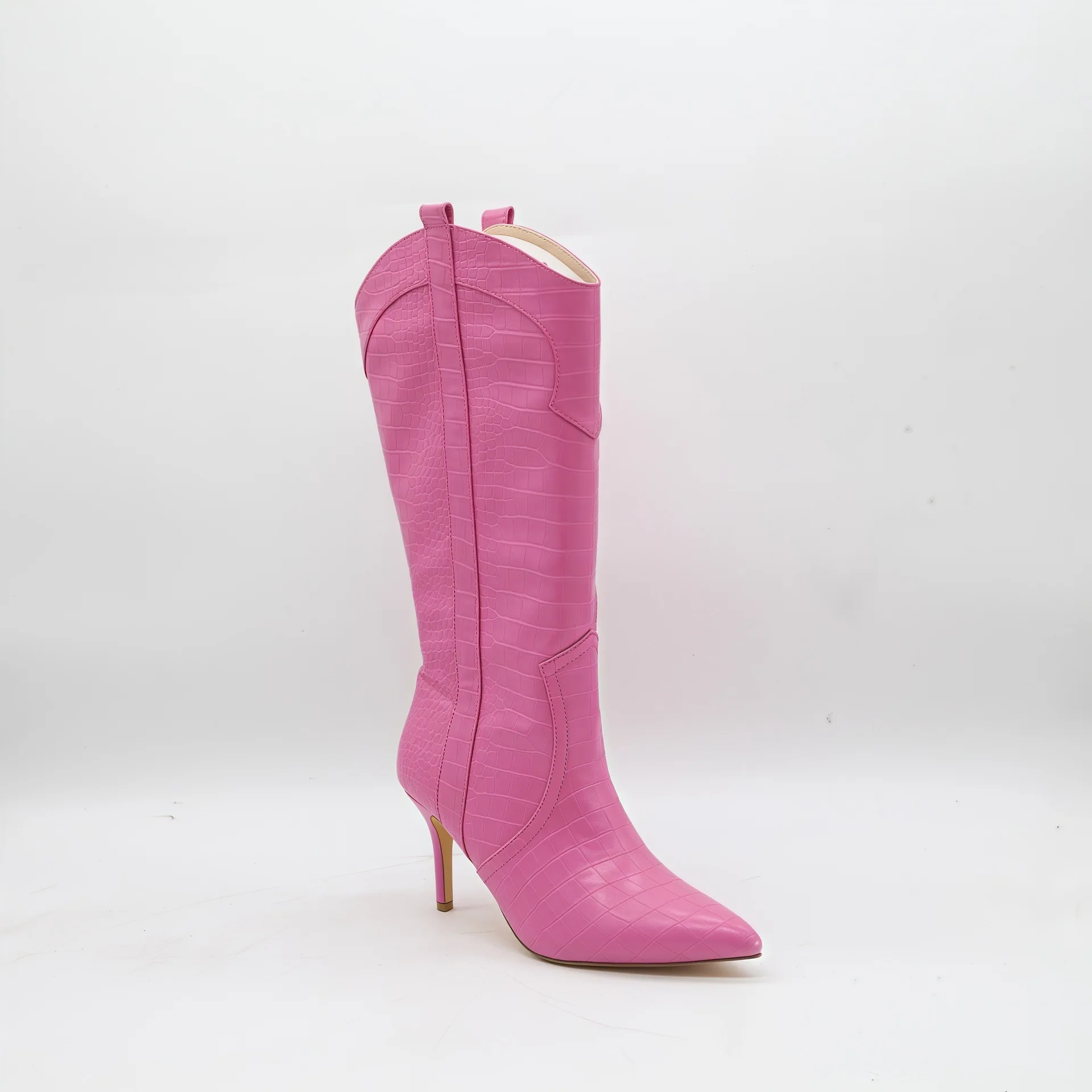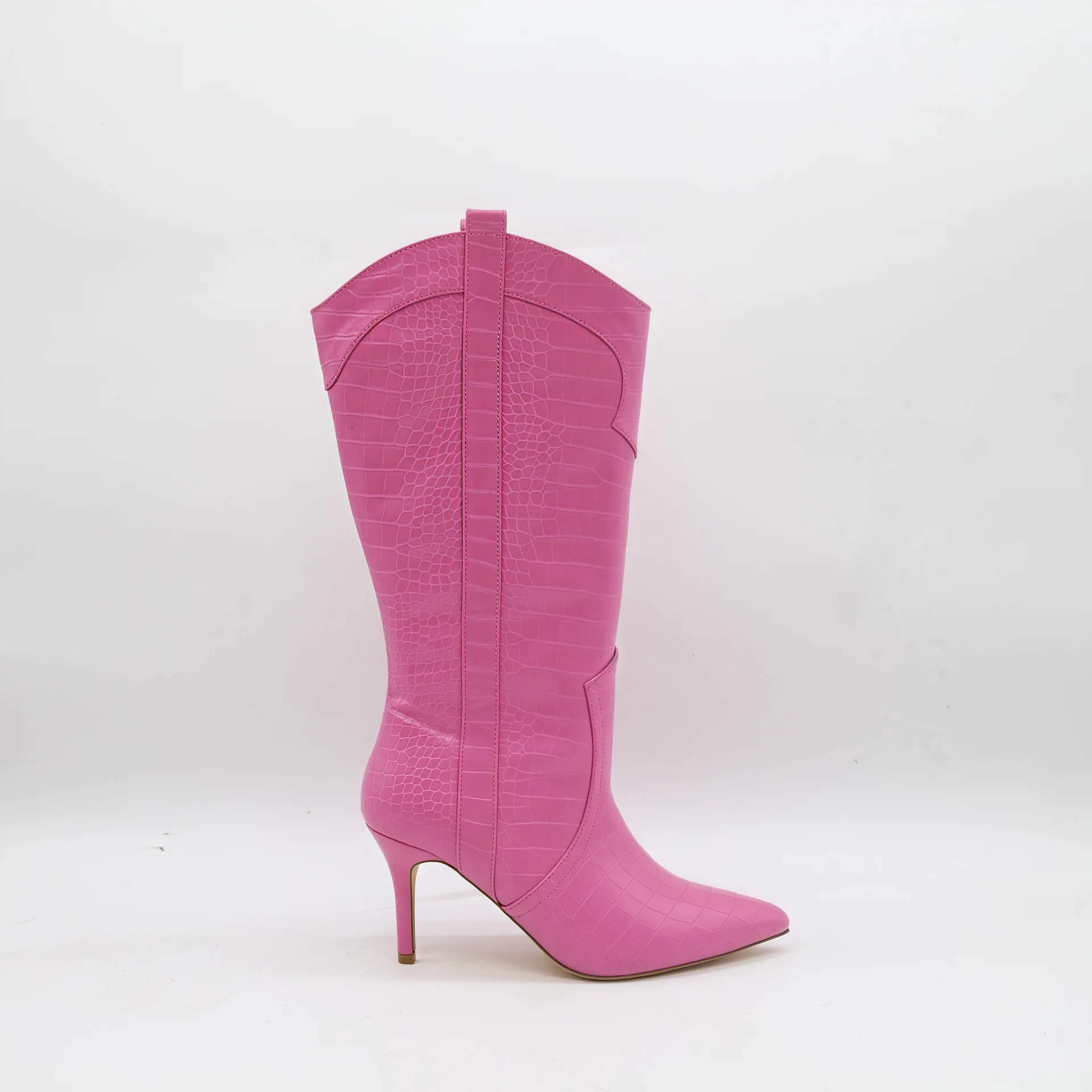 BUSY GIRL HQ1157 Wholesale Women's Hot Pink Crocodile Print Mid Claf Boots Pointed Toe Stiletto Heel Western Style Boots Warm