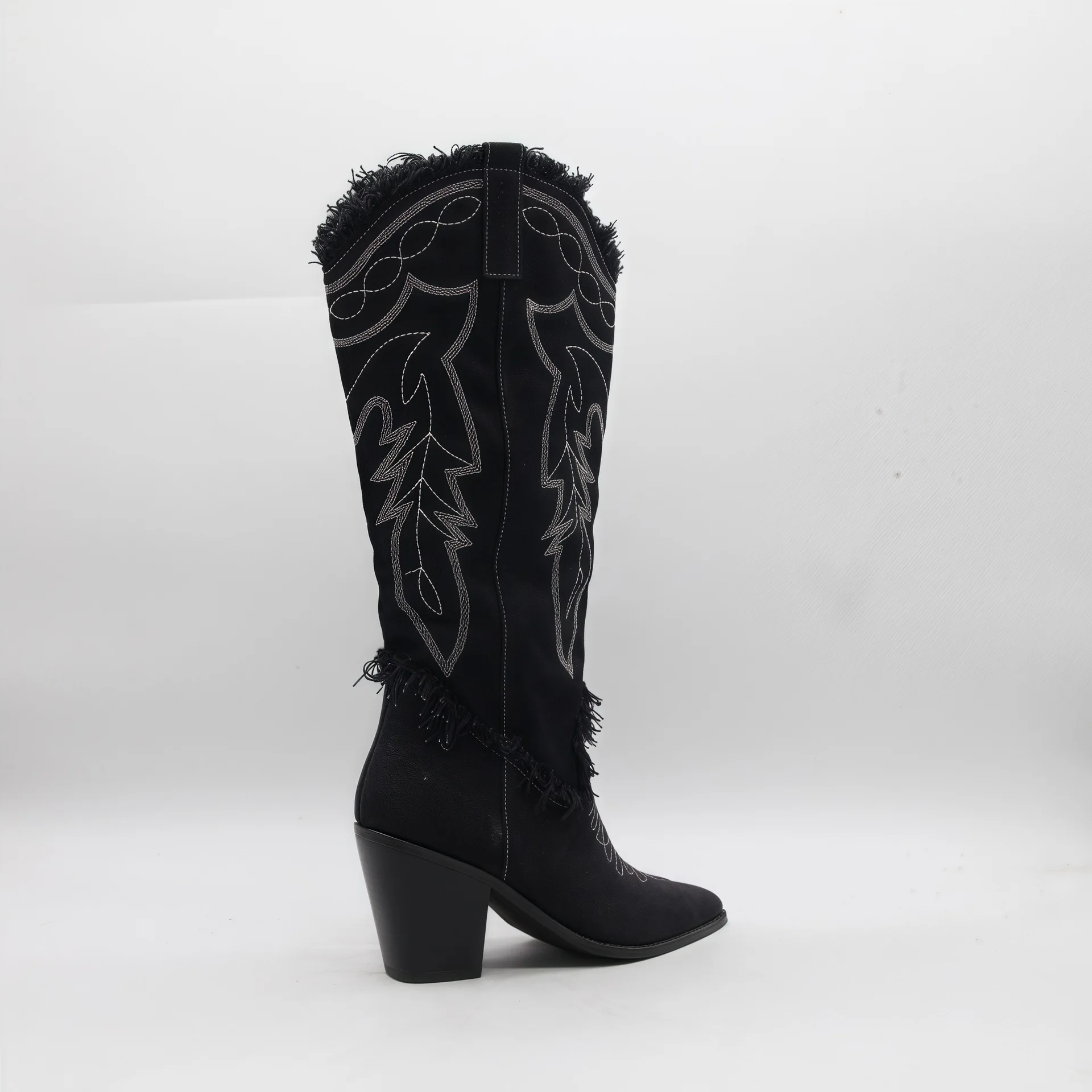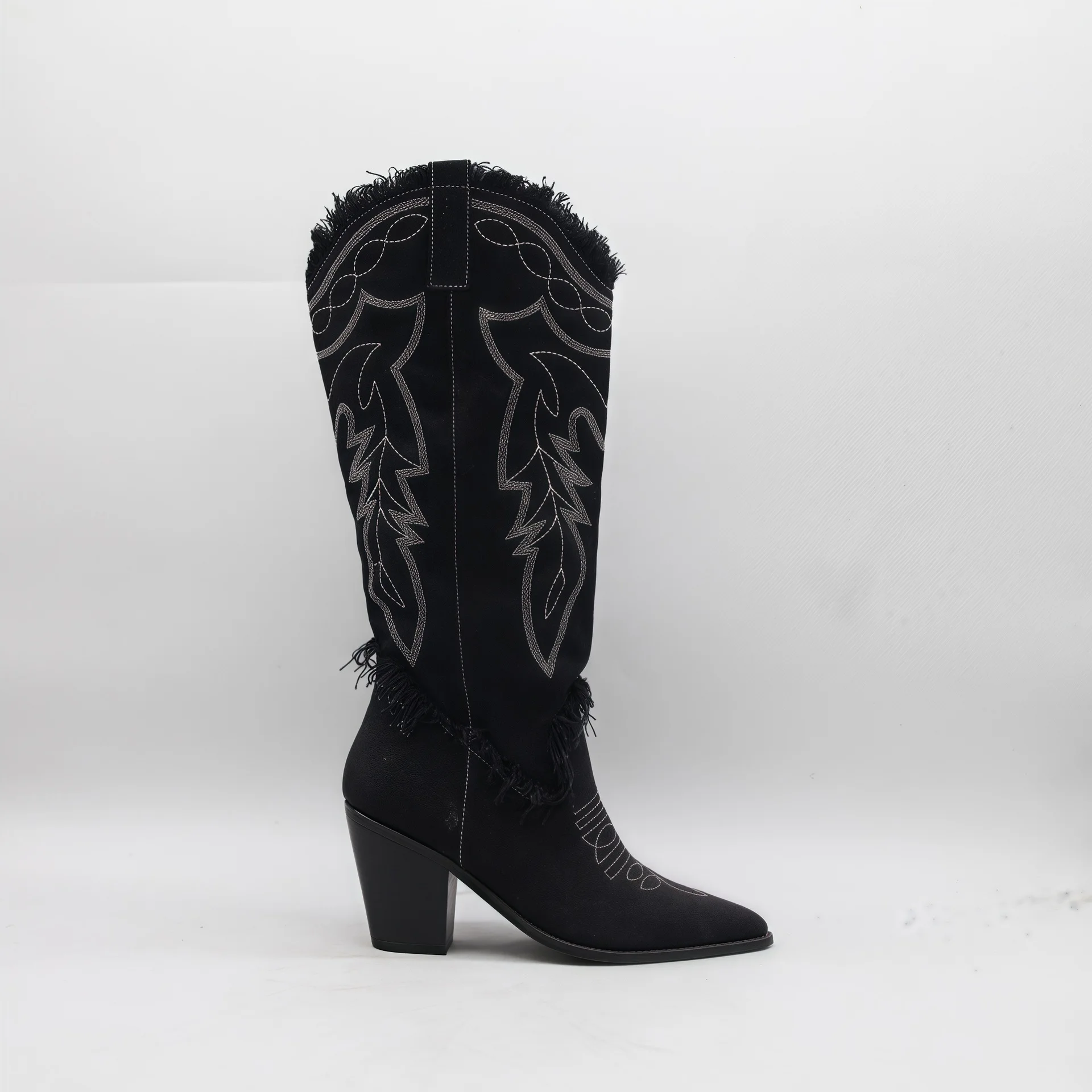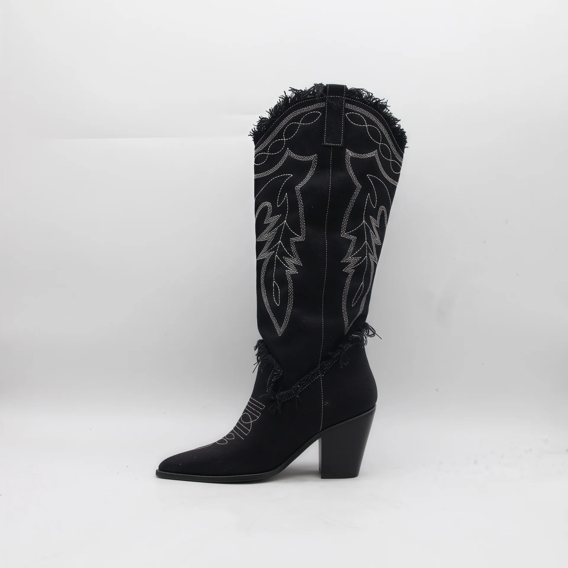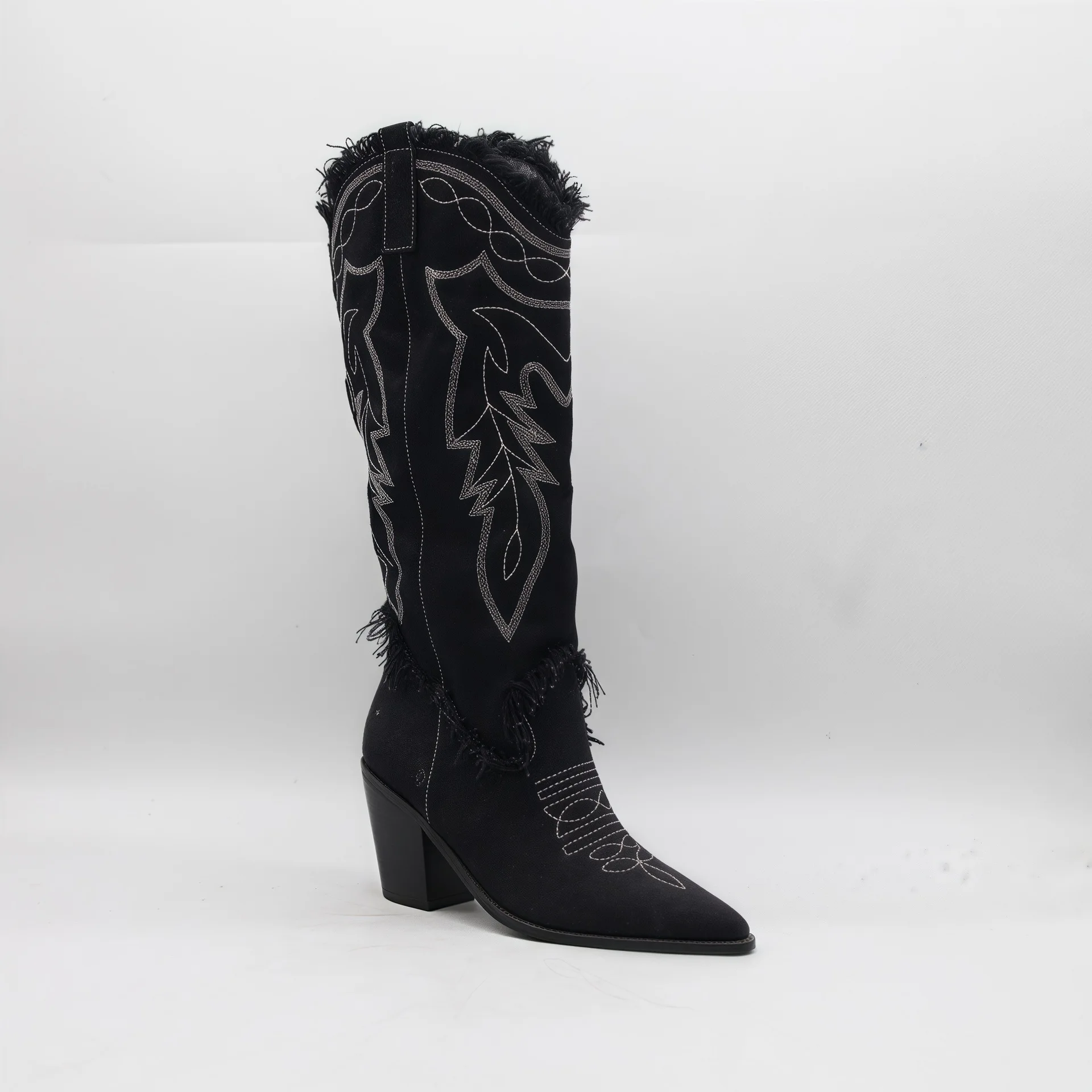 BUSY GIRL HQ1159 Custom Cowboy Boots Women's Black Western Cowboy Boots with Intricate Embroidery Fringe Pointed Toe Block Heel