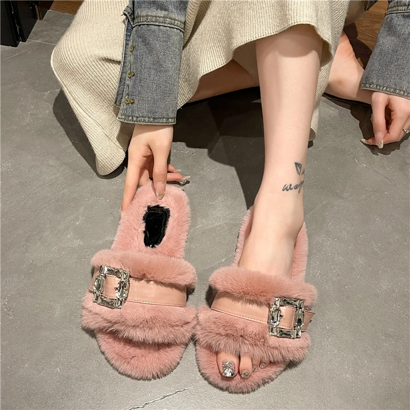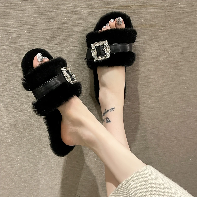 2023 Slippers Women Summer Ladies Square Toe Flat Slides Fashion Woman Metal Decoration Female Women's Sandals Beach Lady Shoes