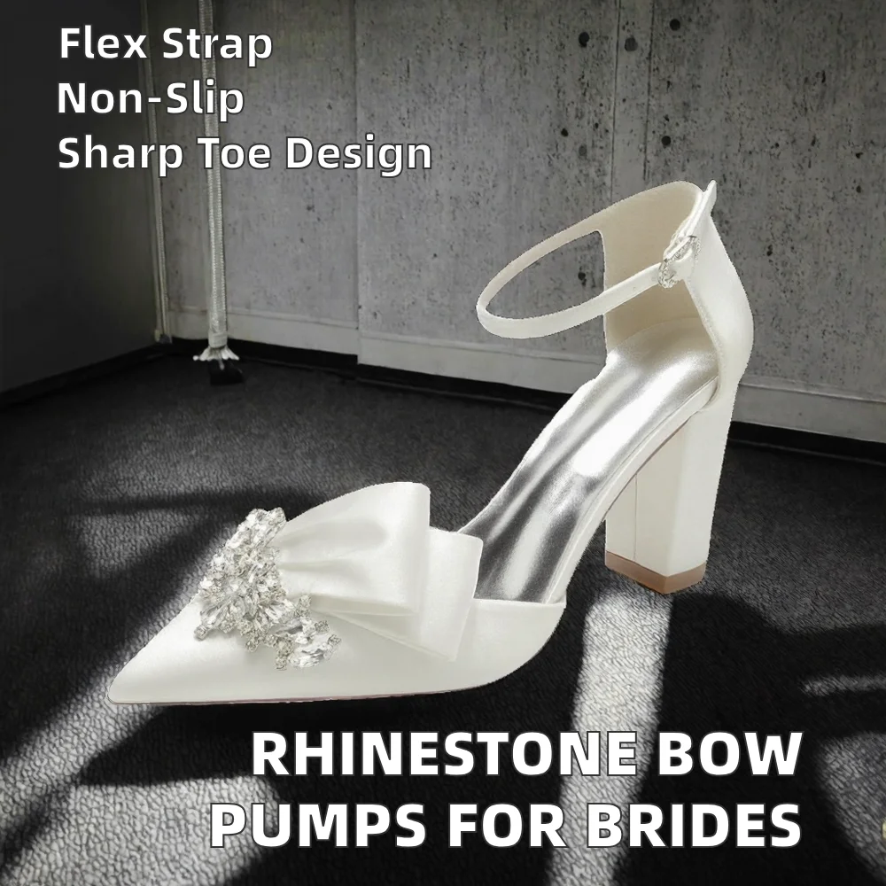 Adjustable Strap High Heeled Dress Shoes for Women Closed-Toe Rhinestone Bow Pumps PU Insole Breathable Summer Wedding Bride