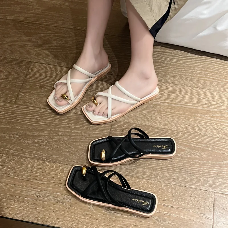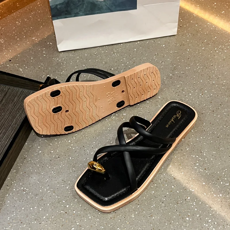 Summer Women's Fashionable Fairy Style Open Toe Indoor/Outdoor for Slippers with Golden Thumb Buckle Non-Slip Design and PVC