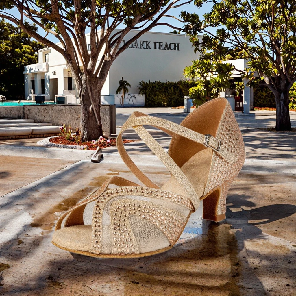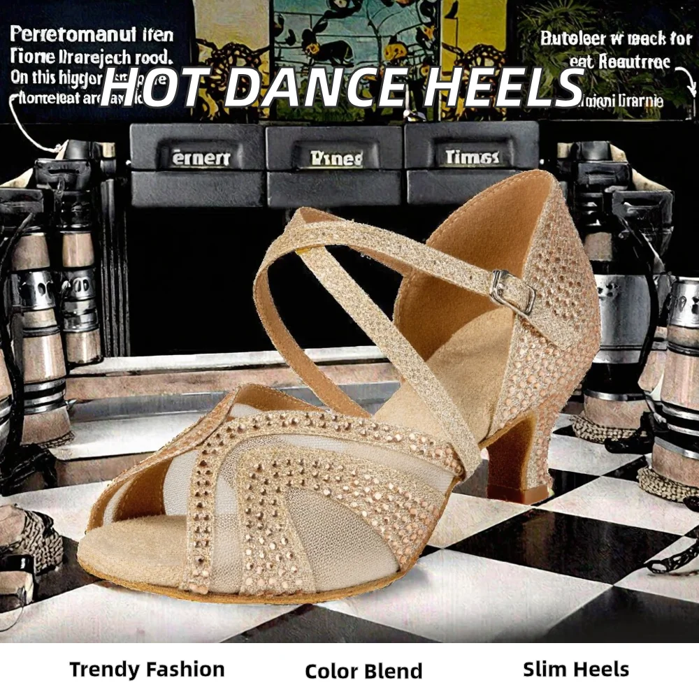 New Women's Latin Dance Shoes 5.5cm High Heel Hot Champagne Diamond Style Soft Bottom High Heeled Sandals for Summer Mesh Lining