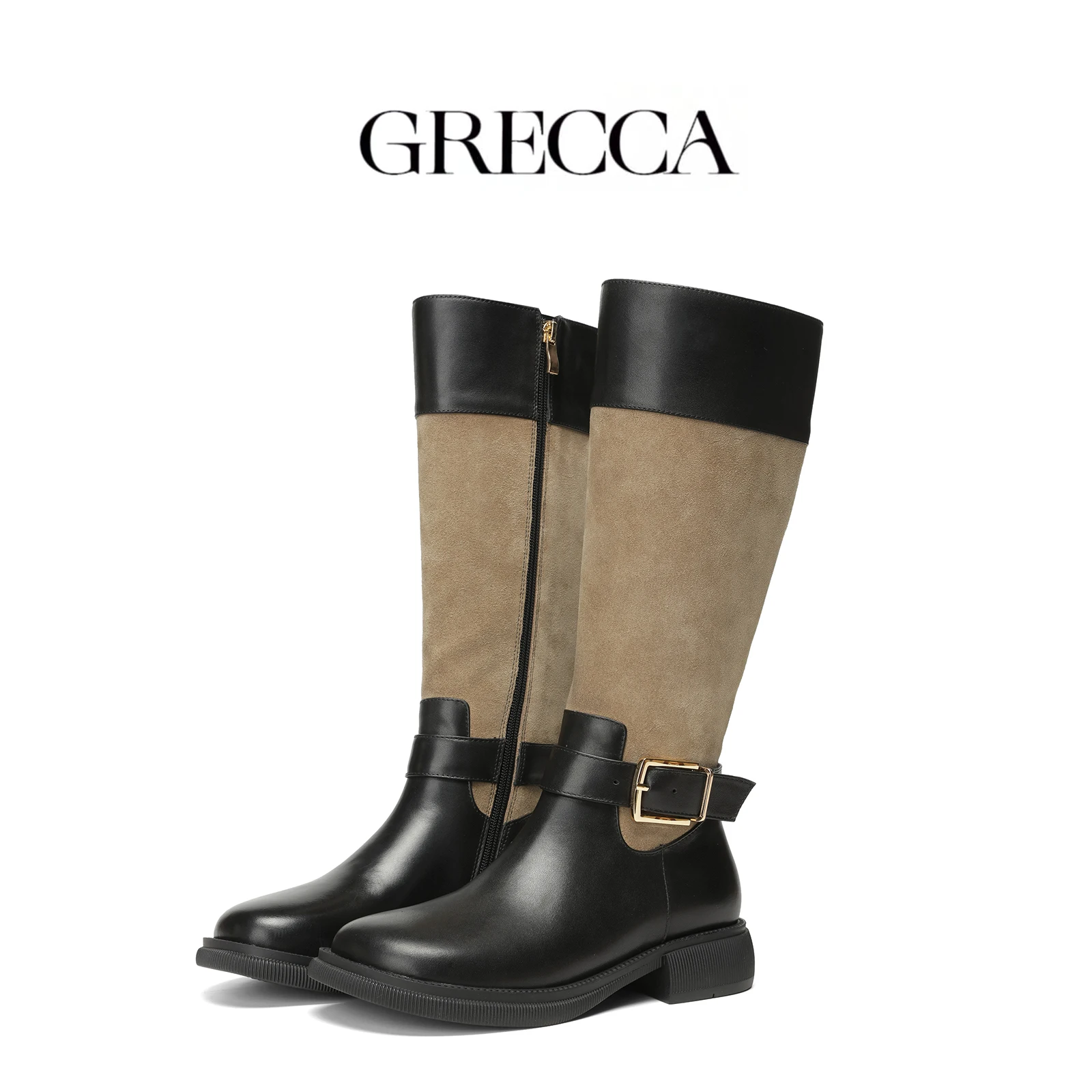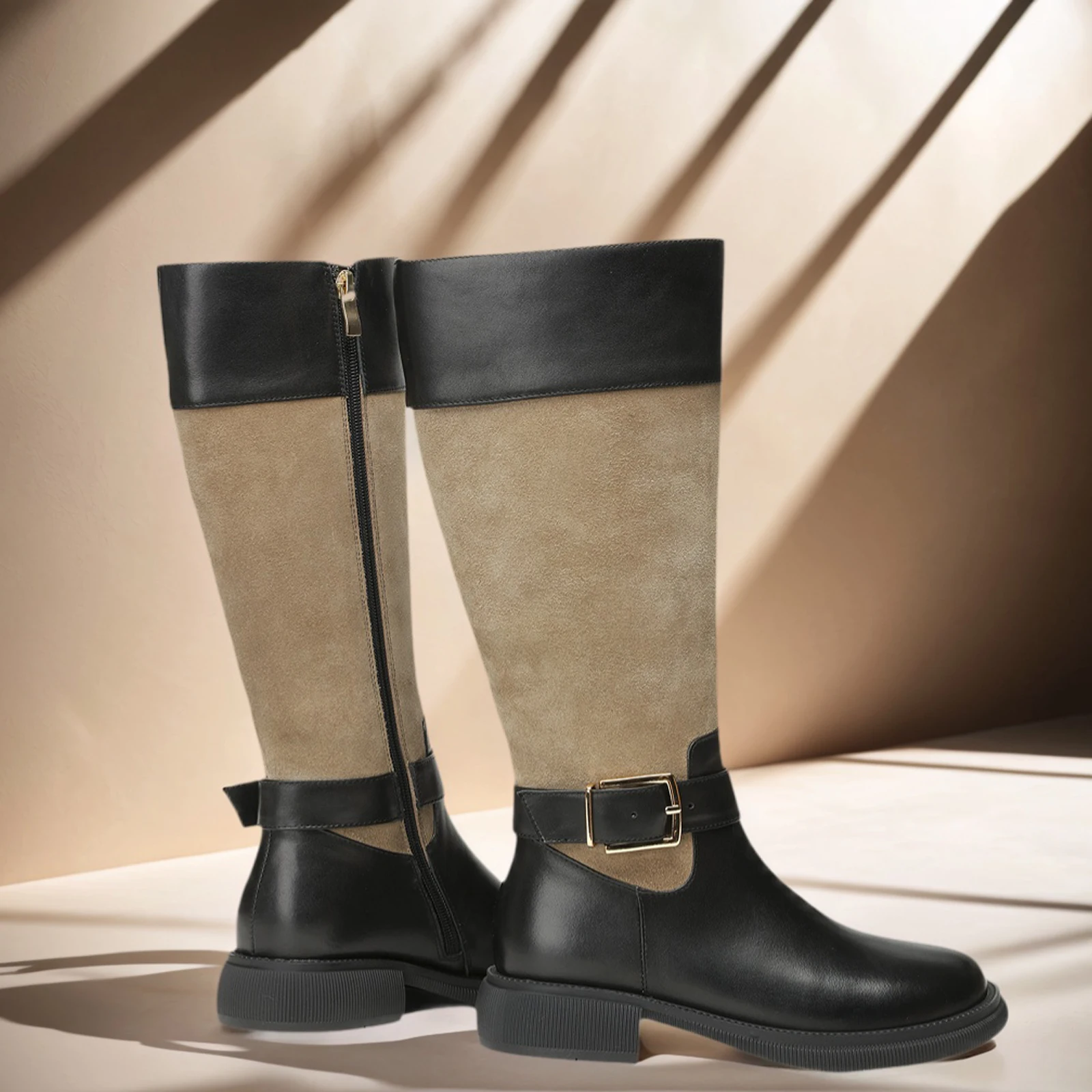 2026 New Arrival Low Heel High Boots All-season Universal Cowhide Splicing Suede Belt Buckle Sleeve Western Boots