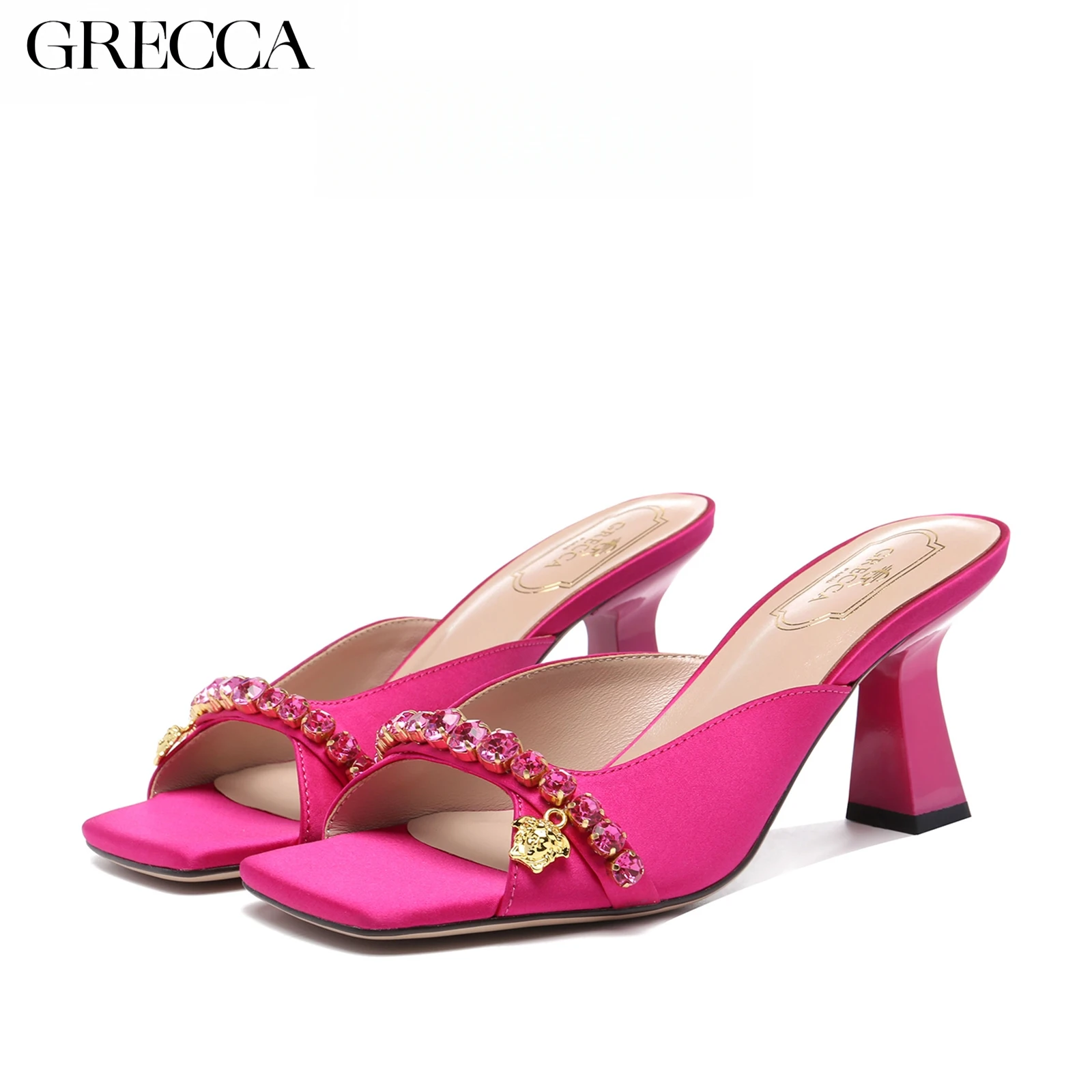 Pink Sandals With Heels by GRECCA, Gold Rhinestone Strap, Metal Badge, Square Toe - Chic Footwear for Women