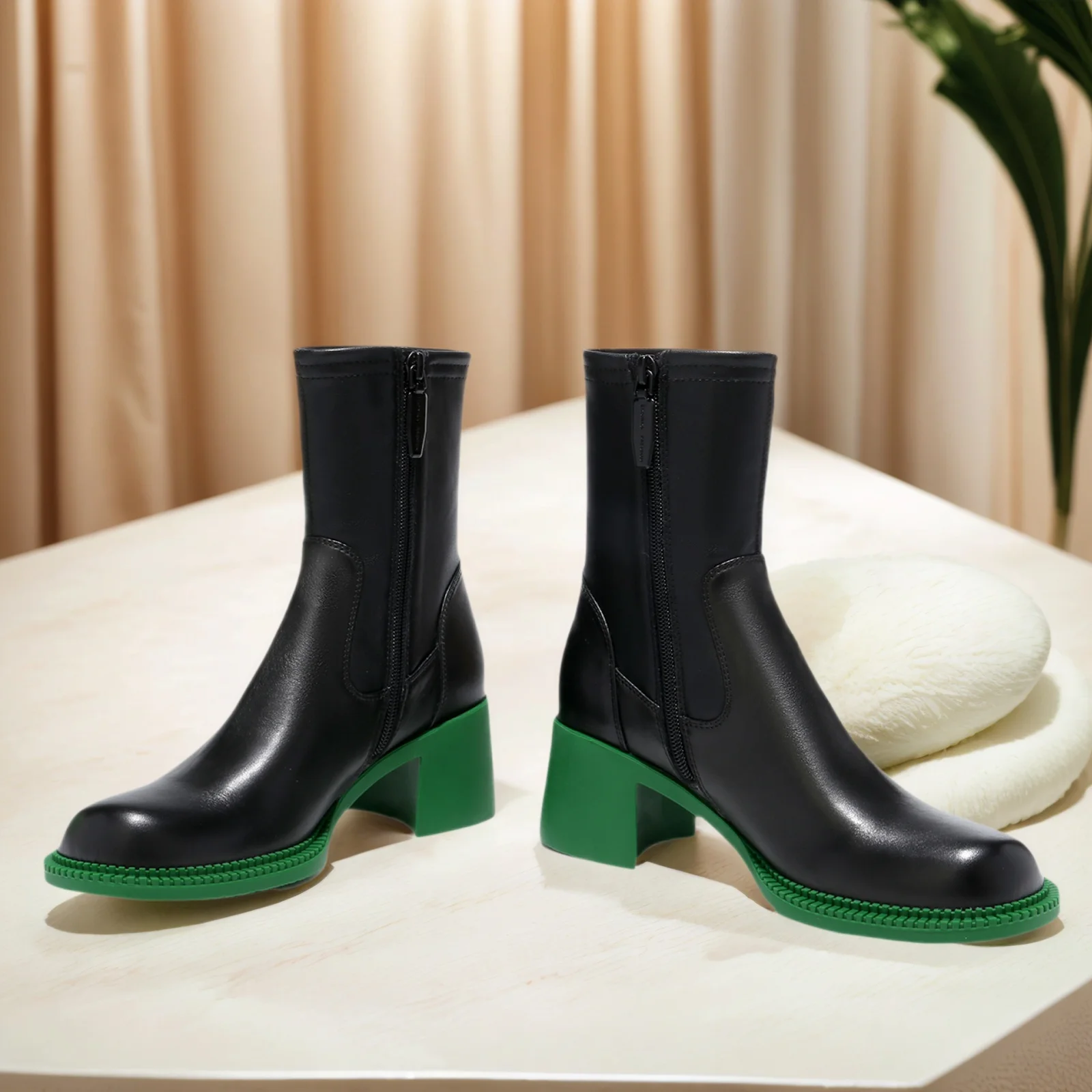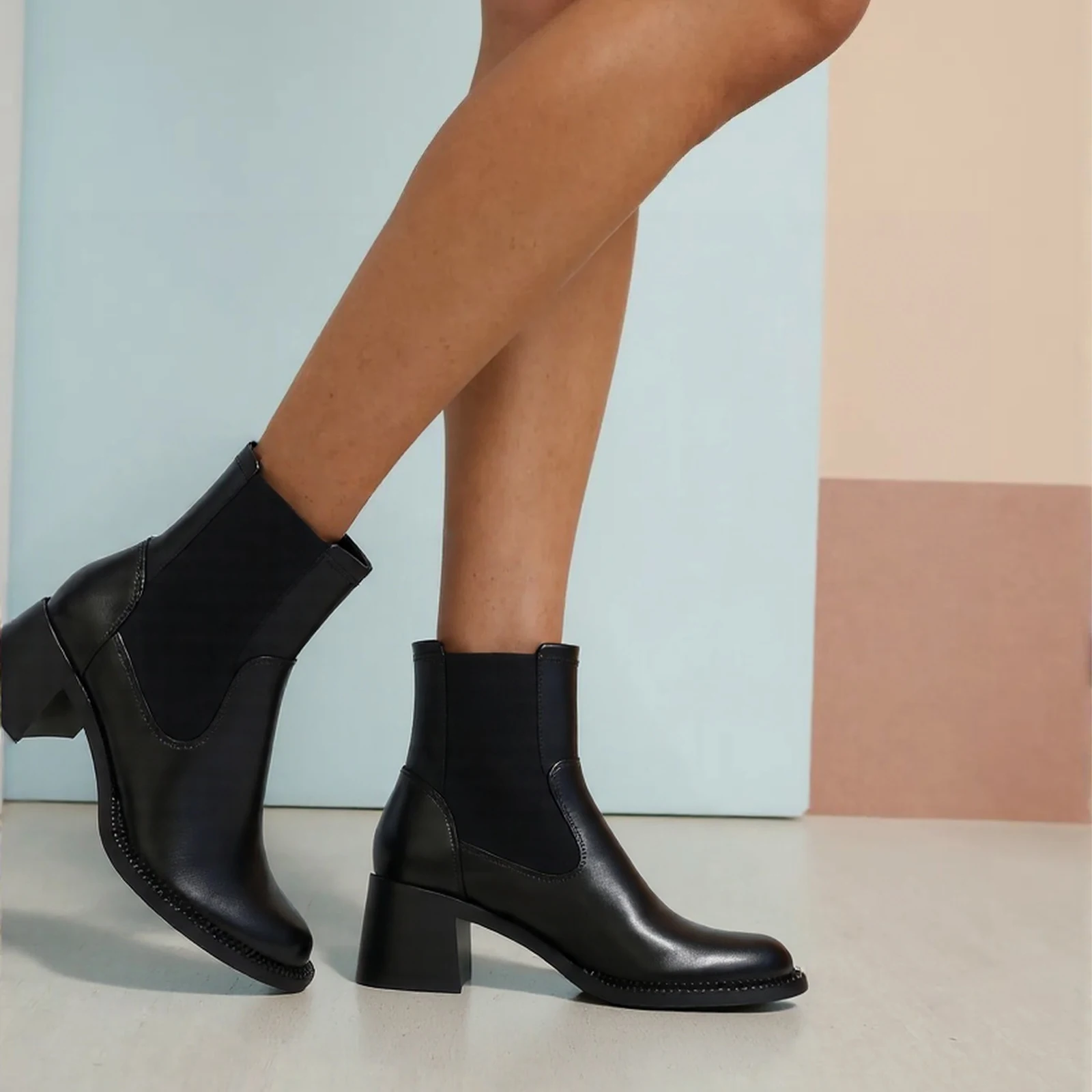 Women's Black Leather Ankle Boots, Genuine Leather, Side Zipper, Chunky Heel, Stylish Comfortable, Perfect for Daily Office Wear