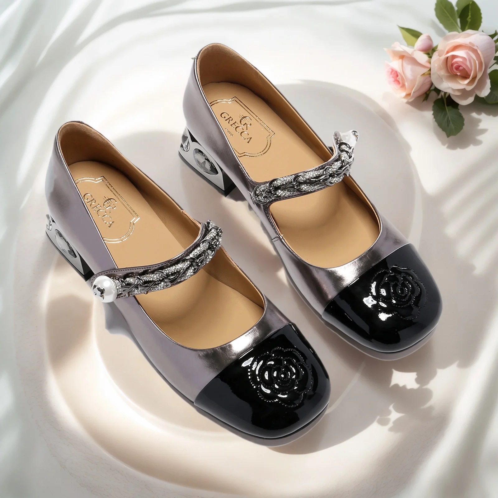 Luxury Ladies Heels in Light Blue Black Square Heel with Rhinestones Slip-on Closure Comfortable Cushioned Soft Square Toe