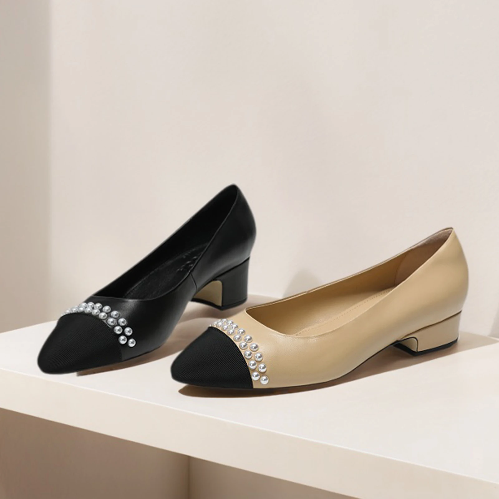 Retro Fashion Black Beige Ladies Work Pumps Big Size 35-43 Pointed Toe Hard-Wearing Rubber Outsole with Hoof Heels