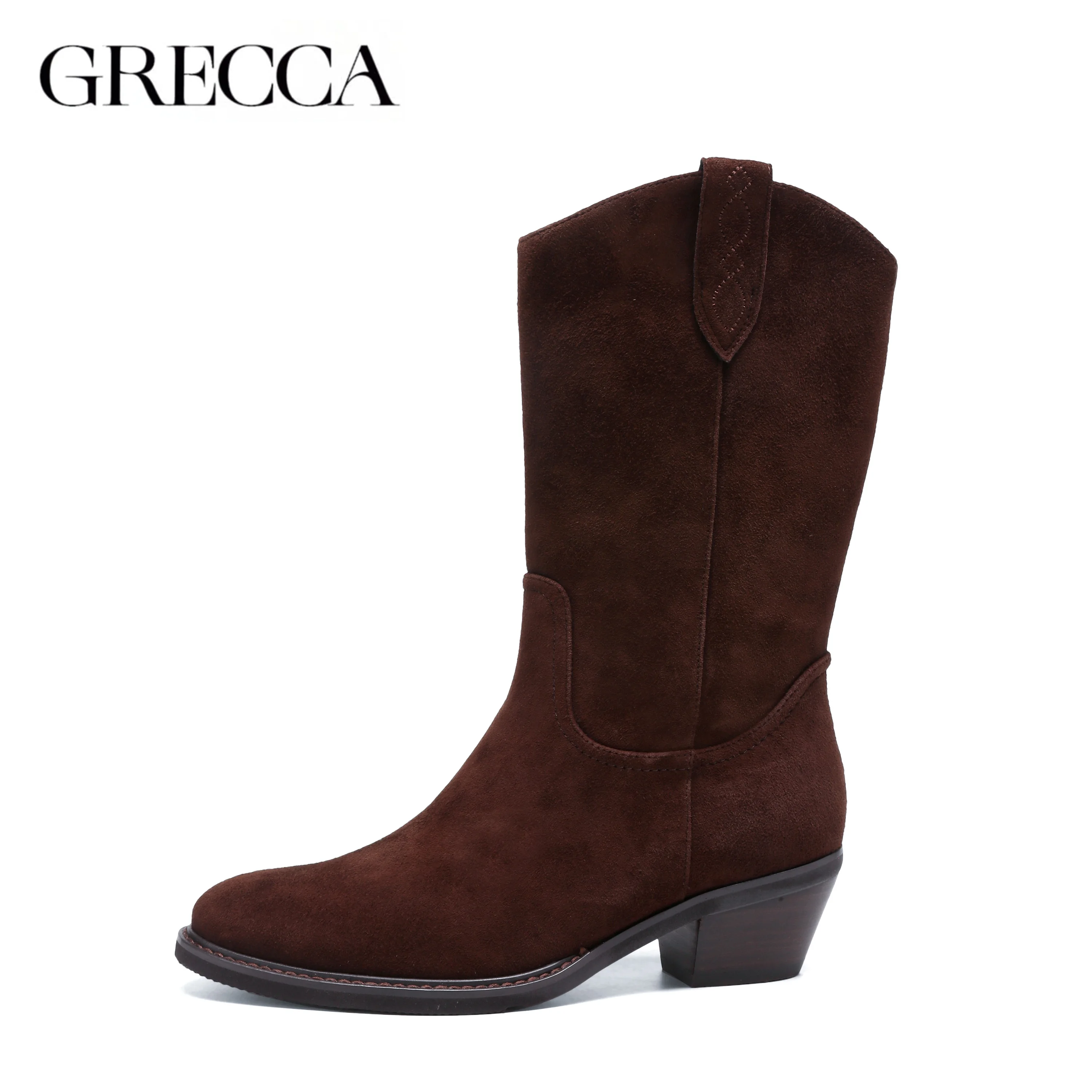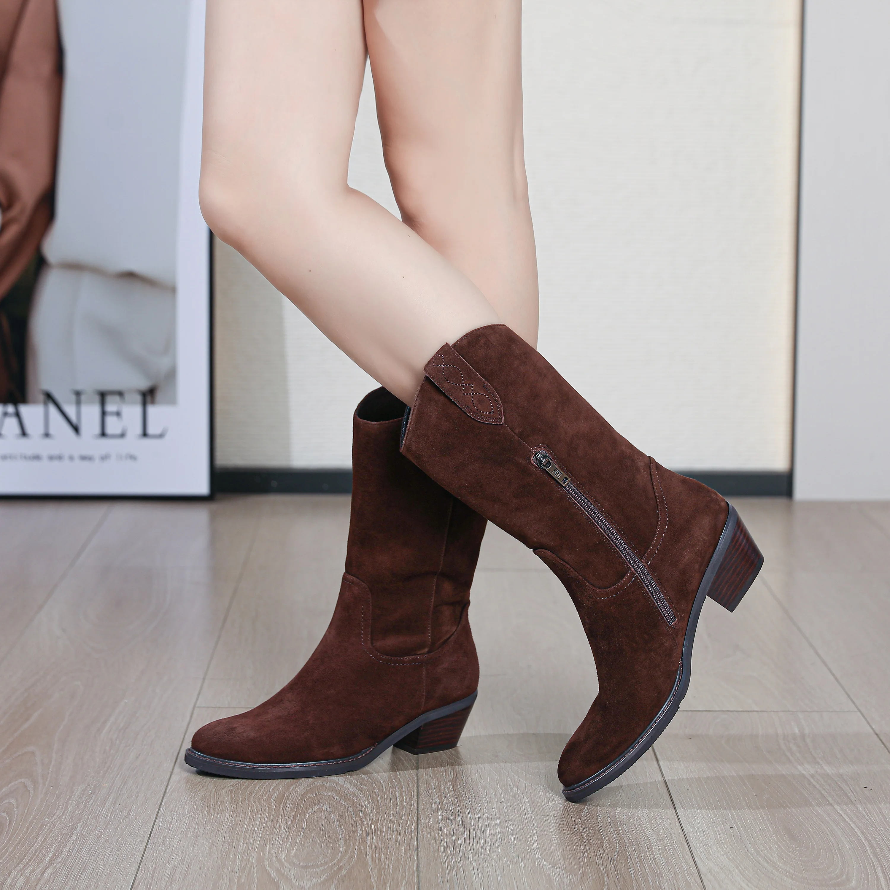 Brown Zip Closure Knight Boots Logo Custom Toe Genuine Leather Anti Slip Comfort 5cm Heel Women Cowboy Autumn Winter