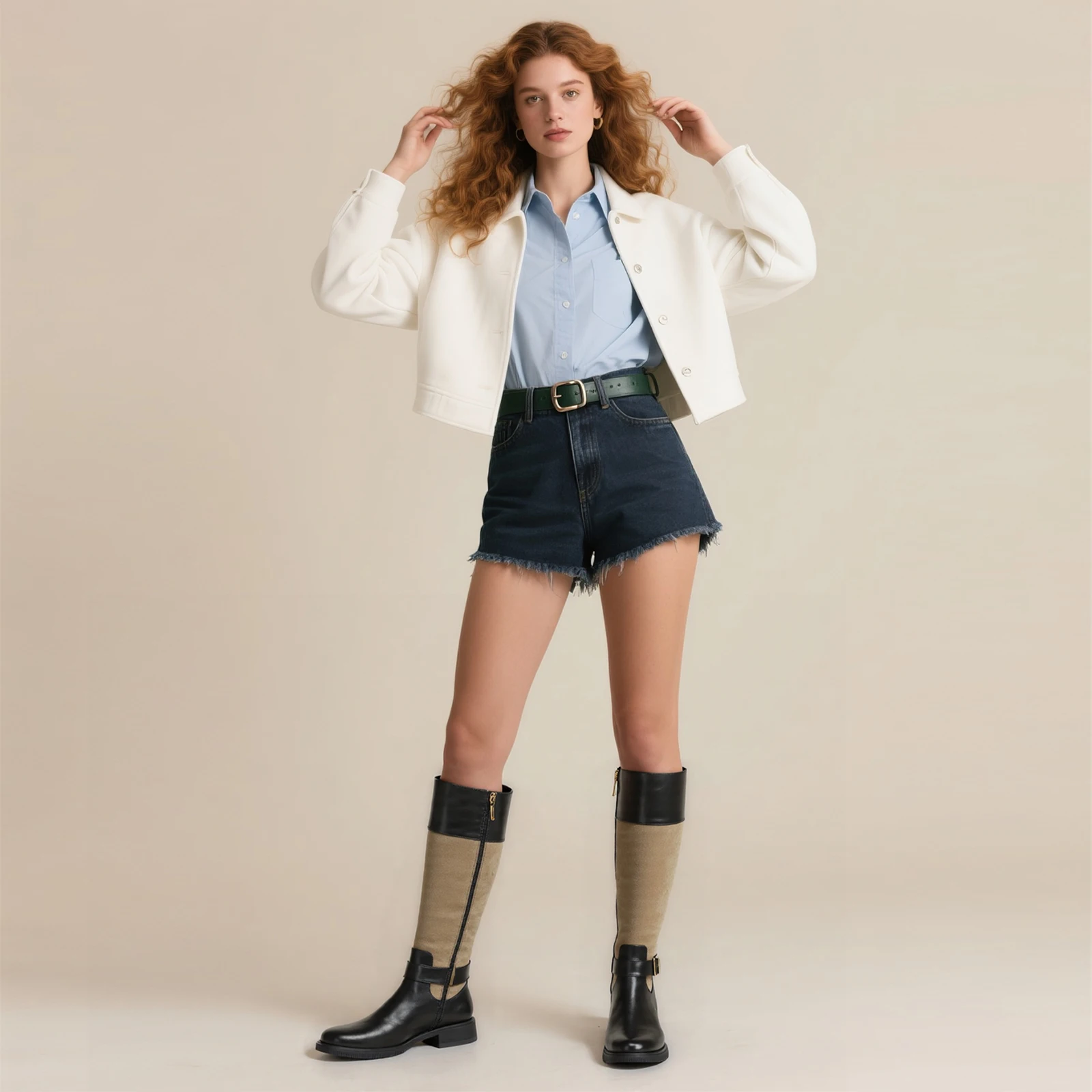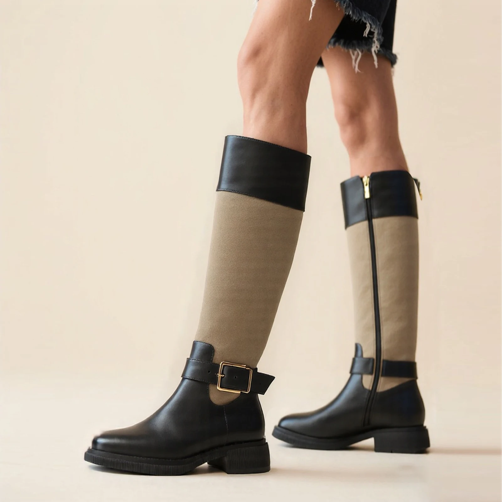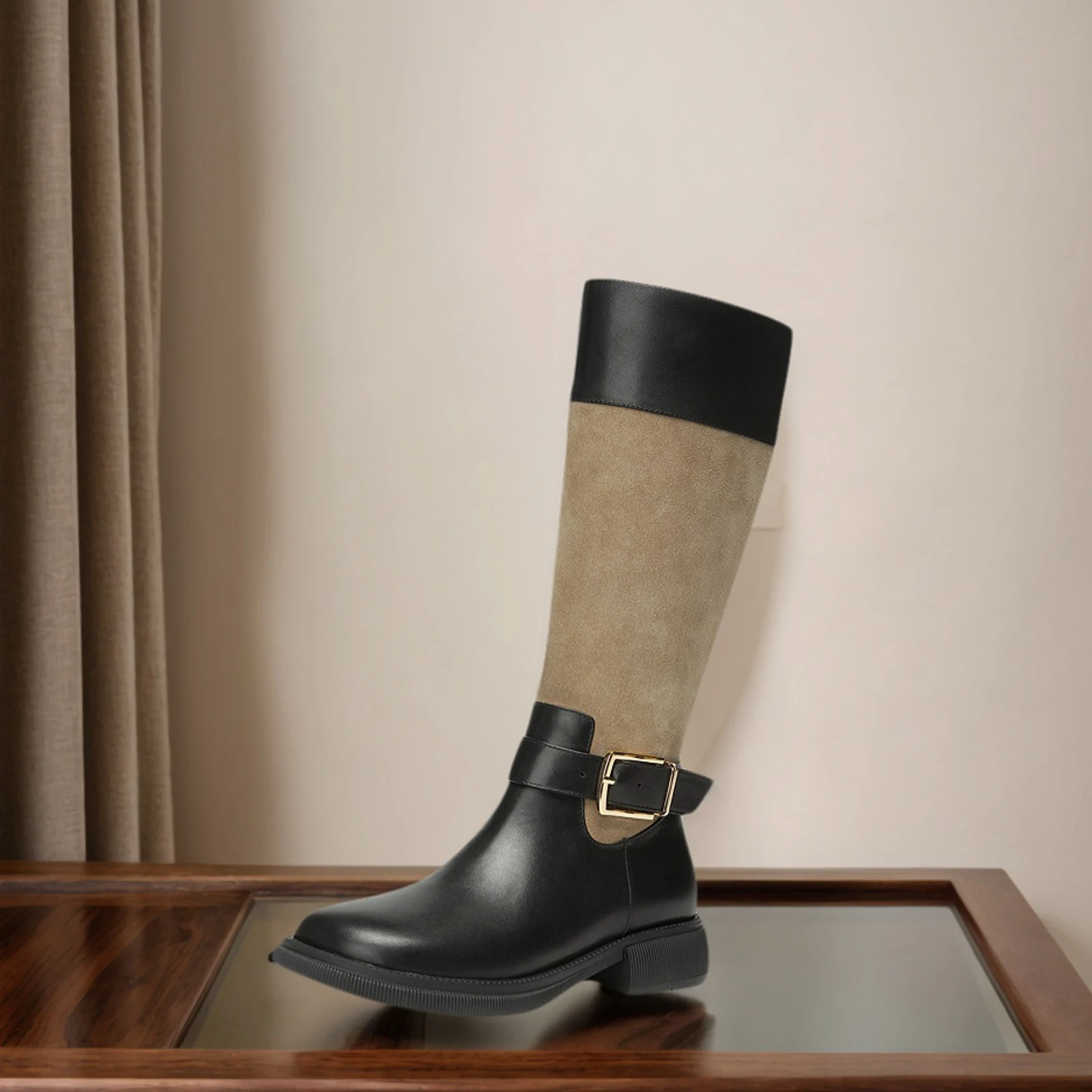 Women's Western Knee-High Boots Genuine Leather Suede Splicing Metal Buckle Detail Low Chunky Heel Comfortable Stylish Daily Use