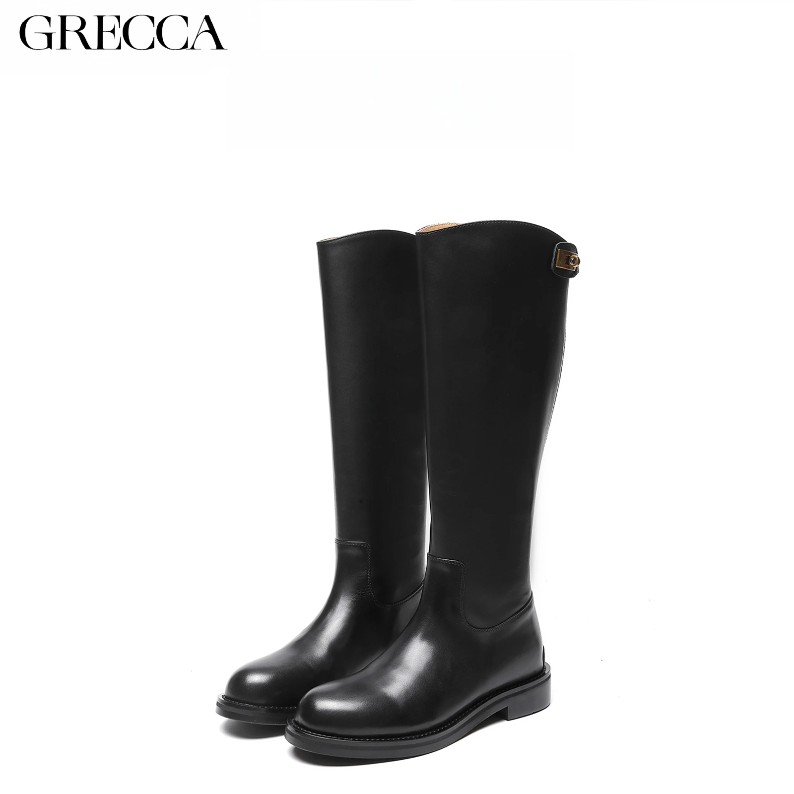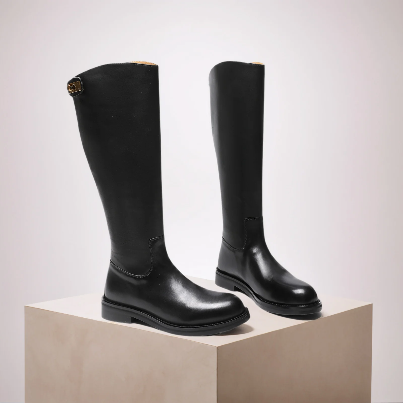 Women's Black Leather Western Knee-High Boots Genuine Leather Side Zipper Closure Elegant Design for Daily/Office/Party