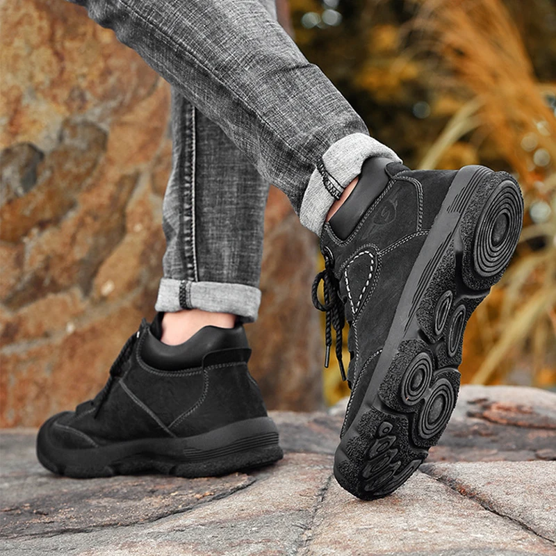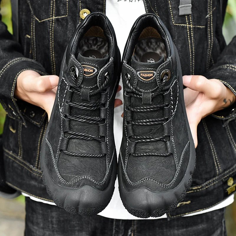 New Men Genuine Leather Causal Shoes Upper Waterproof Wear Resistant Non Slip Rubber Sole Outdoor Sport Work Hiking Shoes
