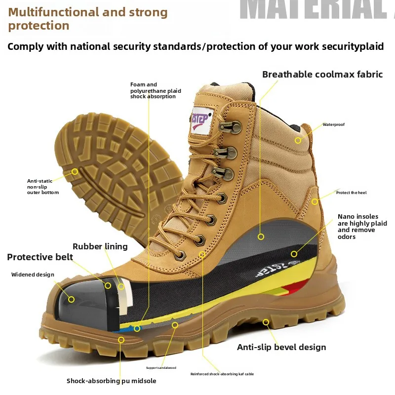 Men's Mid Cut Leather Work Boots Steel Toe Safety Shoes for Winter Summer Spring Use Mesh PU Insole Embossed for Factory Use