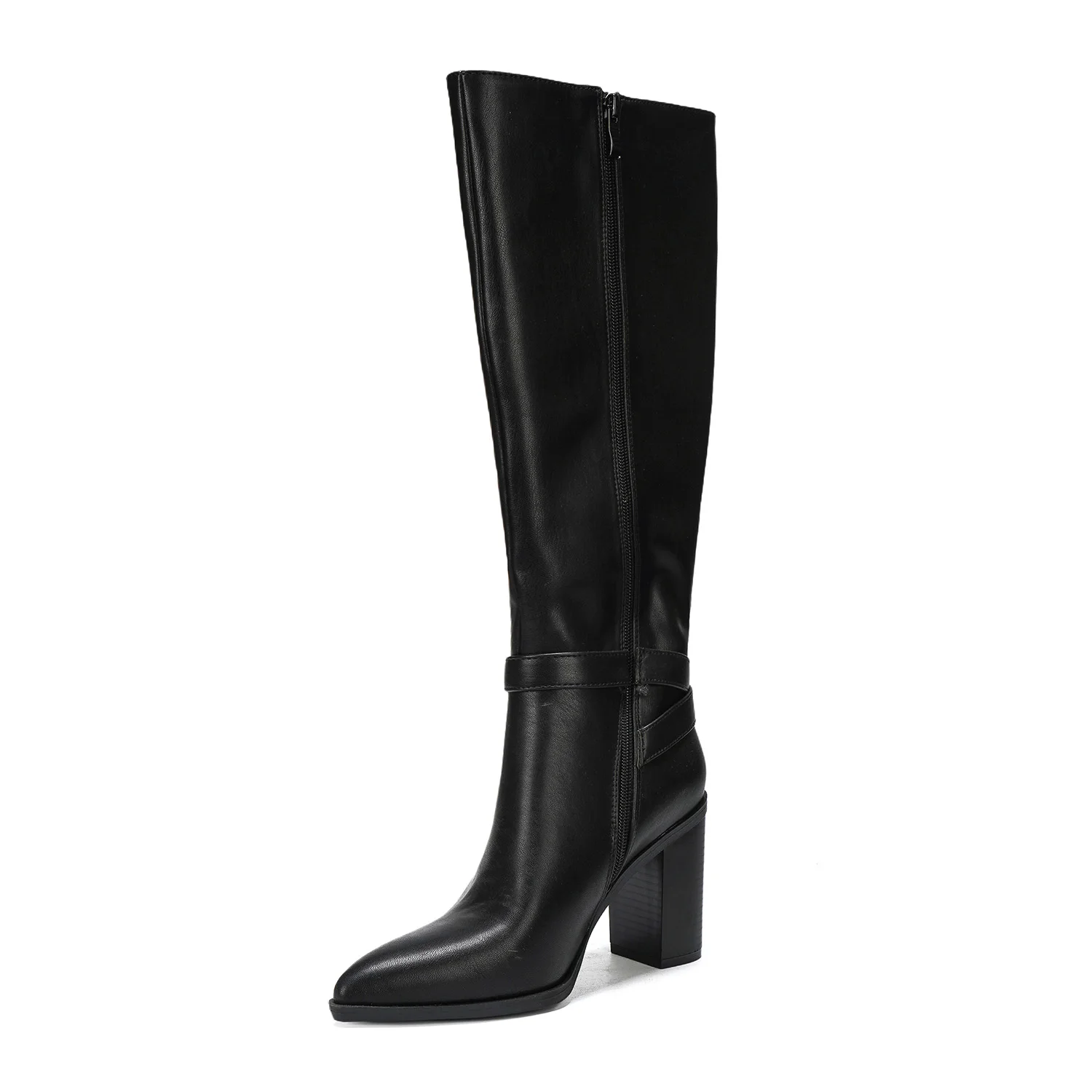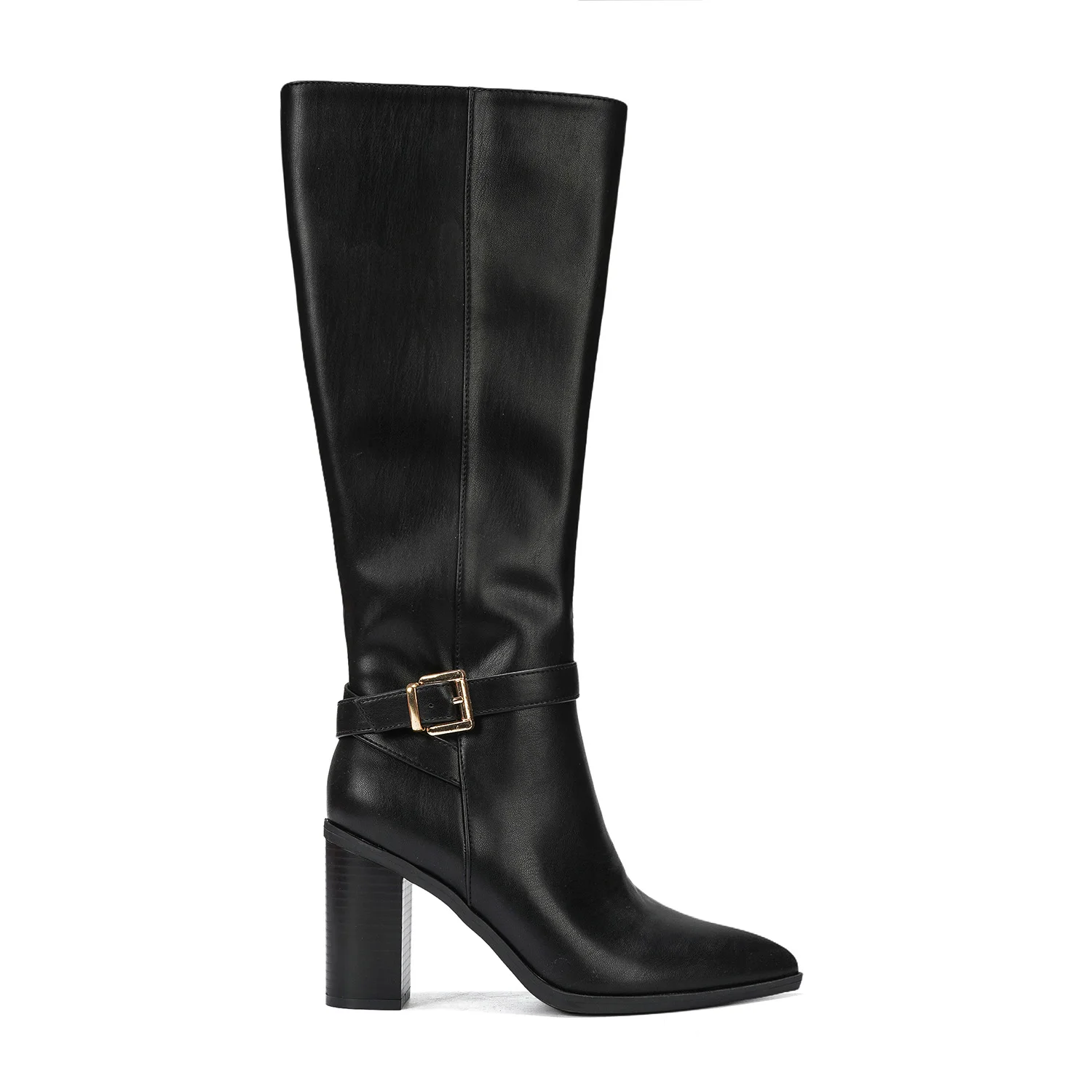 Women's Winter Knee-High Leather Boots with Solid Pattern Block-Heel & Buckle Accent Comfortable Trendy Party & Evening Footwear
