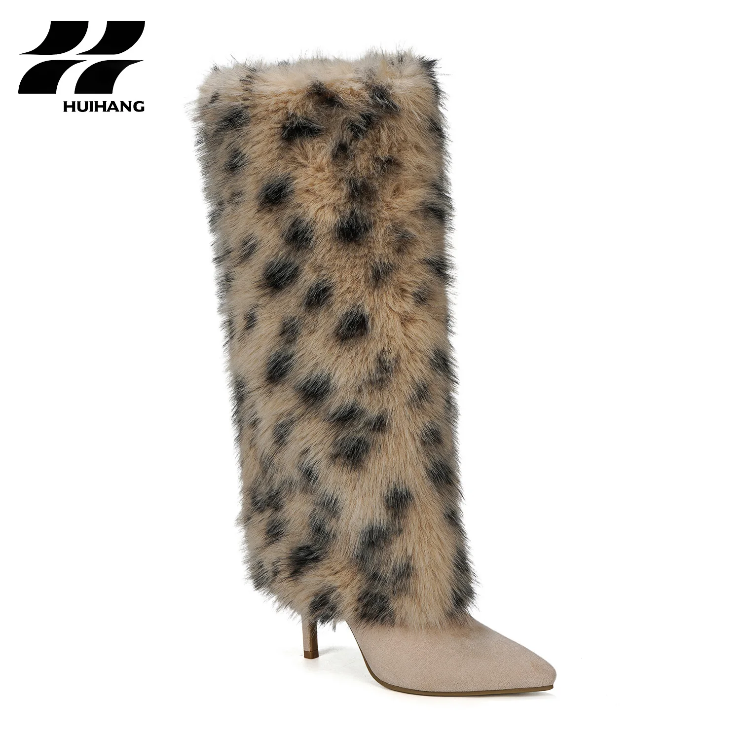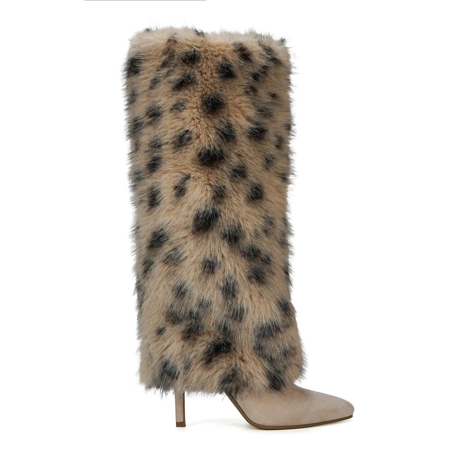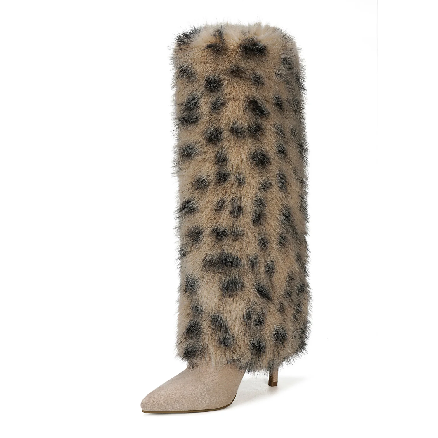Women's Trendy Leopard-Print Faux Fur Knee-High Stiletto Boots Pointed Toe Fall/Winter Party & Evening Footwear