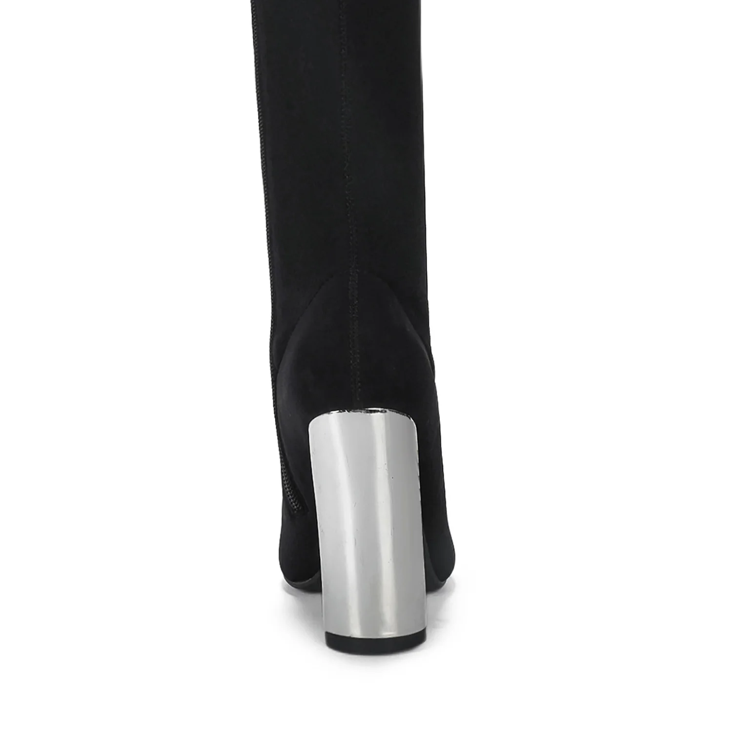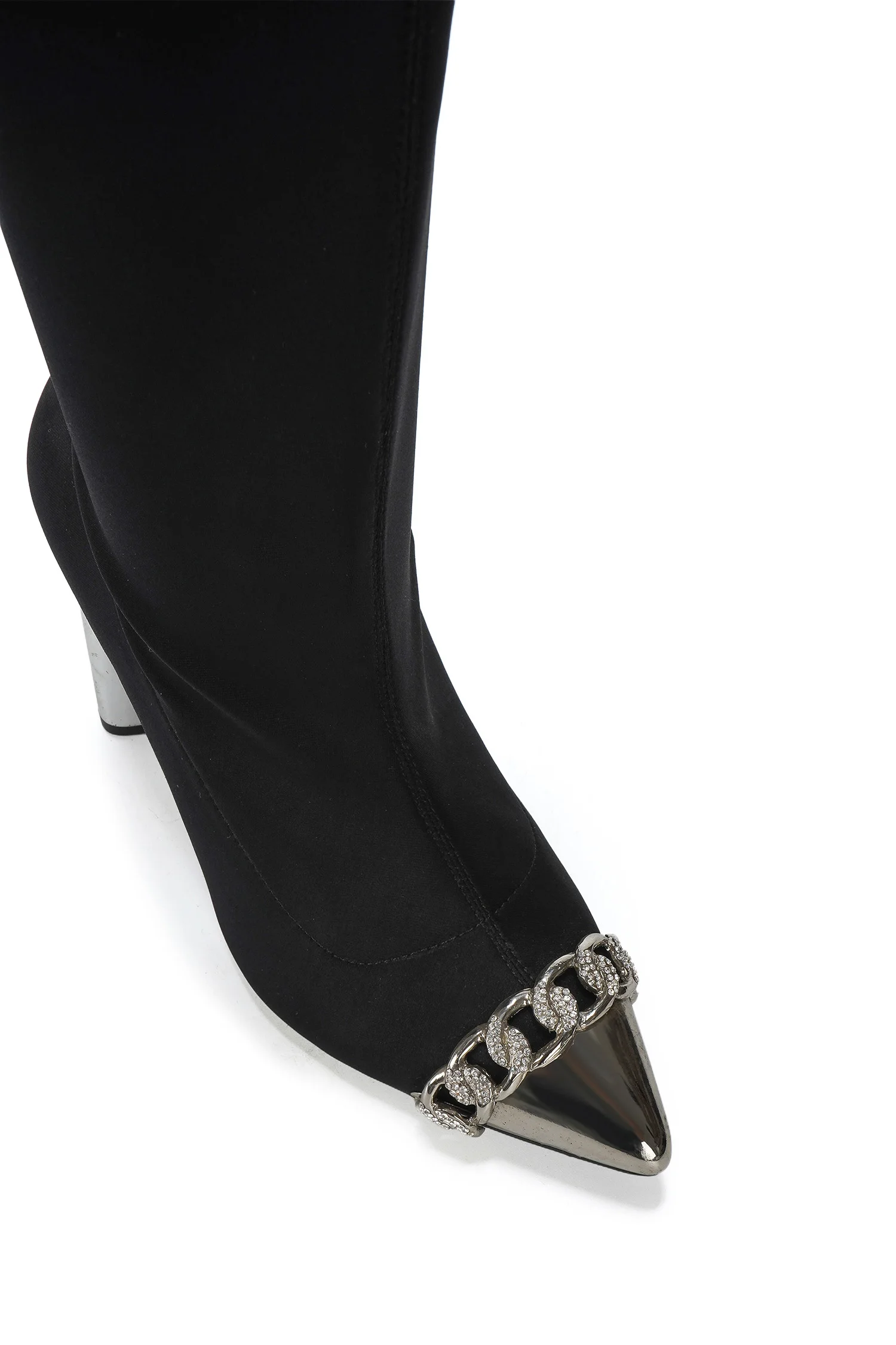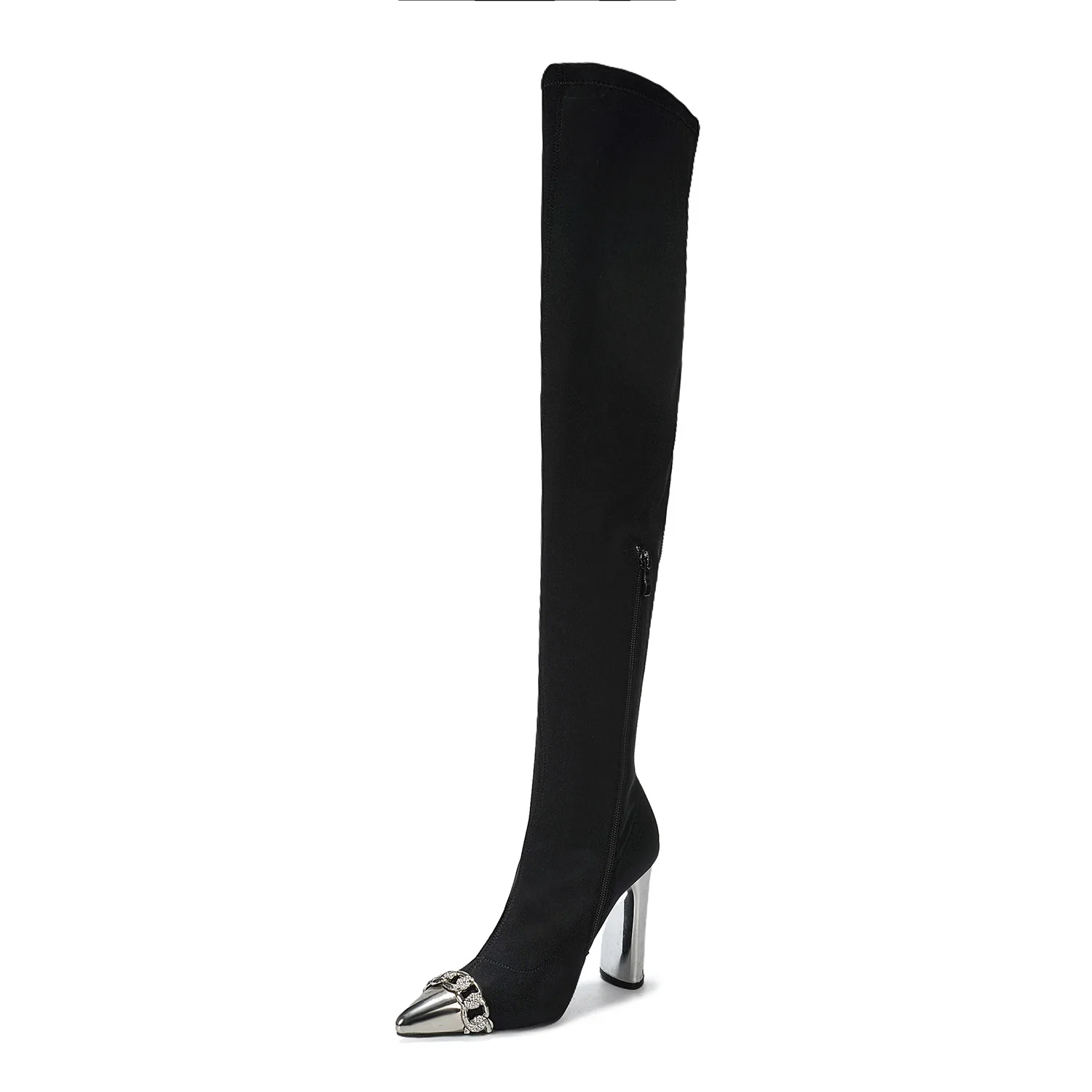 Elegant Over the Knee High Heel Boots with Rhinestone Chain Decoration and Metal Heels for Winter Party, Pointed Toe