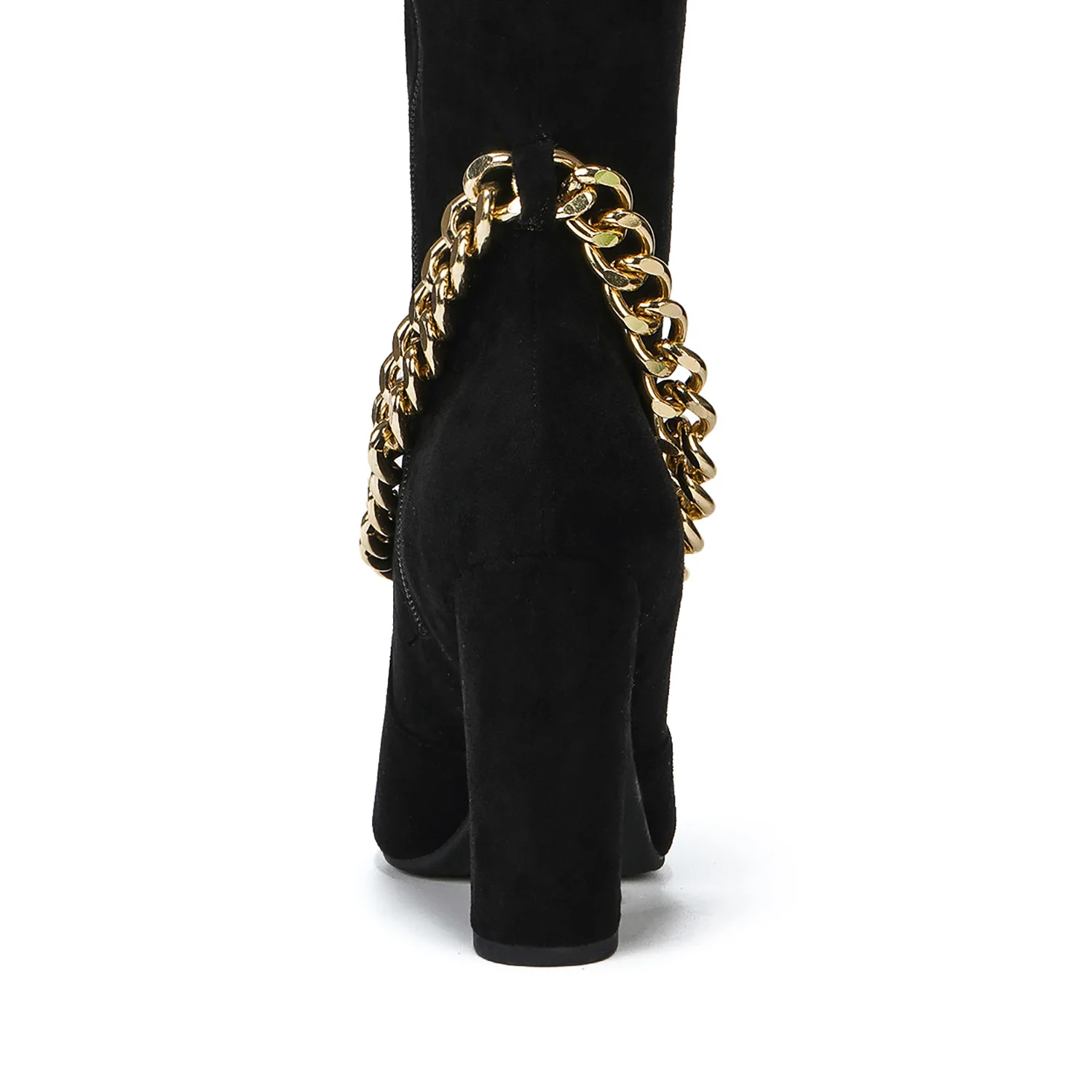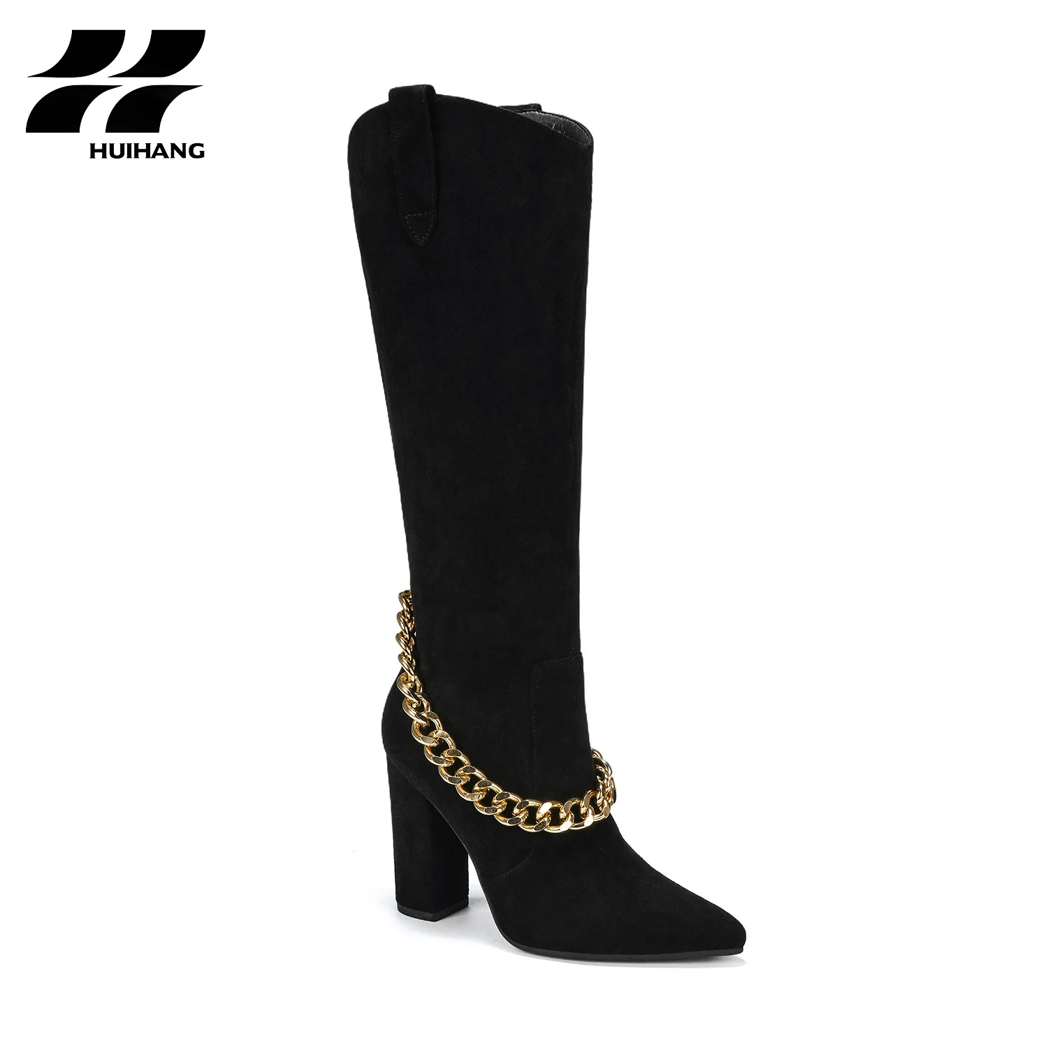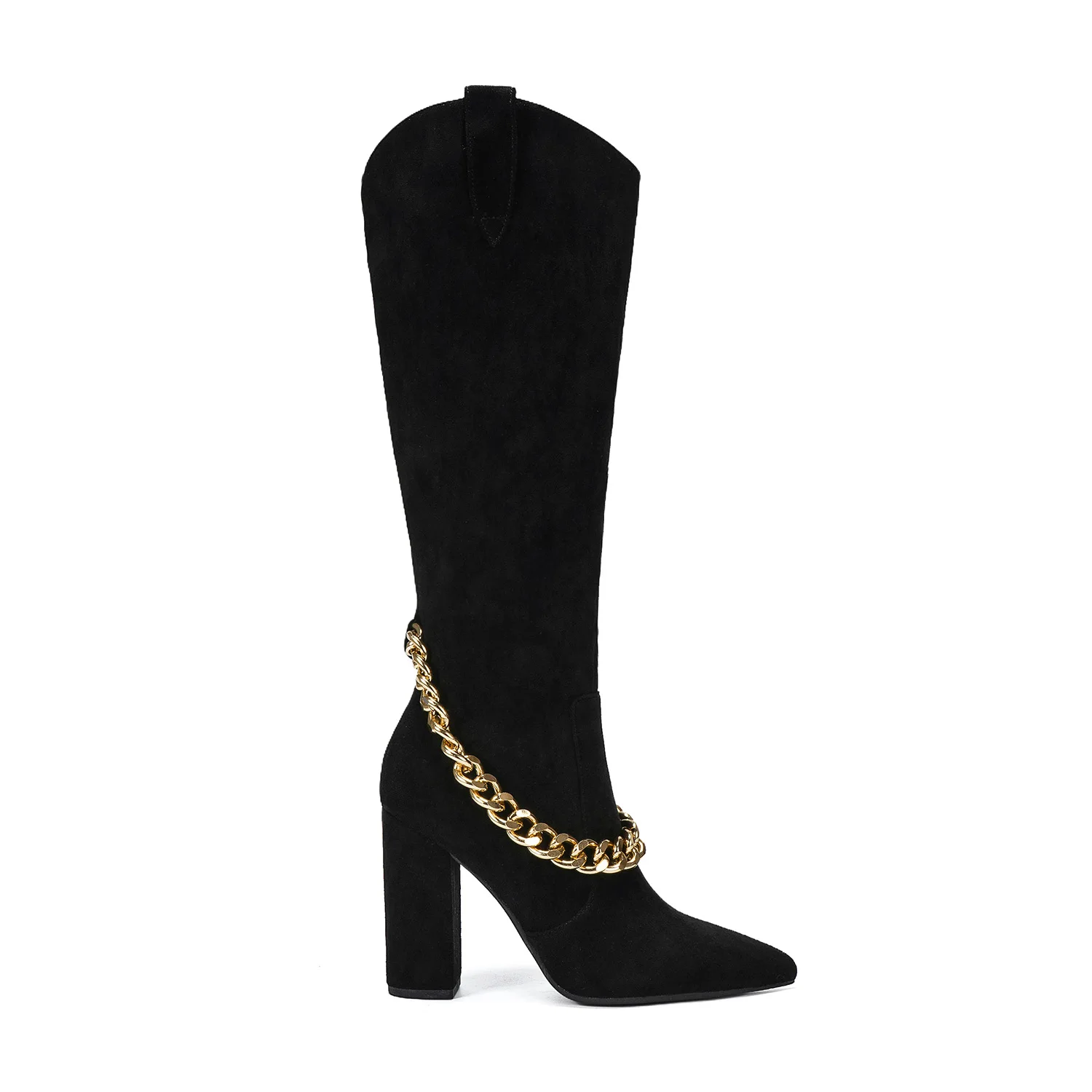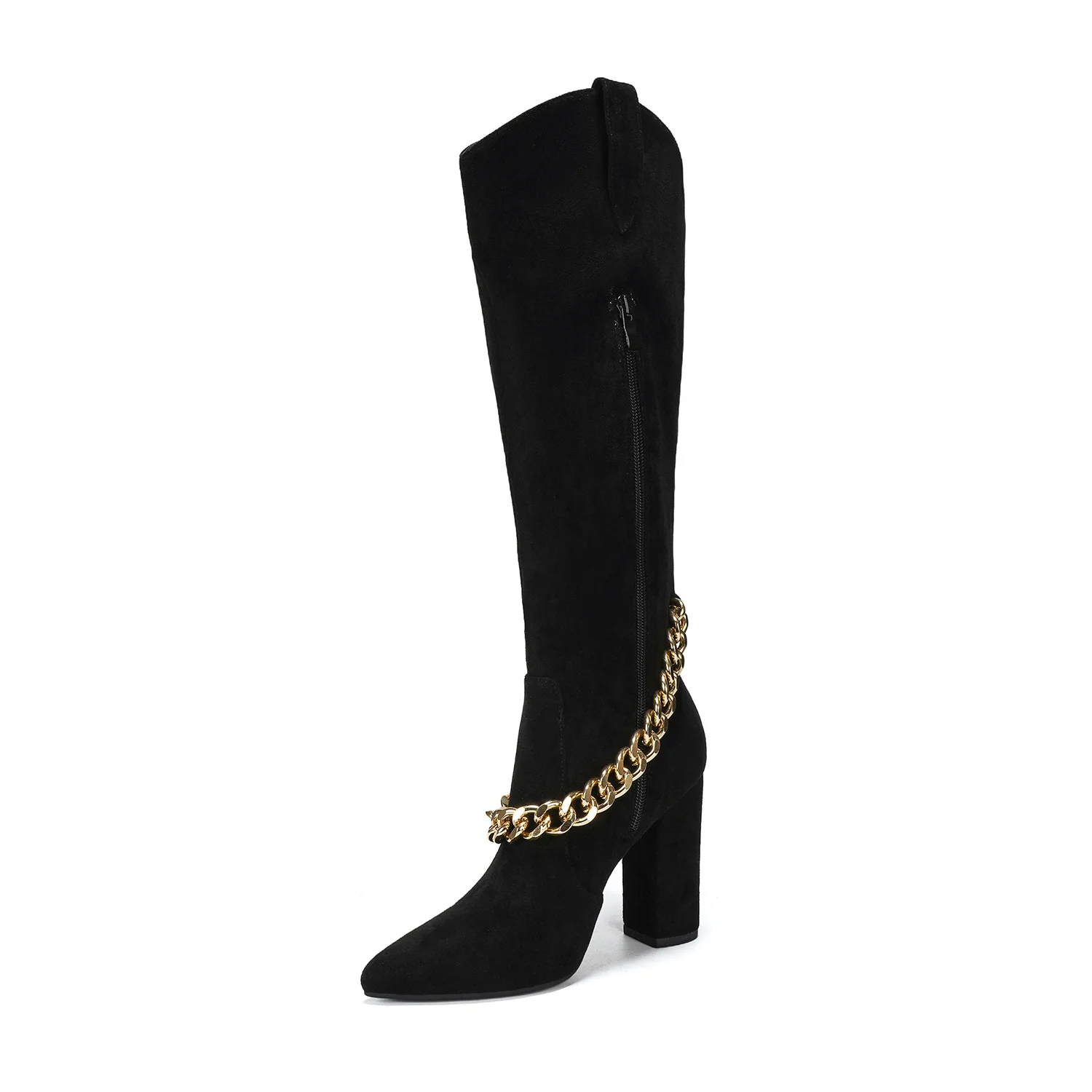 Women's Chic Suede Chain Embellished Knee-High Block Heel Boots Slip-On Comfortable Casual Party Footwear for Winter