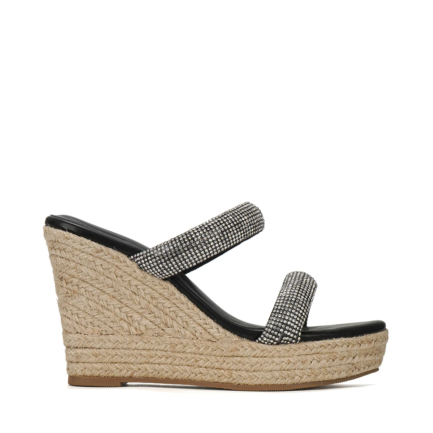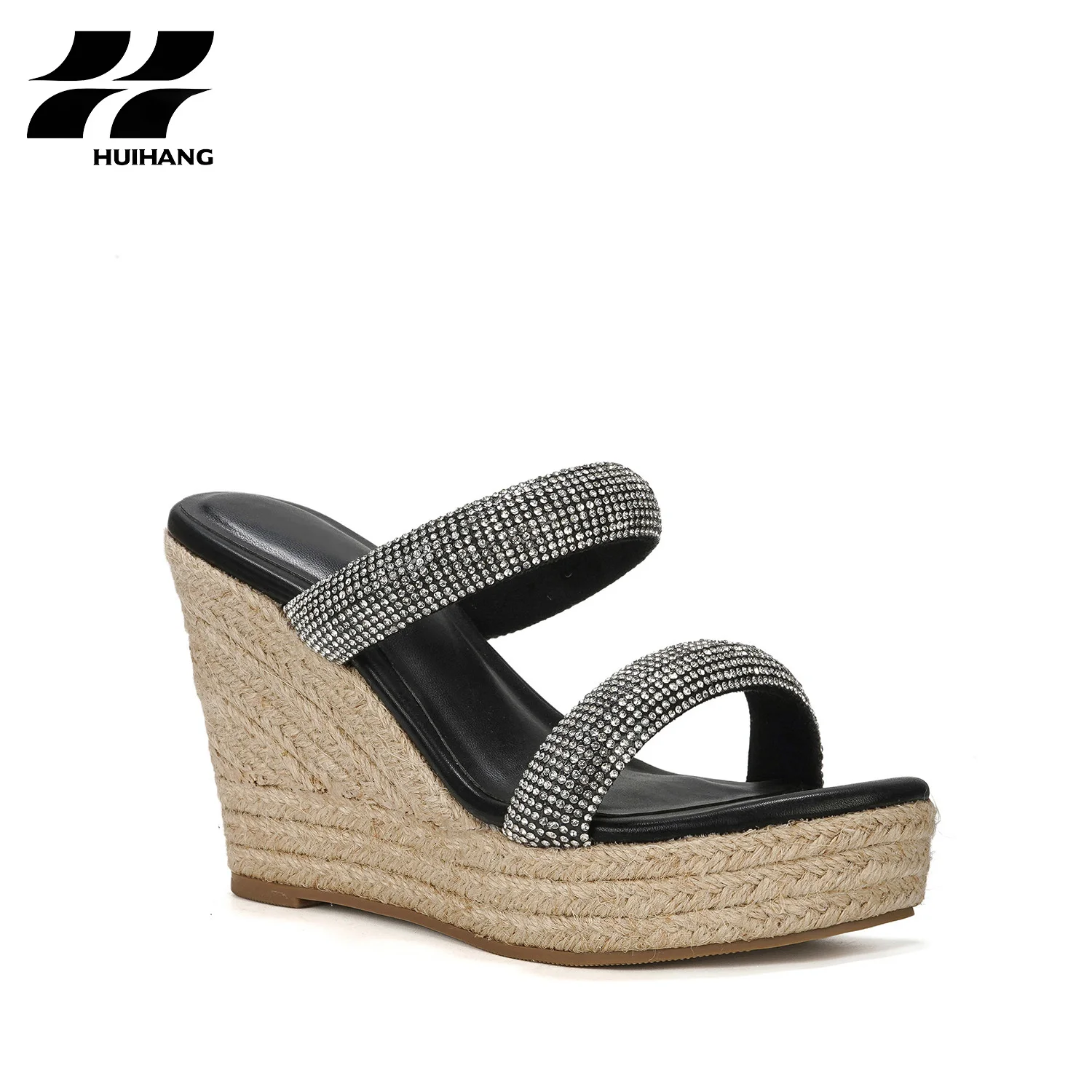Stylish Glam Rhinestone Strap Espadrille Wedge Slides Open Toe Waterproof Height Increasing Slip-On Closure for Summer Occasions
