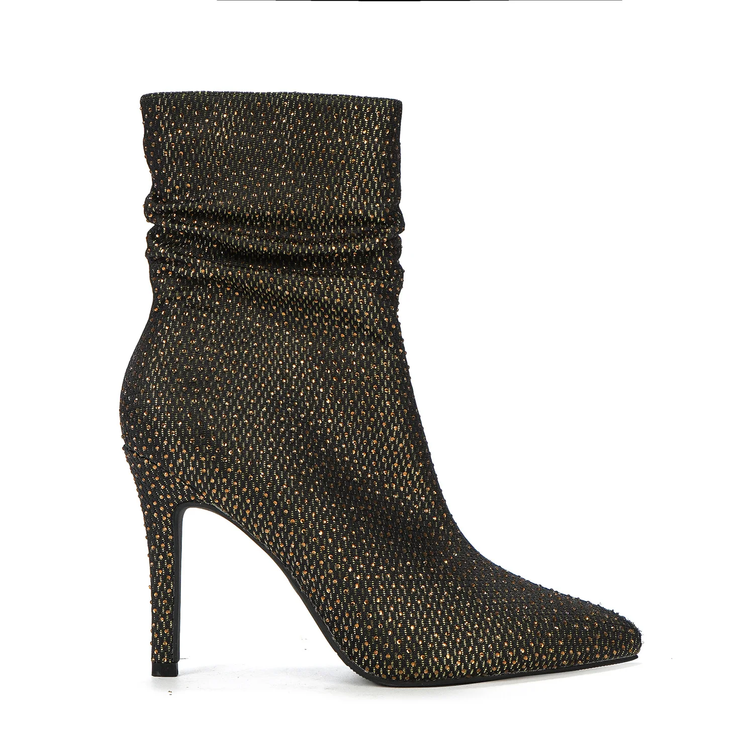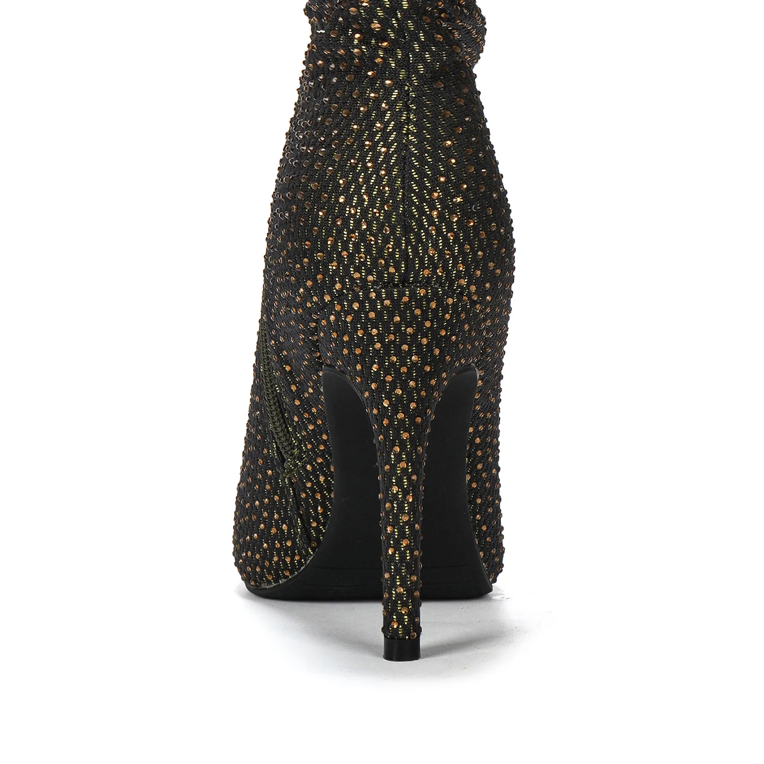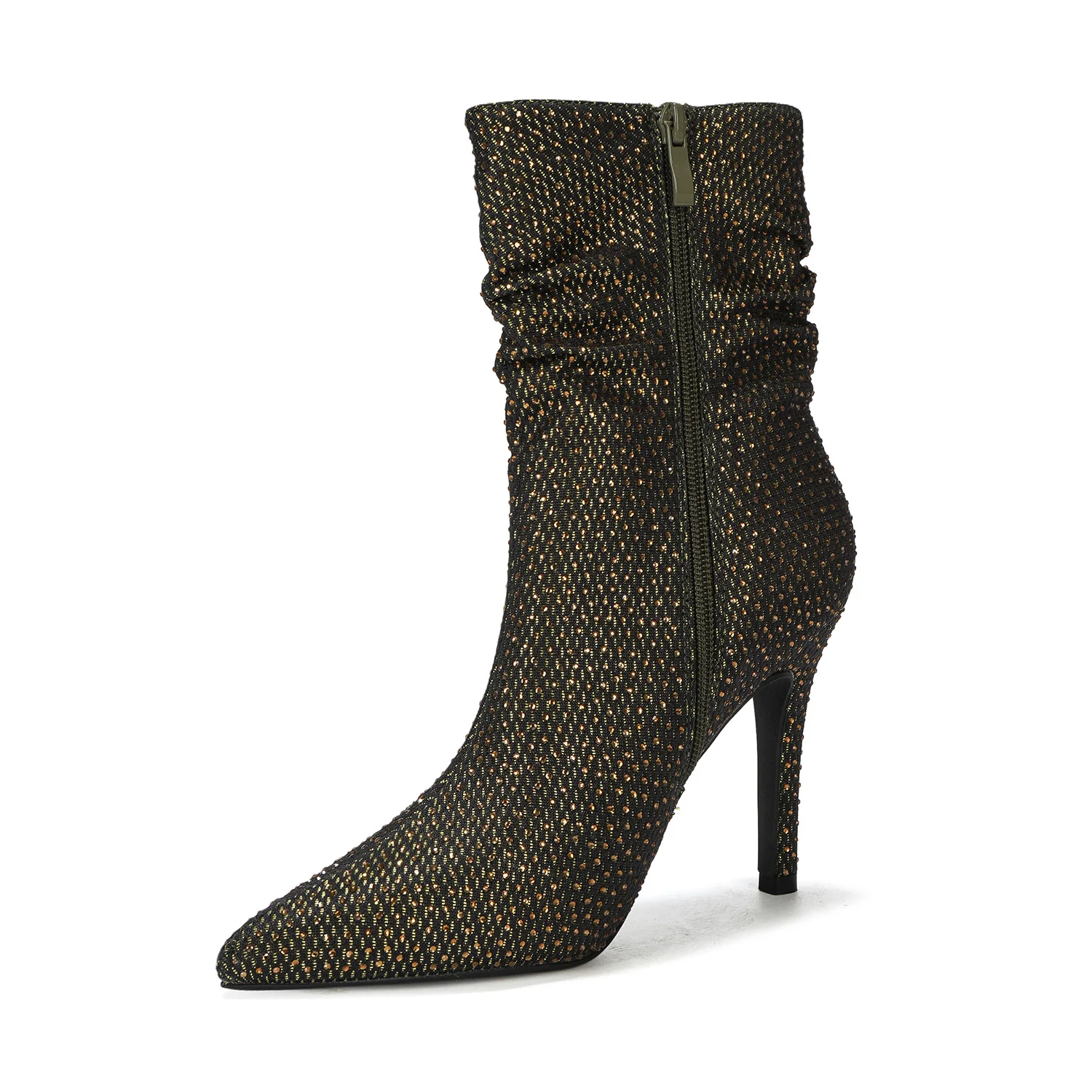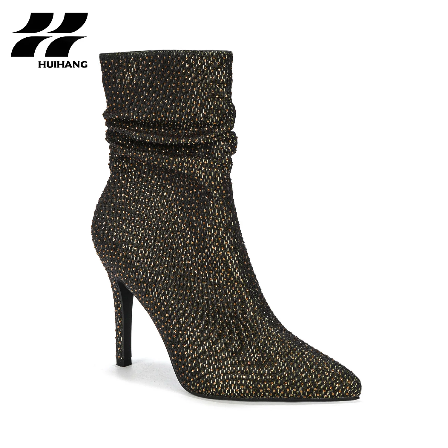 Women's Glittering High-Heel Ankle Boots Pointed Toe and Thin Heel Rhinestone Embellished Mesh for Autumn and Winter Season