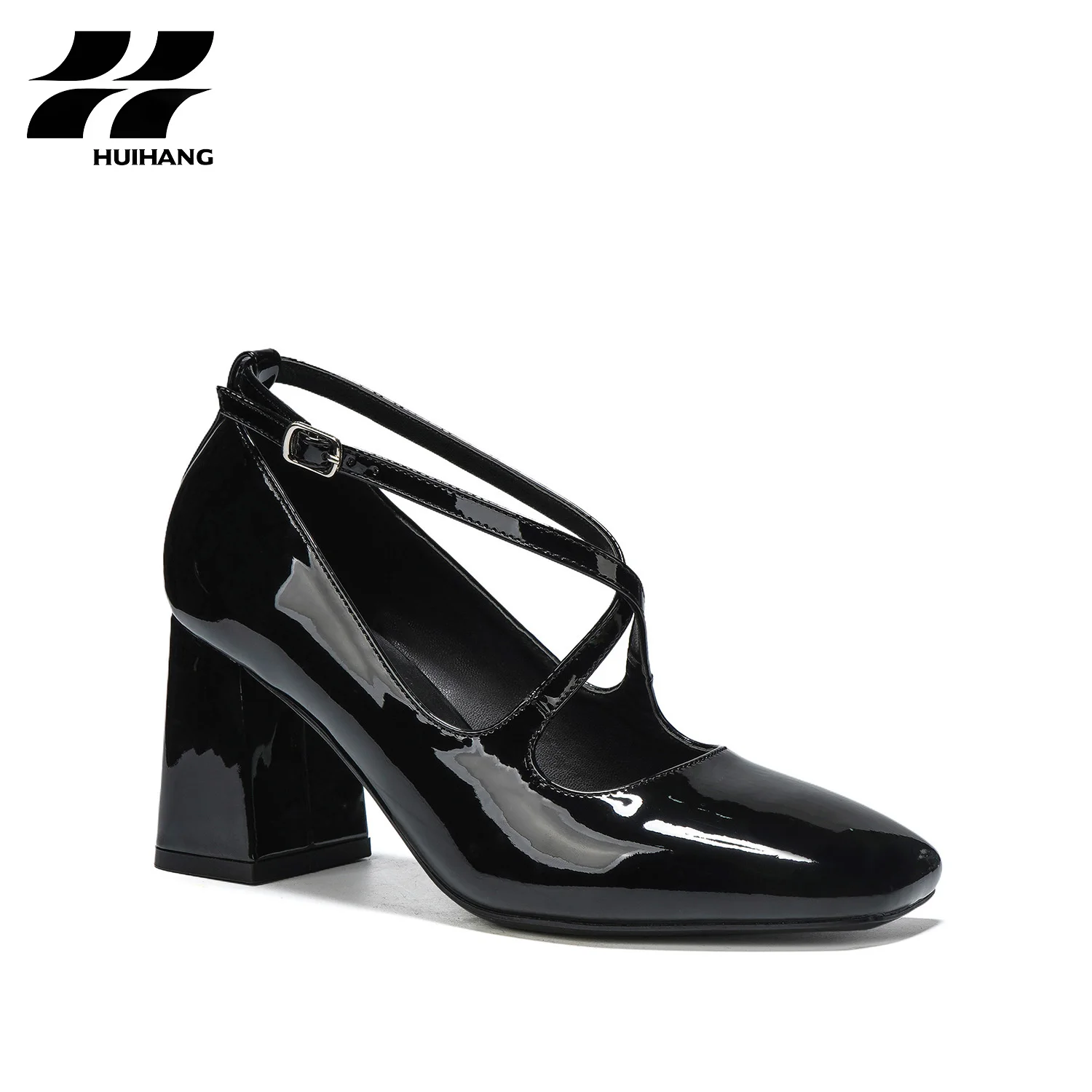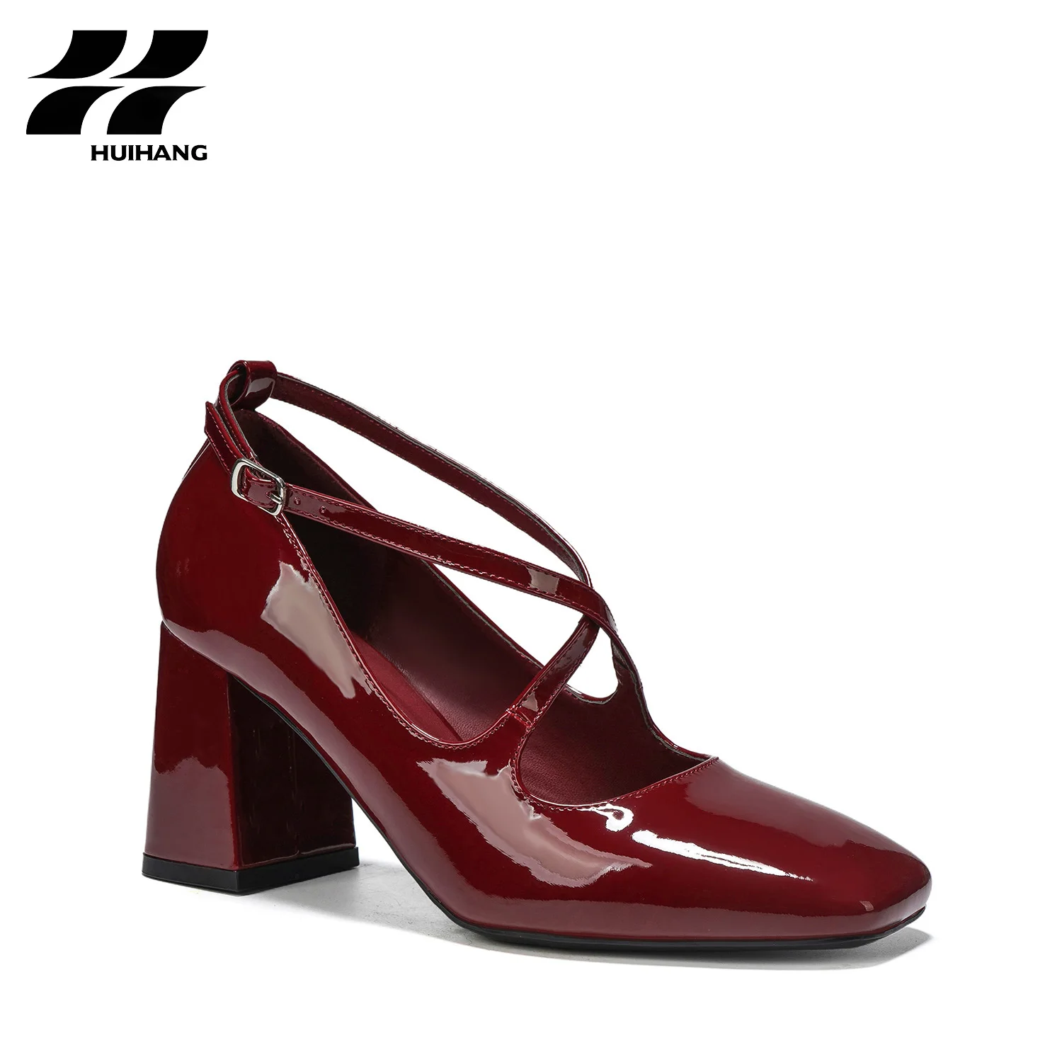 Comfortable 8cm Height Square-Heel Pumps with Ankle Straps Fashionable Solid Pattern Square Toe Design Slip-On Closure